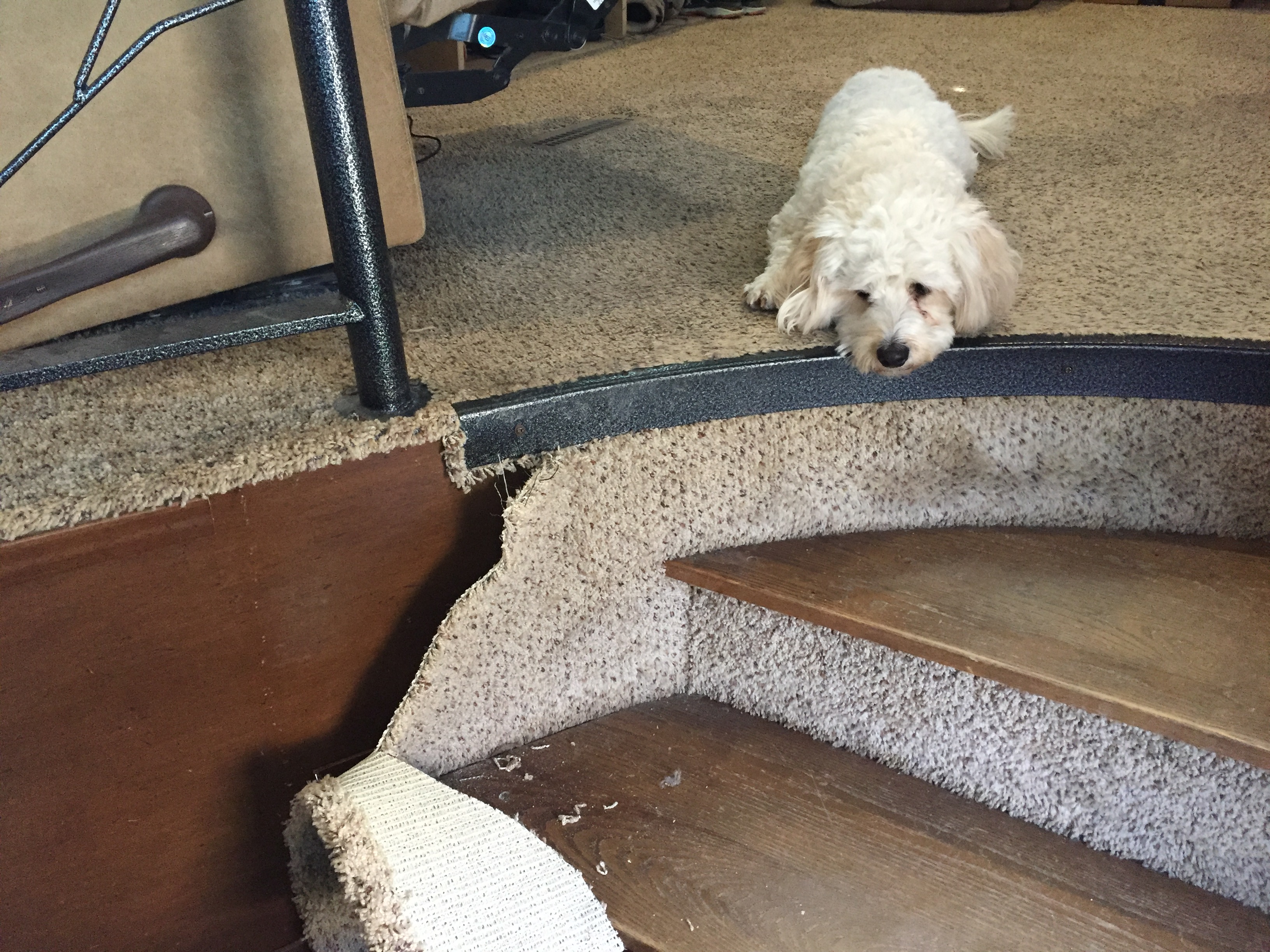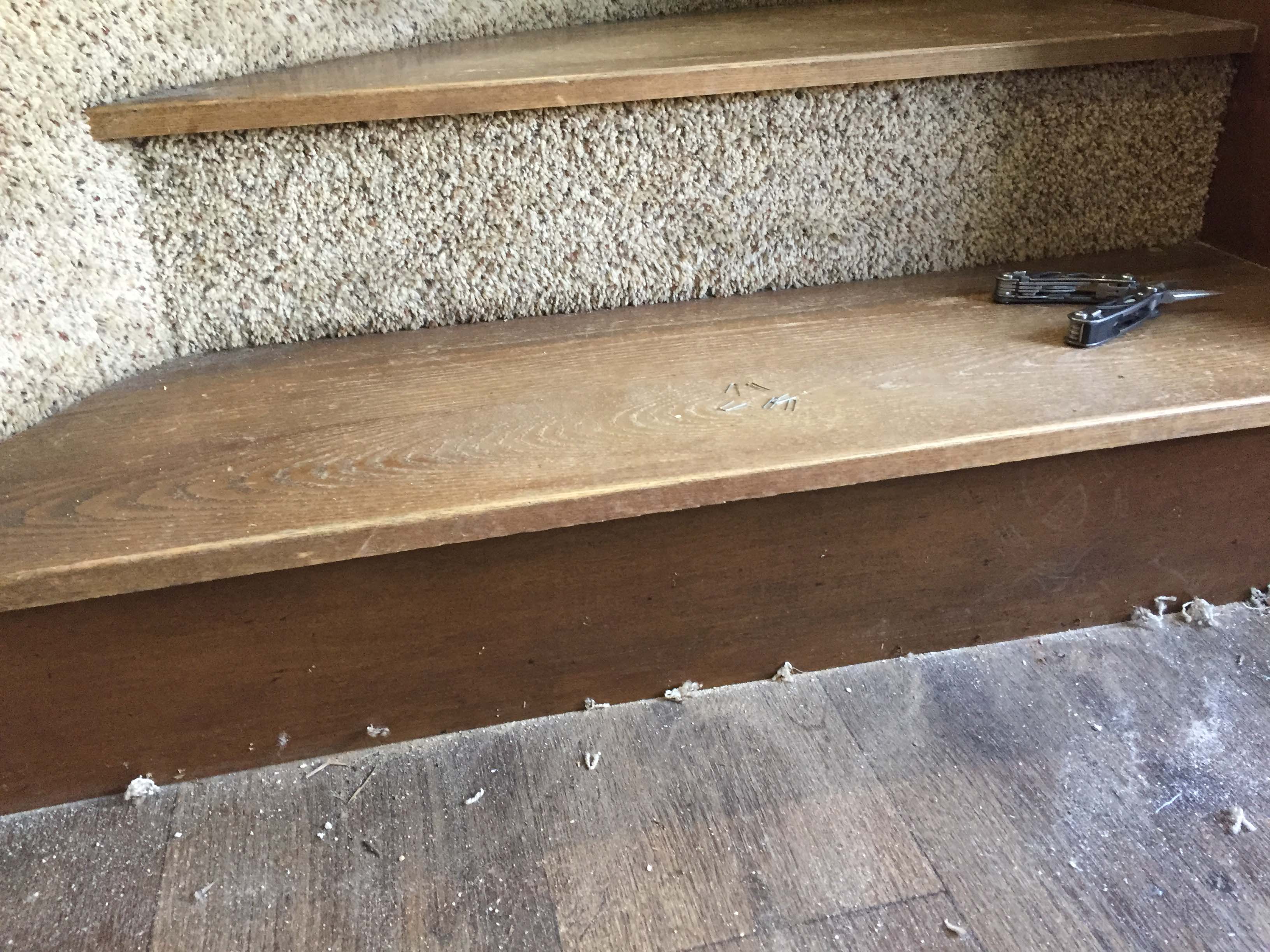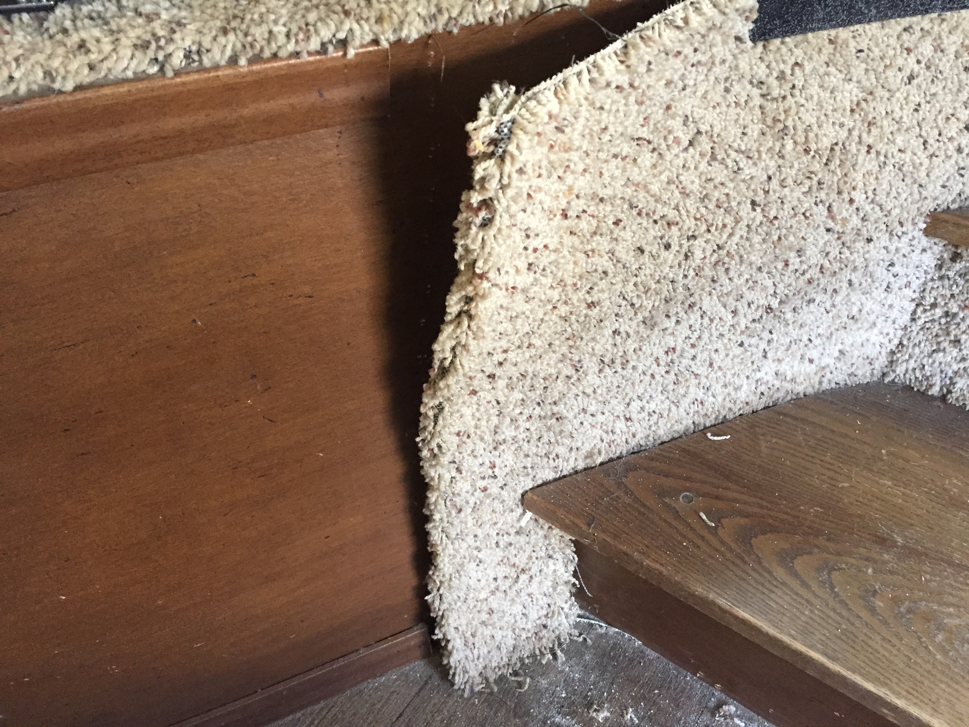 (In addition to the carpet on the facing of the stair risers, it partially went along the face of the curve. I really didn’t like that, so I decided to take it off completely. – Lee)