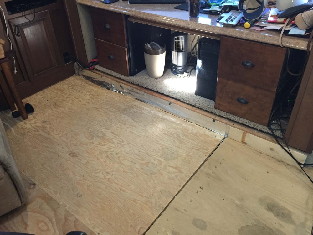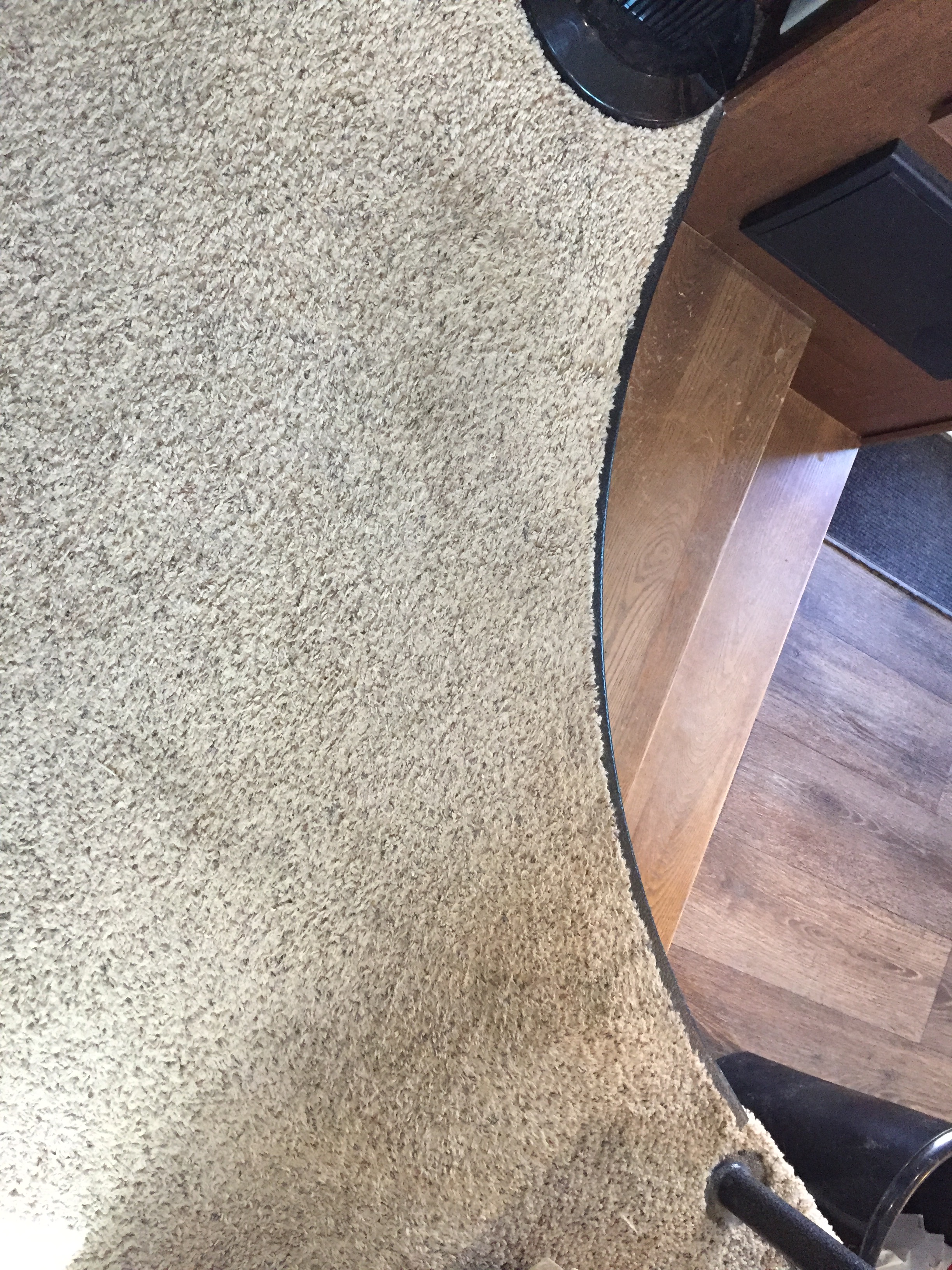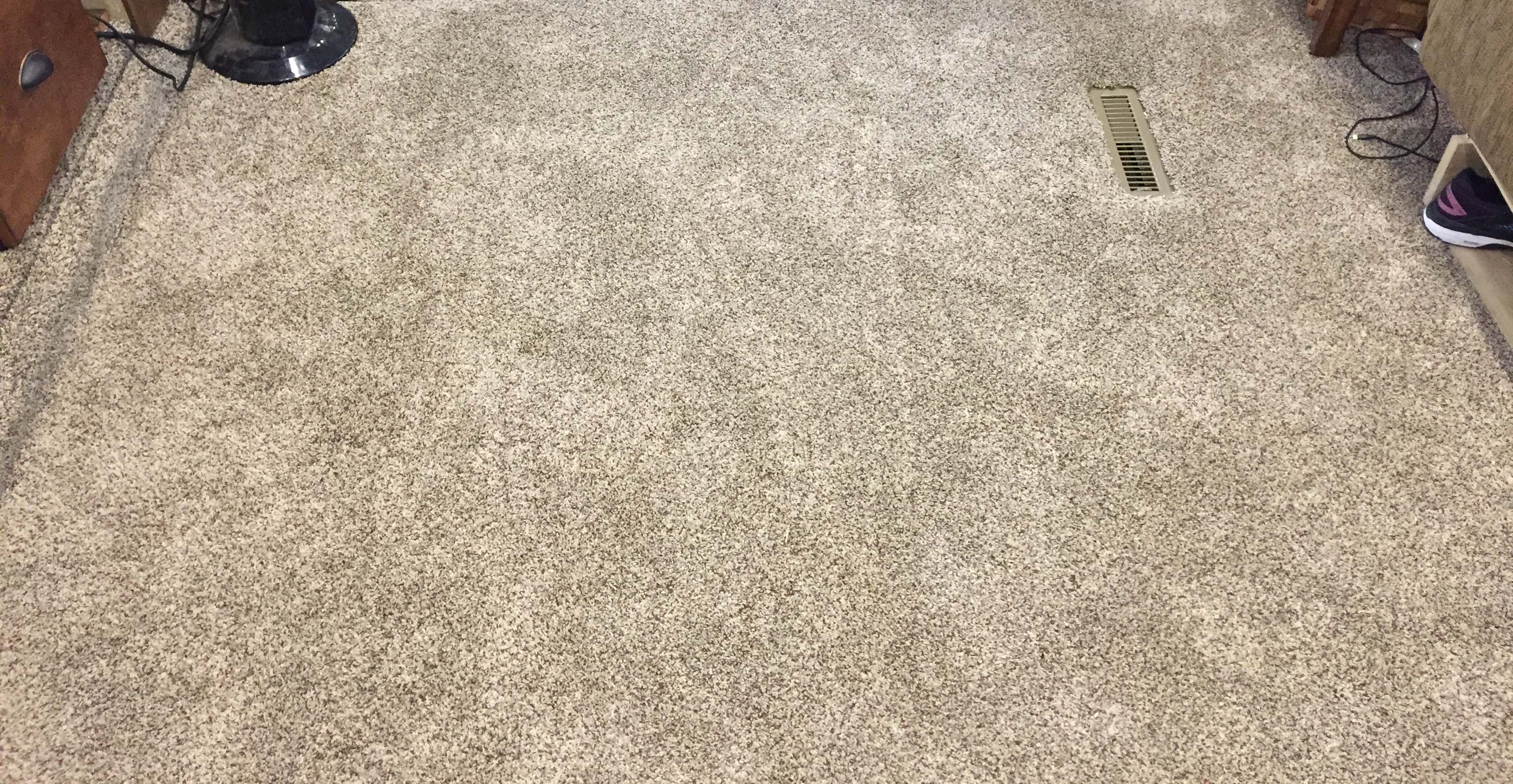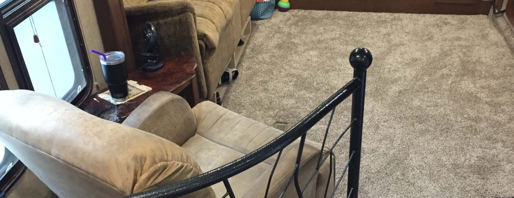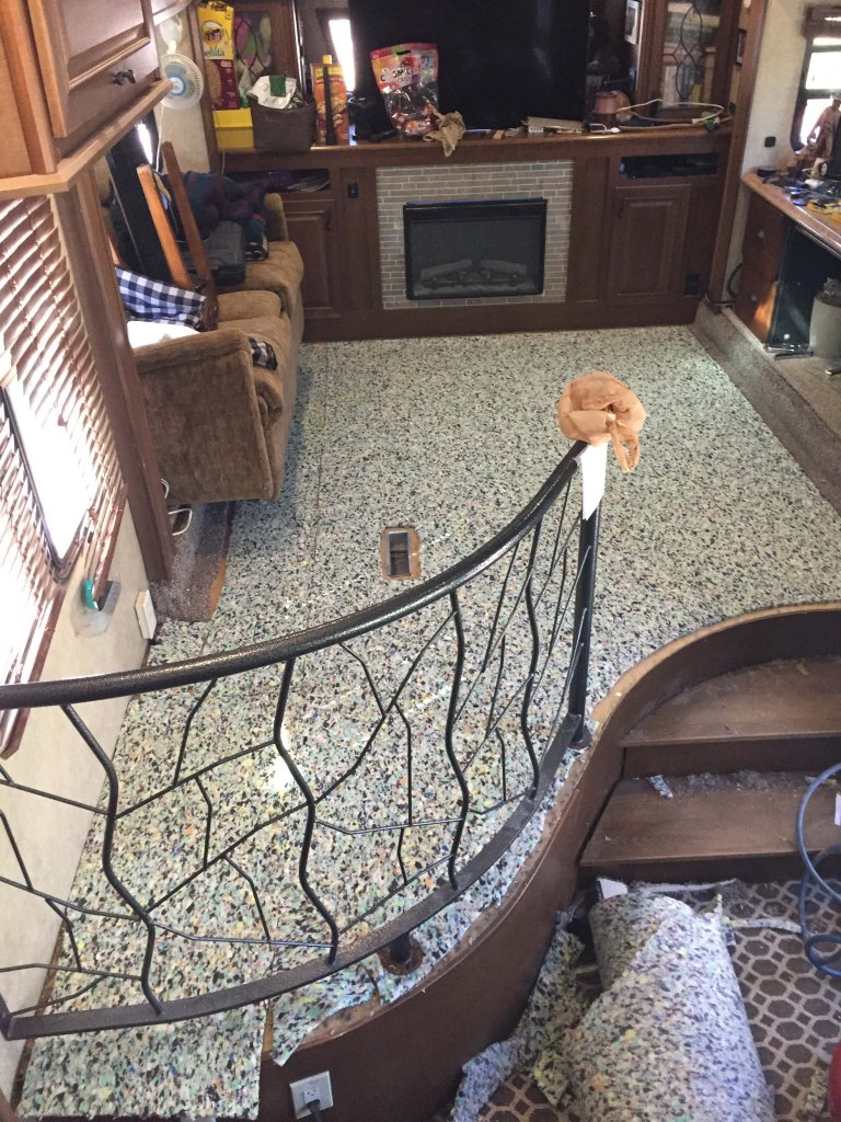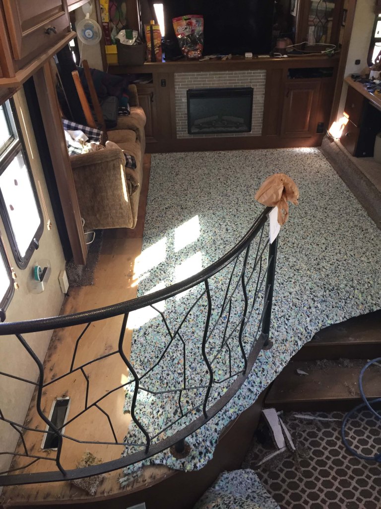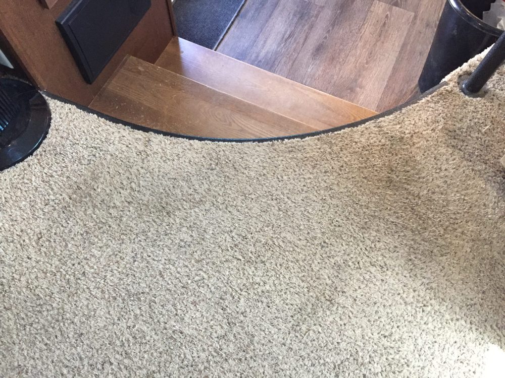 (Not quite ALL done. I still need to do the slide with the desk, and figure out the stair storage. But having 1/2″ padding and a much deeper pile makes for very nice and comfy carpet. More like a house than an RV. – Lee)