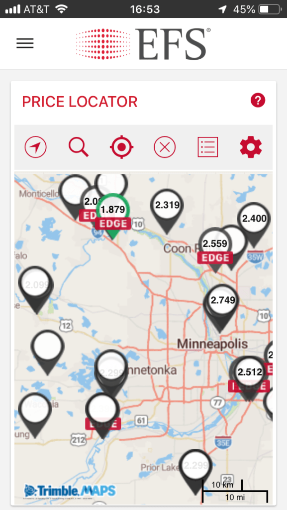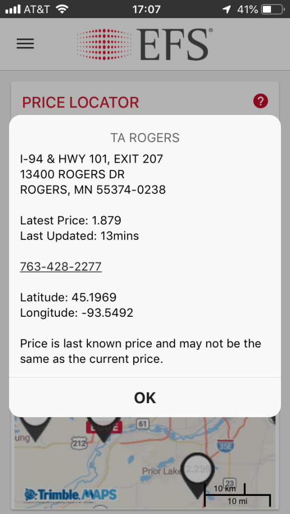 Once you’ve got your shiny new EFS card, you’ll want to get the app. That’s very important, because you will want to use it to see what the prices are like, especially if you are going to be fueling near a city. TSD gets different discounts not just for each brand, but for each location, so the price can vary a LOT from truck stop to truck stop, especially around a city. On the open road it will be less so, but you still want to know what your options are. The app is not required. You will still get whatever discount is available if you use the card at a participating location, but you’re flying blind without the app and in some cases you will pay more than you need to, so I highly recommend the app.