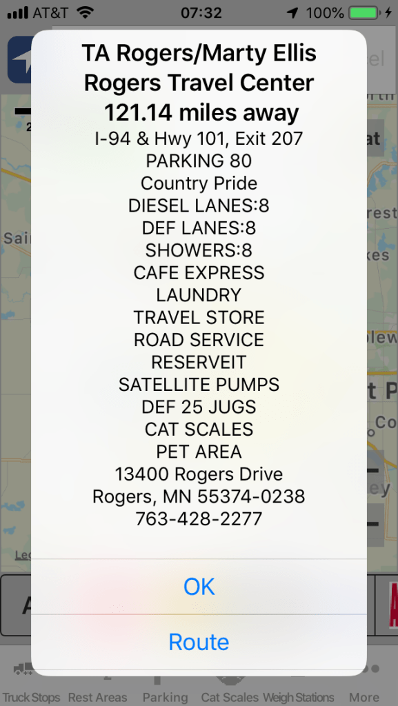 I don’t know why, but they choose not to include other useful stuff. Here’s a screen shot of the same truck stop in the Truck Stops Pro app. As you can see, it tells me the same info, but also tells me the distance, how many parking spaces there are, how many lanes, how many DEF lanes, LOTS of useful info. And I can click “ROUTE” and it will dump the address into my maps app to take me there. ALL of this should be in the TSD app, in my opinion.