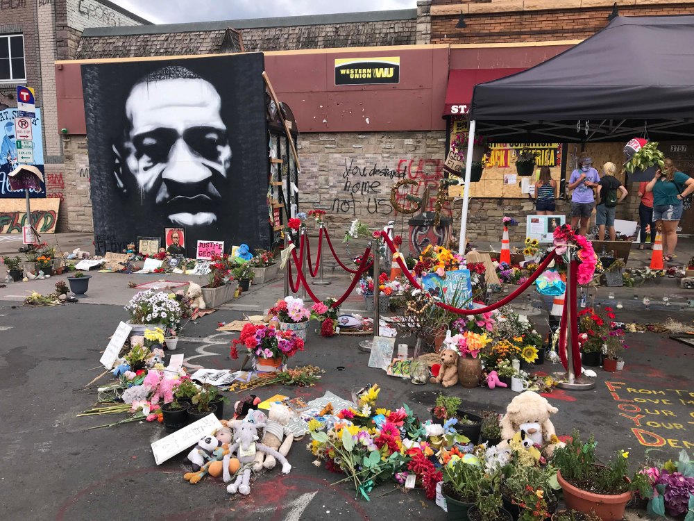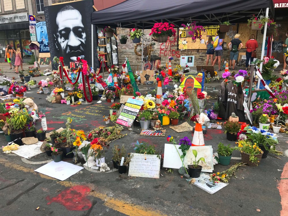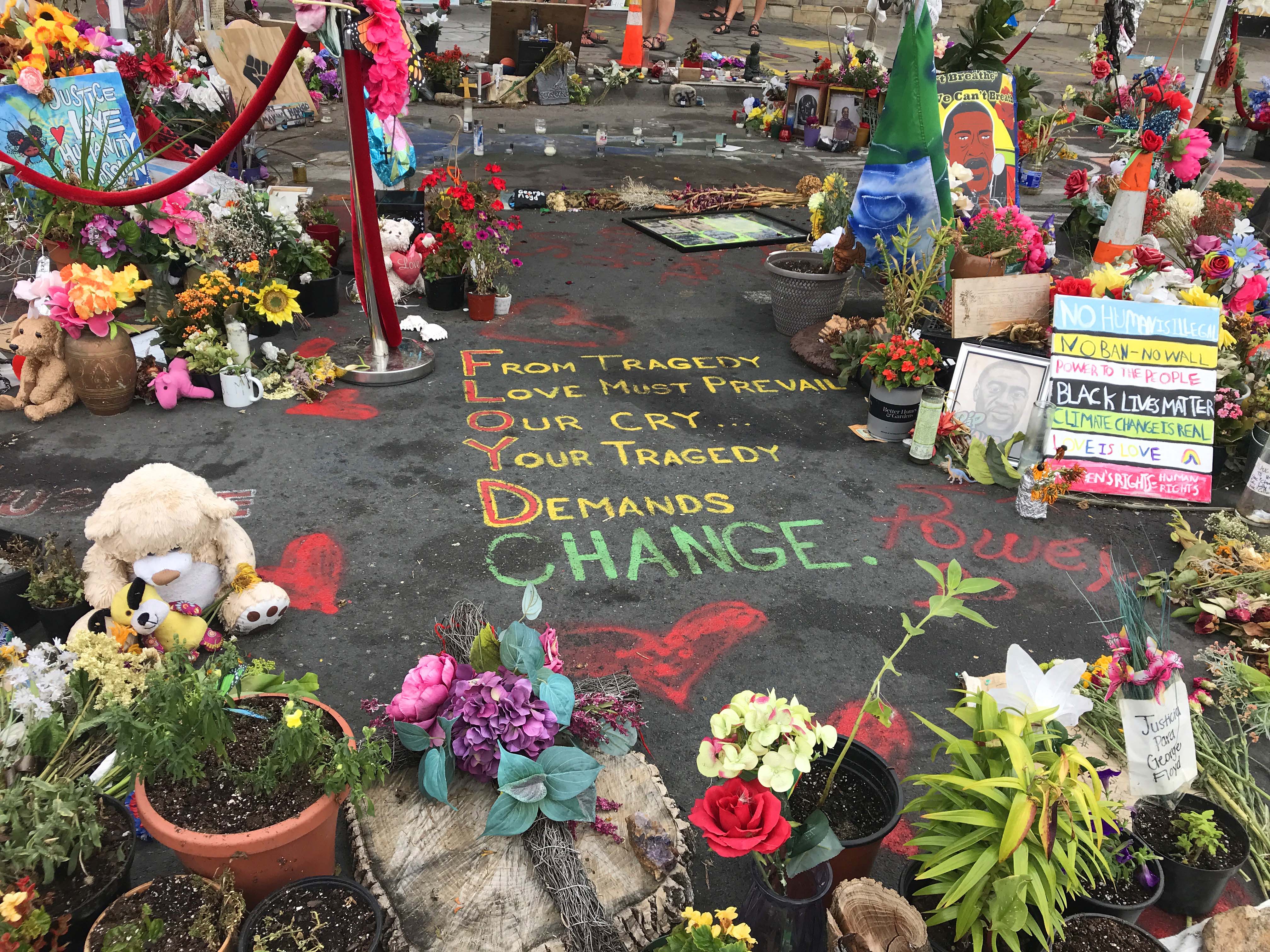 I wanted to start by stating this is not a political post.  Many of us have strong feelings about what happened, but my intent here is to show you the memorial and talk about how it impacted me.  A few weeks ago my daughter was affected by what happened because she lives a few blocks away from the police station that was burned and closed.  She and her partner Adrian stayed up all night to guard their home on more than one occasion, and they participated in some of the protests.  Needless to say I was extremely concerned while all of that was happening for her safety and I wanted to see for myself, where it had happened.