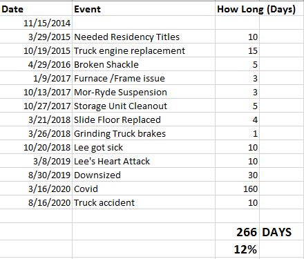 Based on these two slices of the data I think it is a fair projection that at least 10% of our time will be taken up by these types of incidents. Certainly some of these would happen whatever lifestyle we were living, but I cannot stress enough how extra complicated those things can be when you are traveling. I would love to say that there are great technicians, auto mechanics, and doctors everywhere, but that has not been our experience.