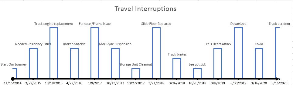 If you read our last post, you know that once again our travel plans were interrupted, which got me thinking about whether travel interruptions are actually part of the full time pattern rather than anomalies. When we first went on the road six years ago, we knew the occasional interruption would happen, but neither of us had any idea how frequently that would happen. There is a common phrase in the FT world, “Our plans are written in mud,” which we use in these cases, but again we always thought that these interruptions were the exception rather than the rule. Since I am a process analyst by profession, I thought I would take a moment and look at our history to see if that is actually true. “Special cause variation”, as we call it in my field, ceases to special cause when there are enough instances that it is part of the norm. Let’s take a minute and look back and find out. (YAY! Science! Math – Lee)