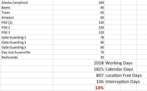 As you can see from above we worked in fixed locations 1018 days over the course of 5 years. This meant that 56% of the time we were in one place for work. Obviously we were in fixed locations for longer than that, but for the purposes of this lets just talk about the work stays. That left 807 location free days. Removing COVID from the equation in that five year period we had 106 interruption days which was roughly 13%. Pretty close to to the 12 % above.