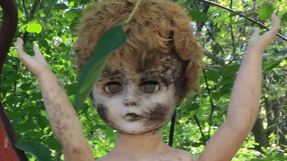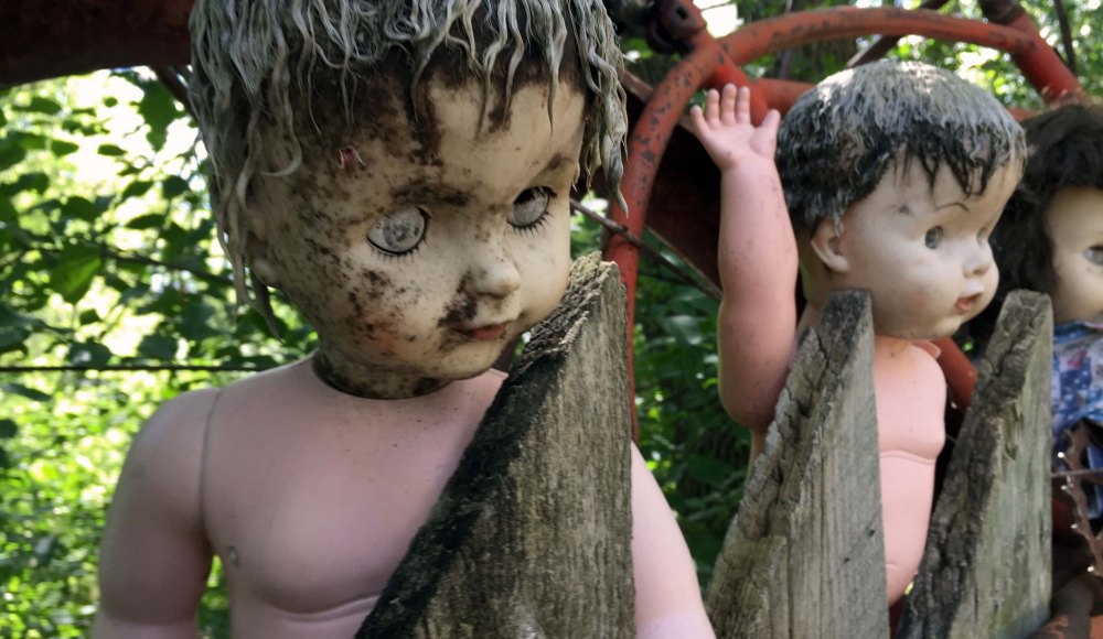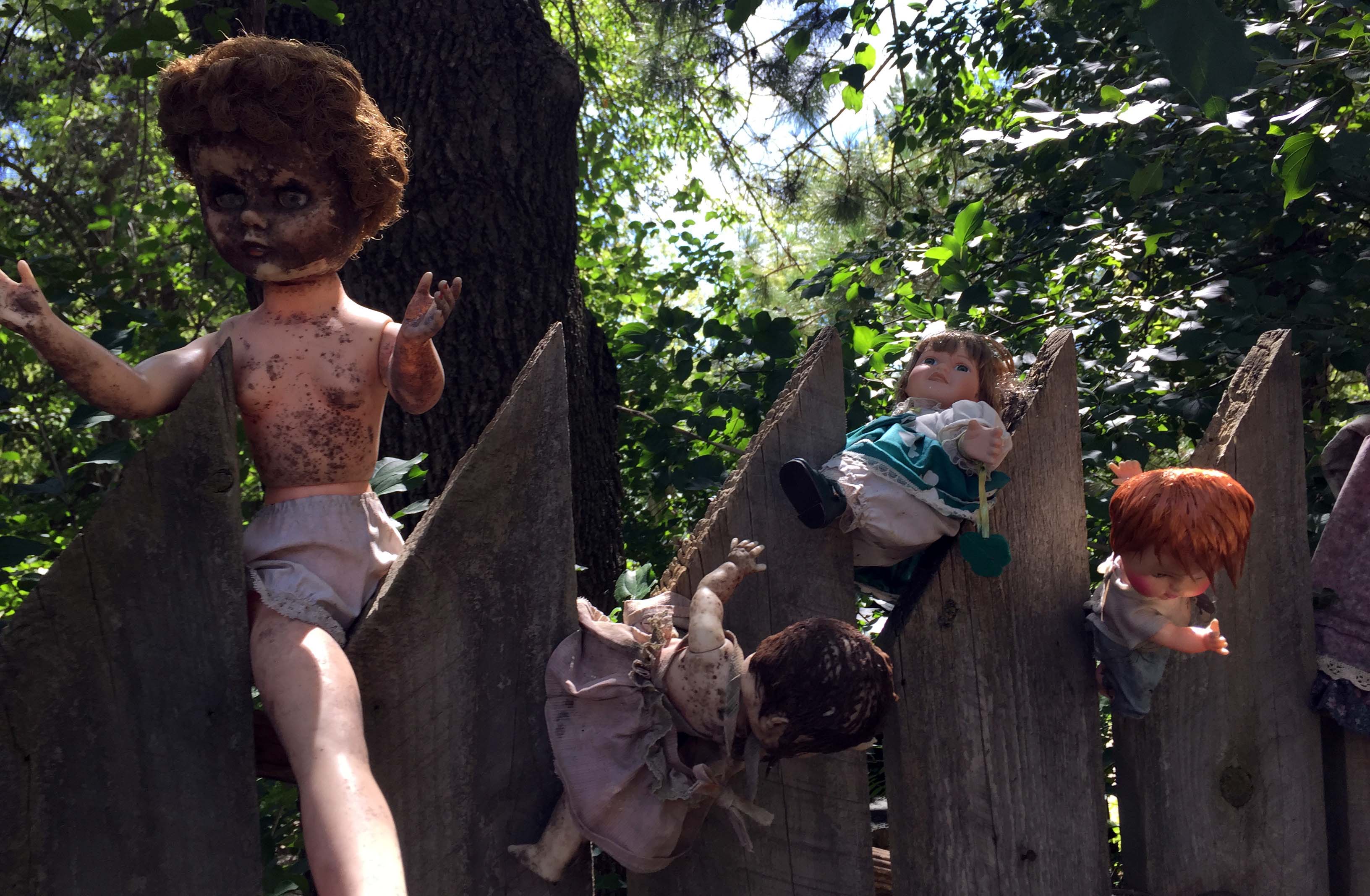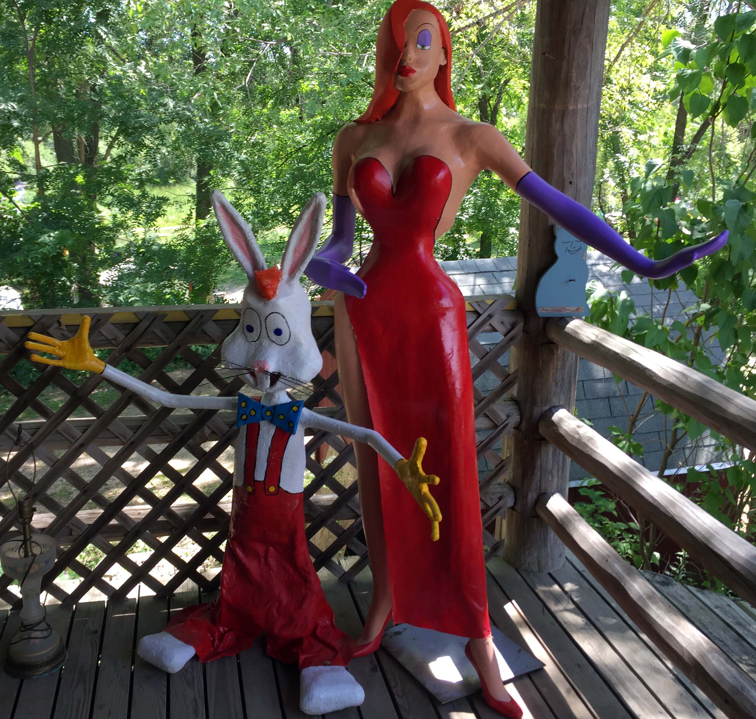 Creepy Roger Rabbit and Jessica figures on the porch of the main building, which is a log cabin.