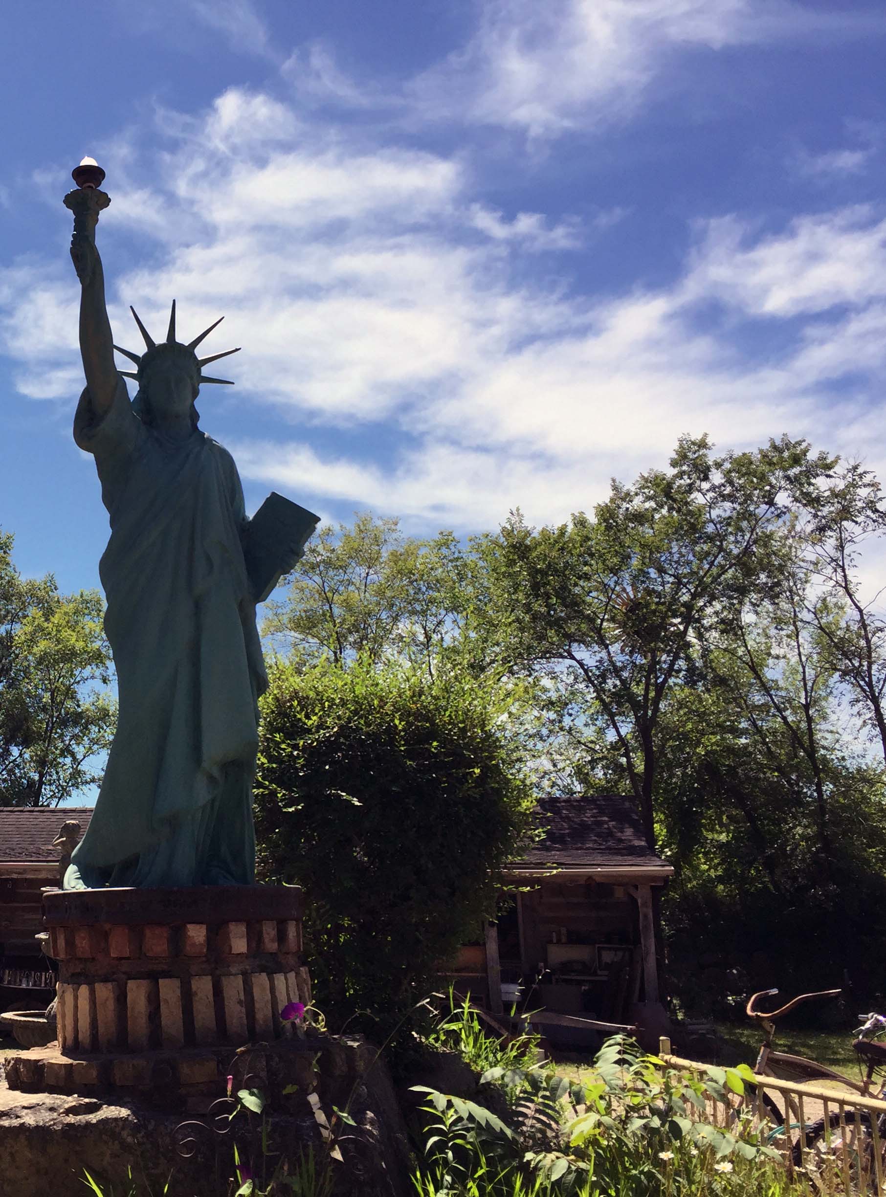 Lady Liberty overlooks the parking lot.
