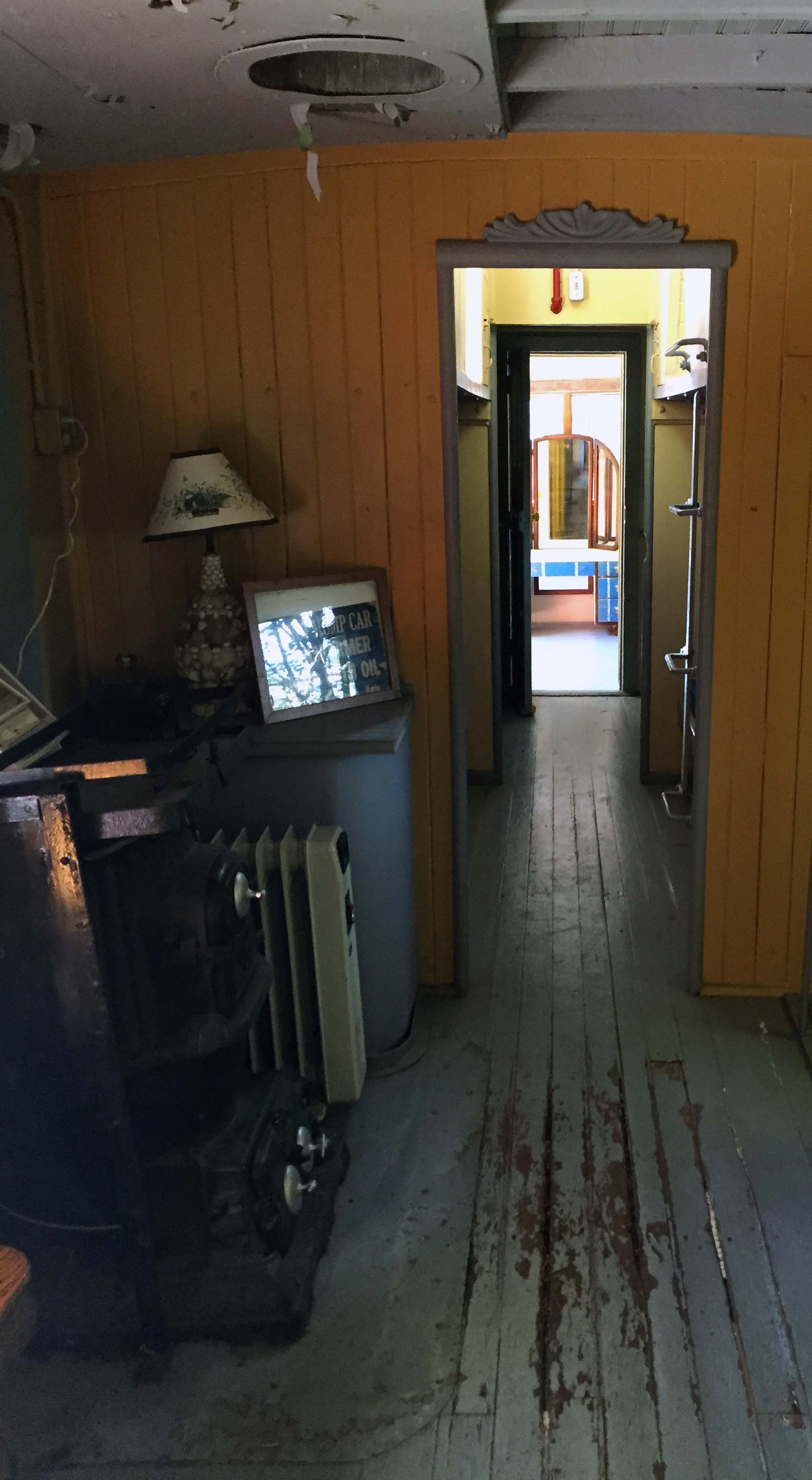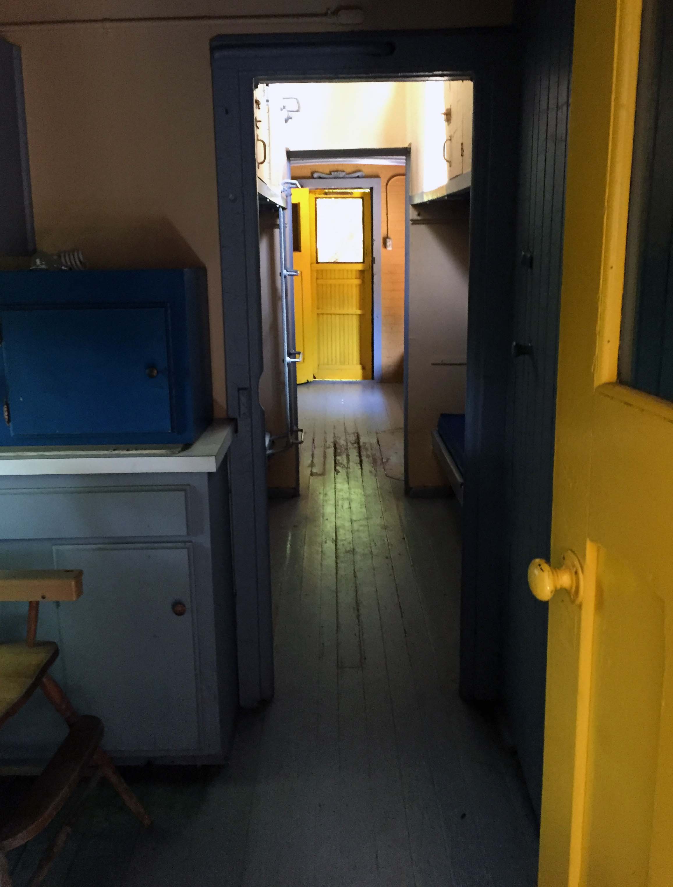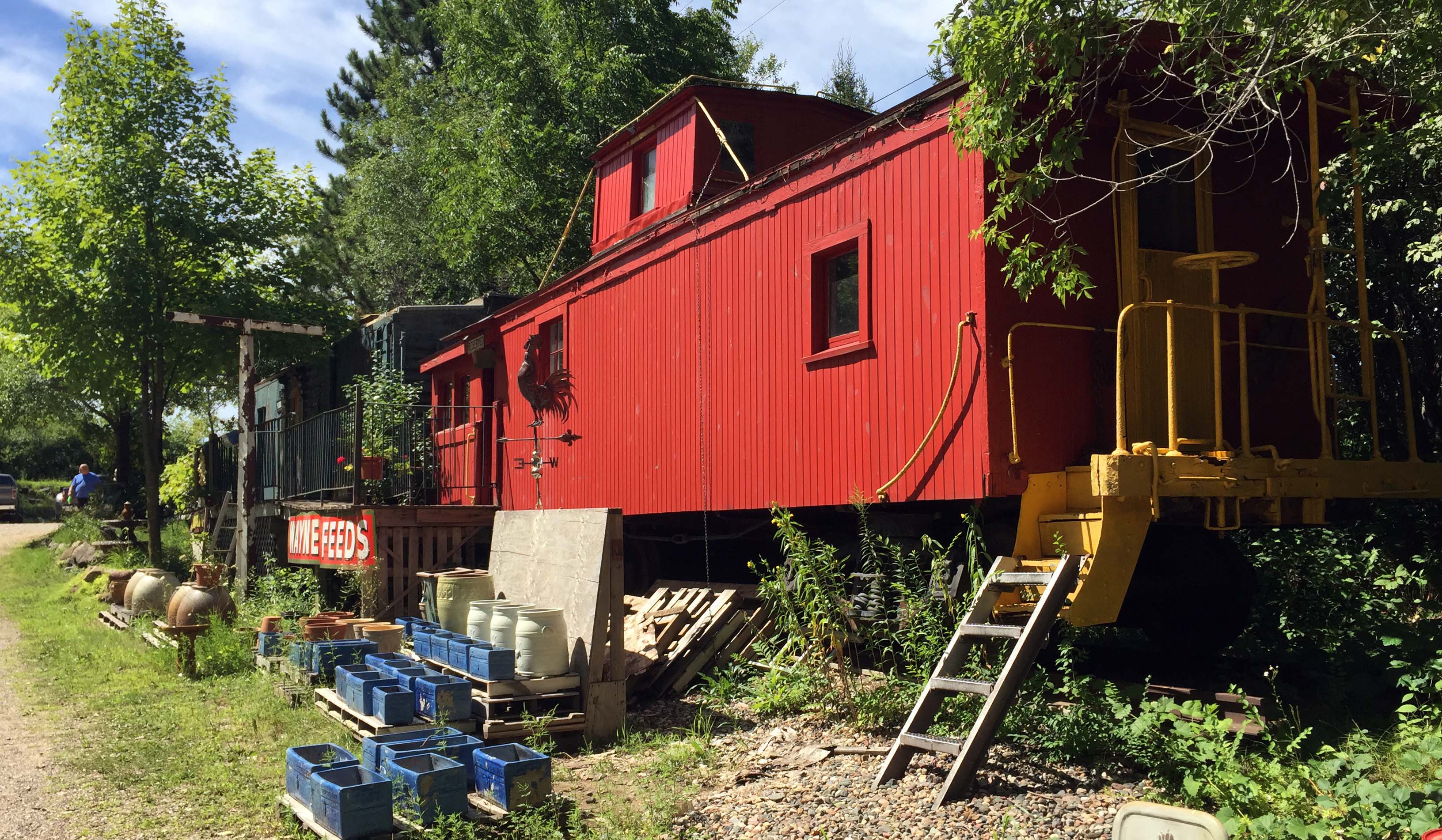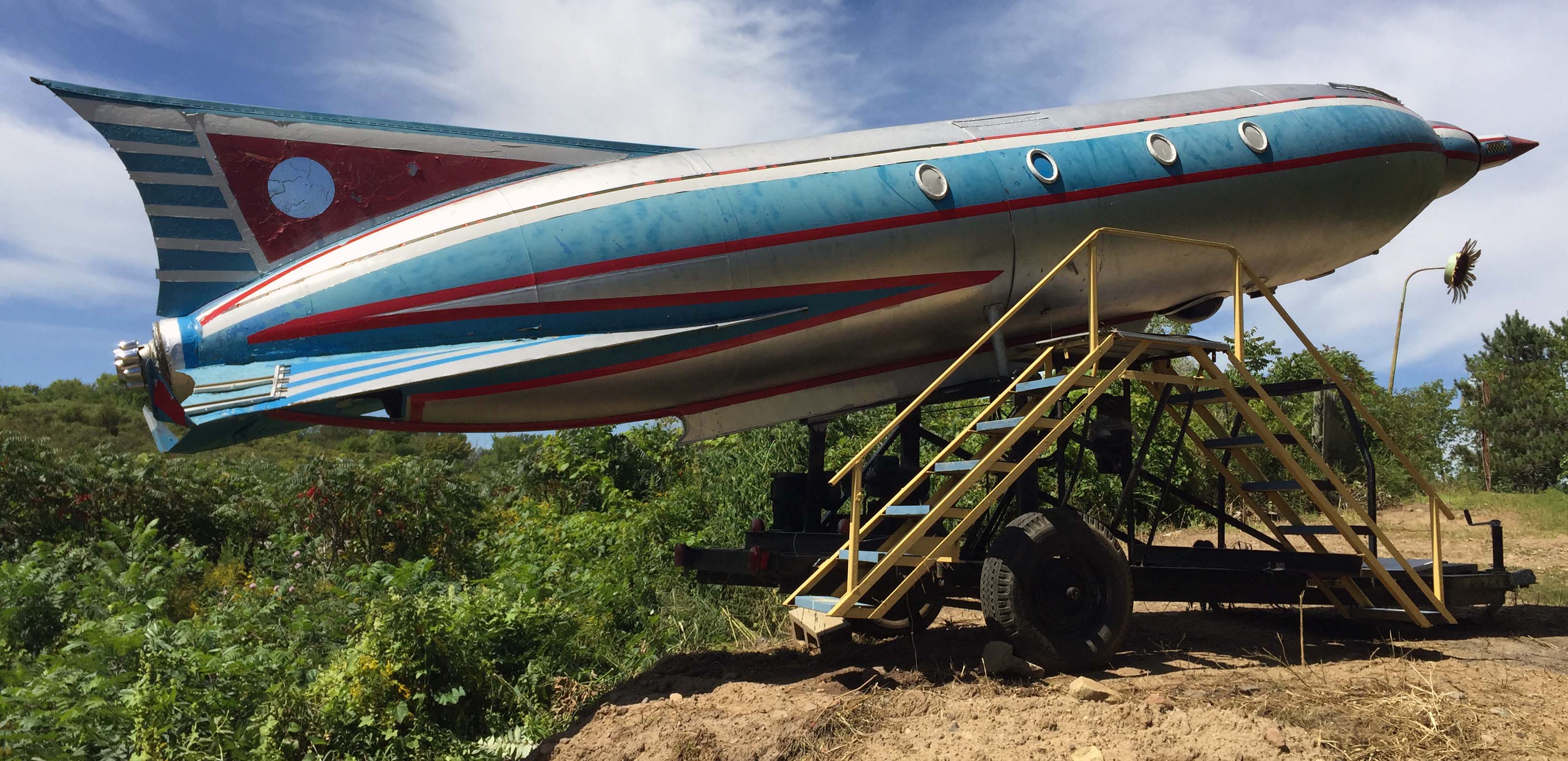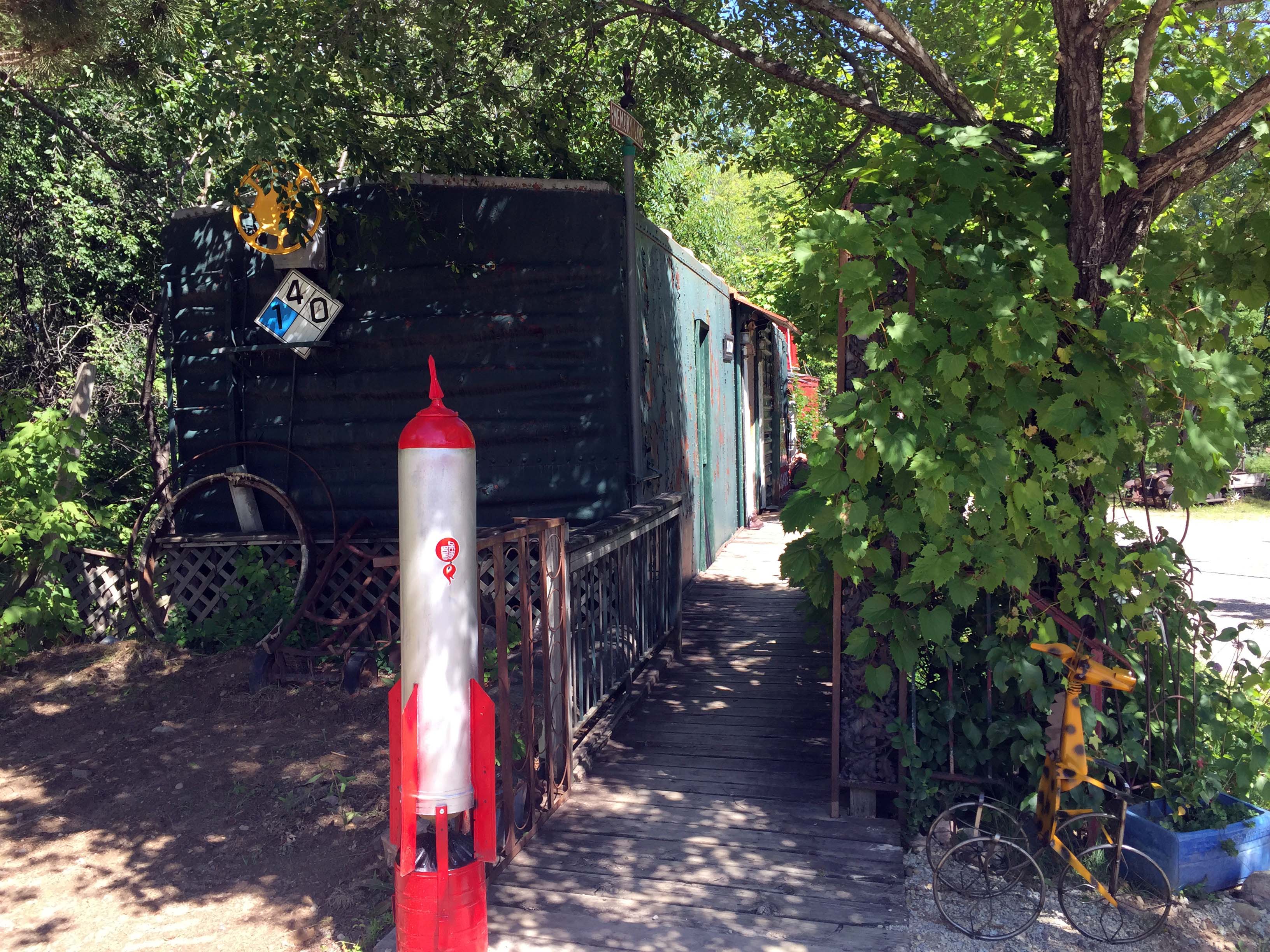 Walkway to the train car that serves as an art studio. With a rocket, because, why not??