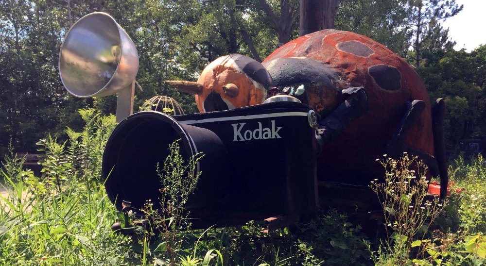 There are quite a few great stories online about this place, but I think the pictures tell it all! I happily spent a few hours there and met with the owner and the resident sculpture artist, and just had a great time. There isn’t room to park an RV there, but there IS a restaurant just across the street with ample parking, so if you grab some lunch there I bet they wouldn’t mind if you left your rig there while you spent some time at Hot Sam’s. In the picture below you can see Hot Sam’s is just off Interstate 35, and just across the street from the Red Fox Tavern. This is what the entrance looks like, so it’s not hard to find at all. Right when you pull in you are greeted by the “shutter bug”, a massive (like bigger than a car) sculpture.     From that point I decided to drive all the way in and park and then walk back down to the entrance because there was just so much to take pictures of and I didn’t want to block the road.