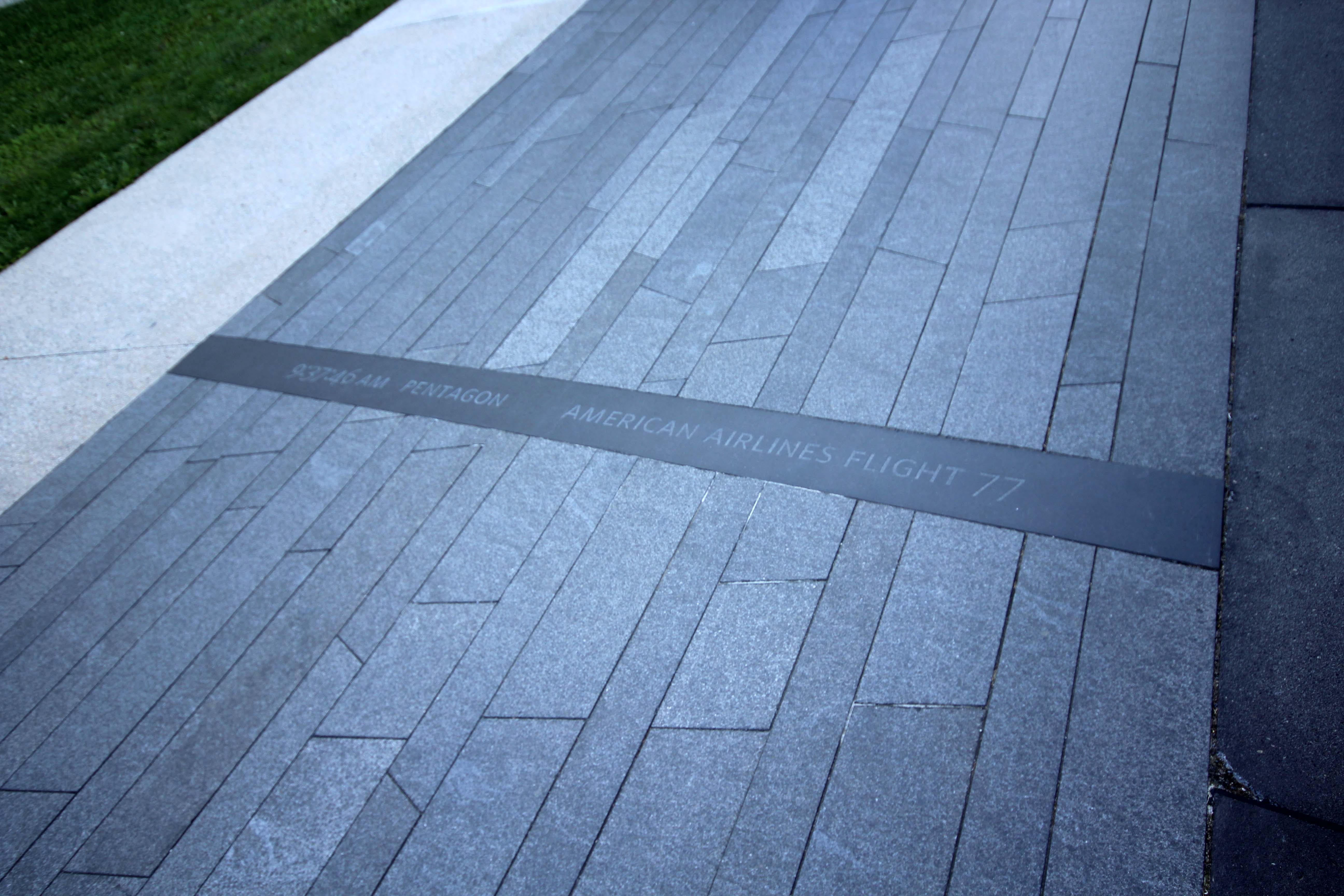 The end of the walkway. The flight path continues to a wall of names in the field and eventually to a boulder that marks the point of impact.