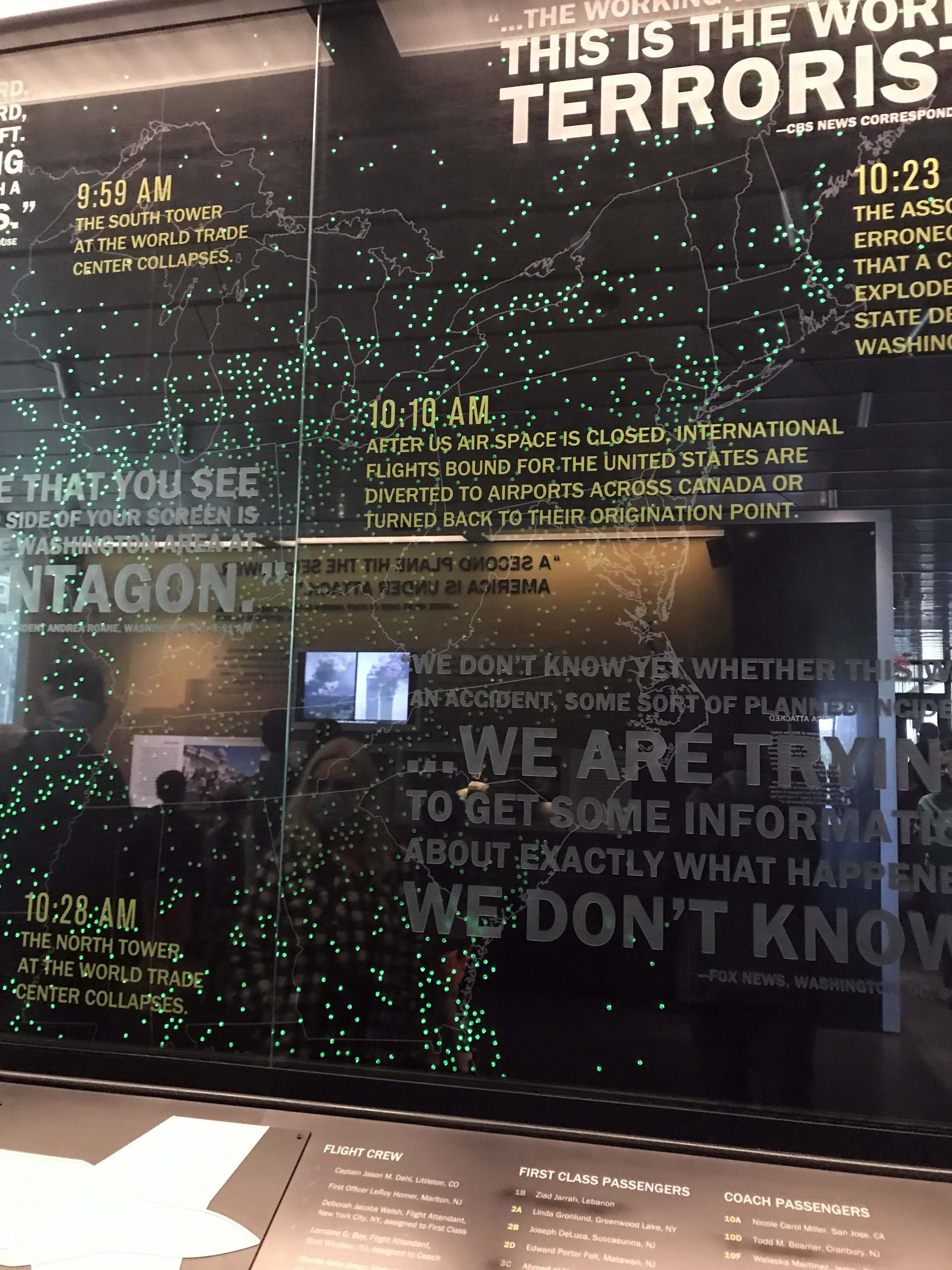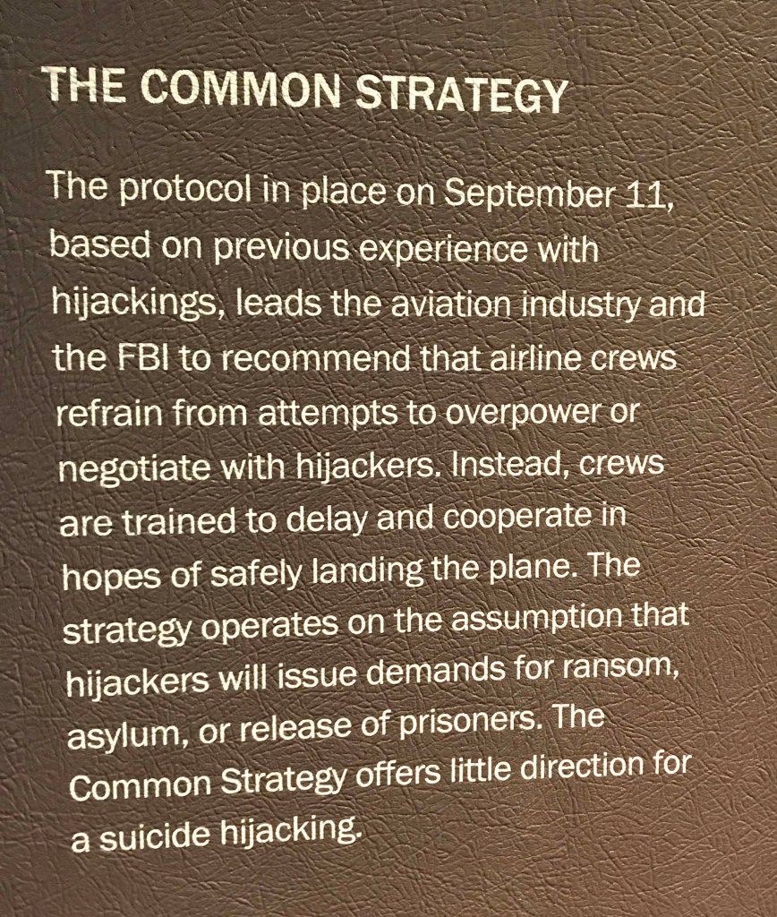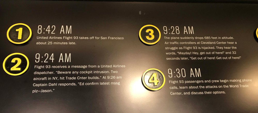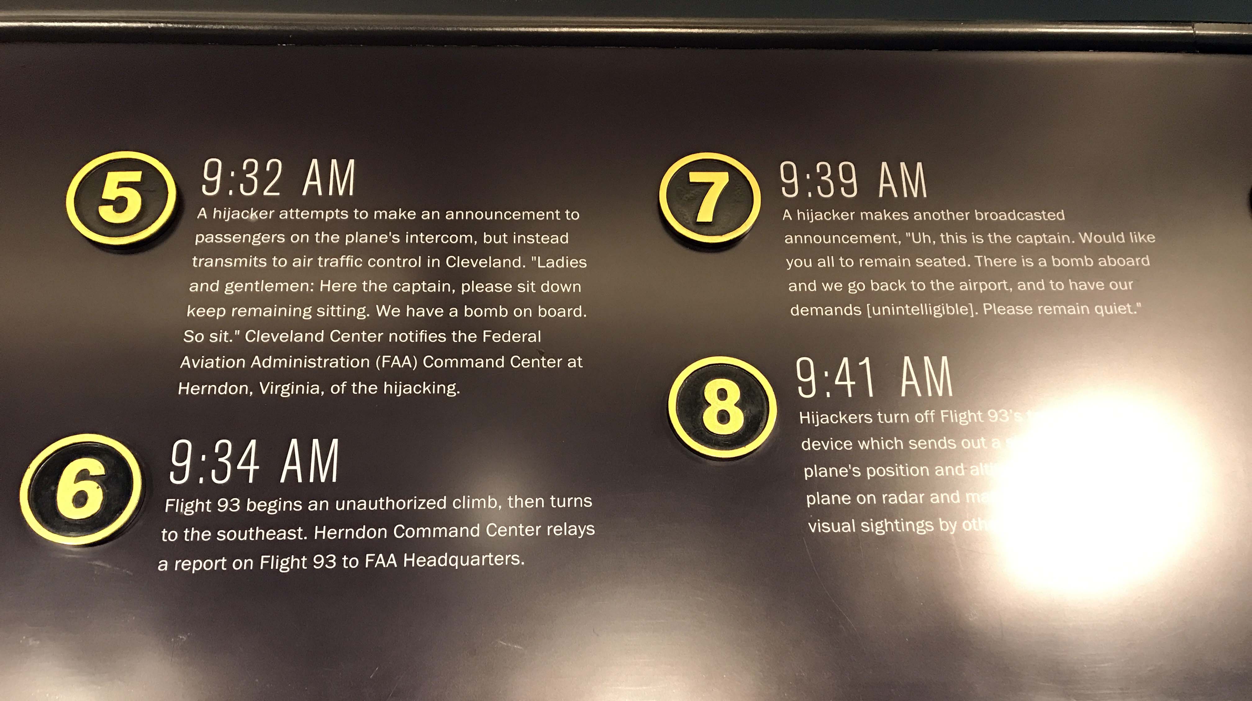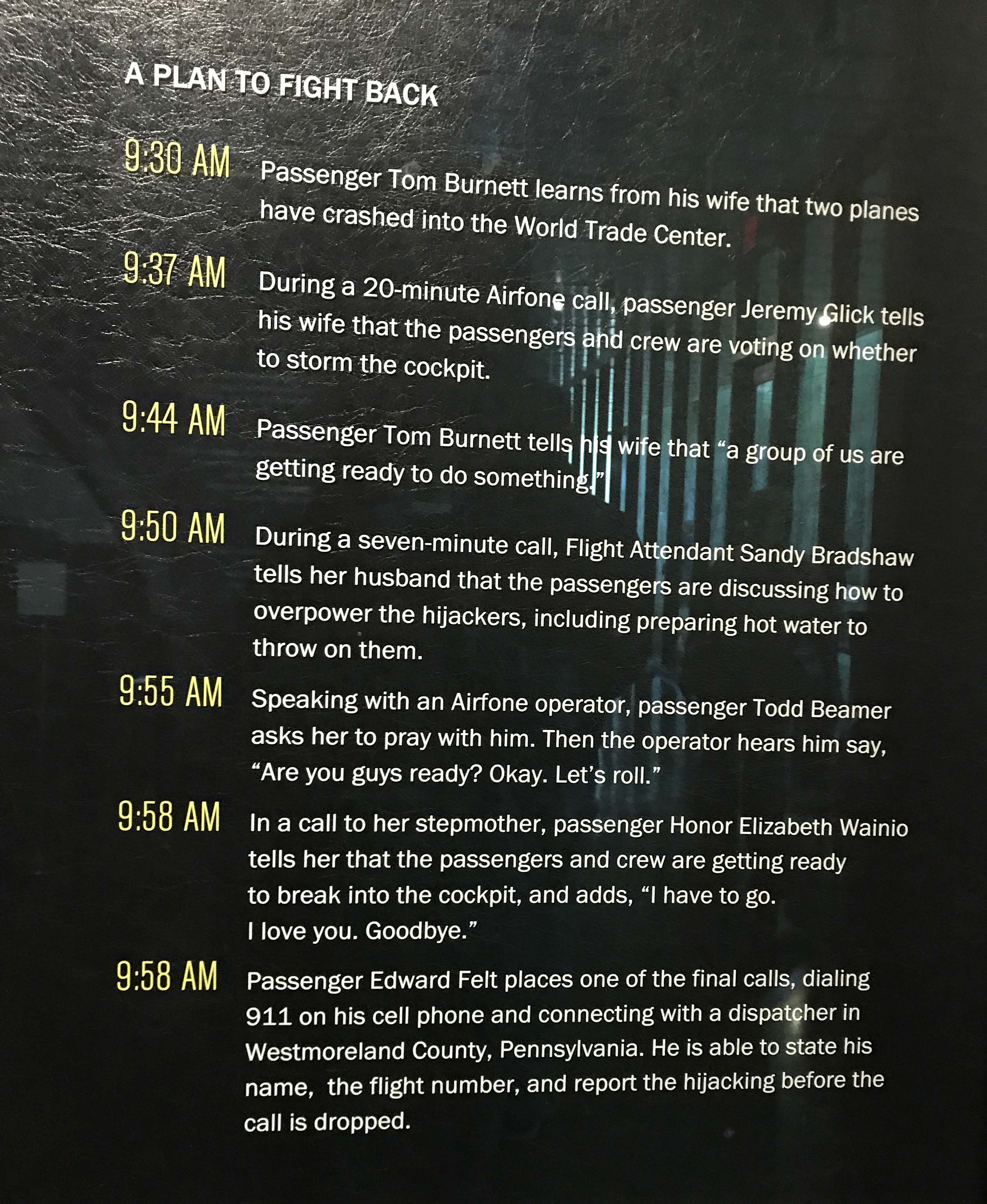 They also showed the timeline and I was amazed by how quickly it all happened. Keep in mind the people on the plane did not know what was happening in the world until AFTER they were hijacked and standard protocol at the time for hijackings was for the crew to go along in the hopes the plane would be landed. Using a plan as a missile was not something the crew was trained for.
