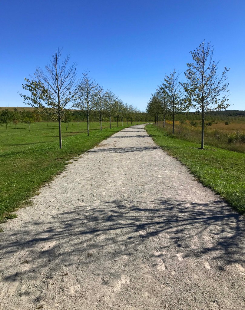 After the visitors center we talked about walking a large loop down to the memorial site but it was still pretty cold. Instead we drove down to the lower parking lot and walked beside the field and to the memorial. The natural topography of the area is a bowl with higher elevations to the north and west so the landform provides the circle shape of the memorial; the memorial rests and follows the contours of the circle. The loop path travels clockwise from the Visitor’s Center down to the wall of names in what the architect described as a “circle of embrace” which points your attention down to the crash site which is the final resting place of the passengers and crew. The trees surrounding this “circle of embrace” are missing in two places; first, where the flight path of the plane went overhead (which is the location of the planned memorial overlook and visitor center), and second, where the plane crashed at the crash site (depicted by a ceremonial gate and pathway into the crash site).