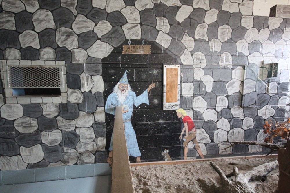 The large contact visitation area, complete with a tableau made by an inmate of a native family to complement the burial mound across the property. Note the guard cage above on the left. Ok that’s just weird – Trace
