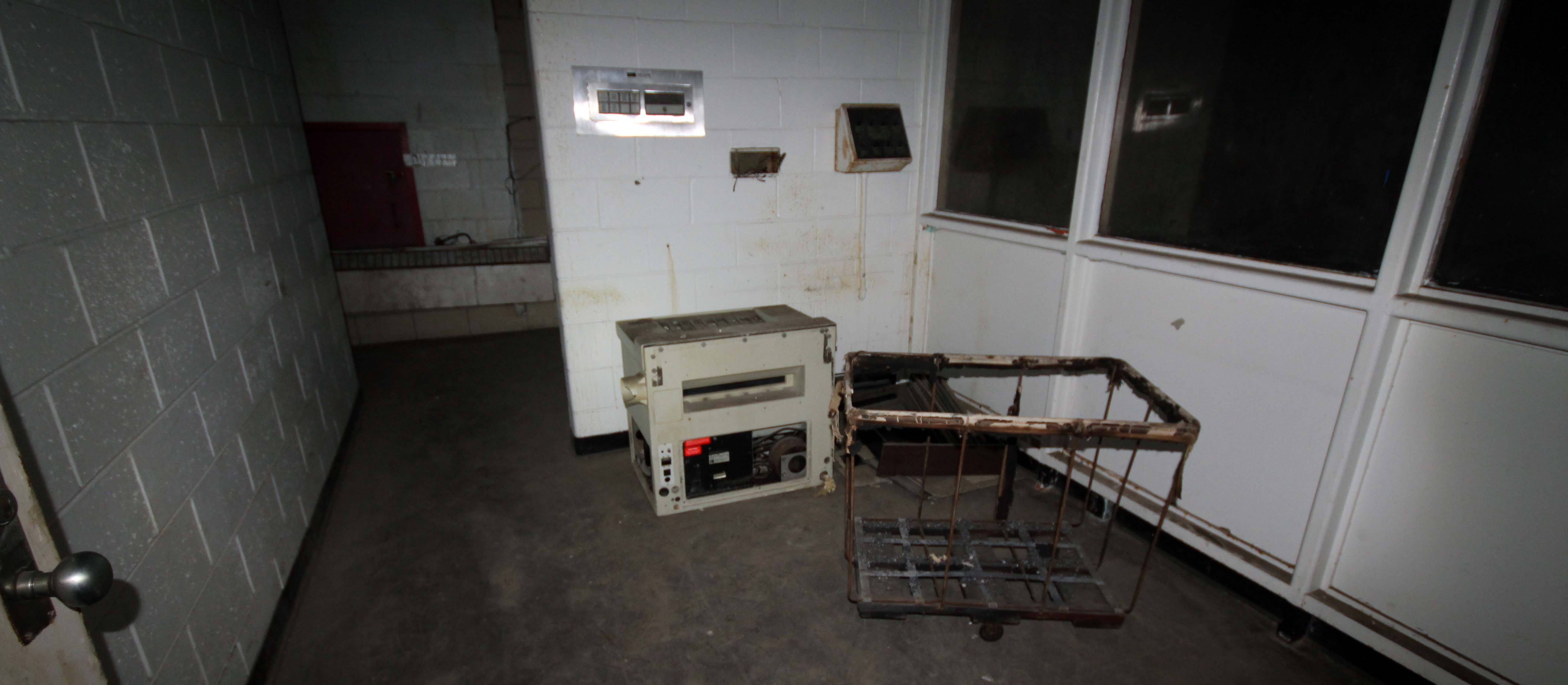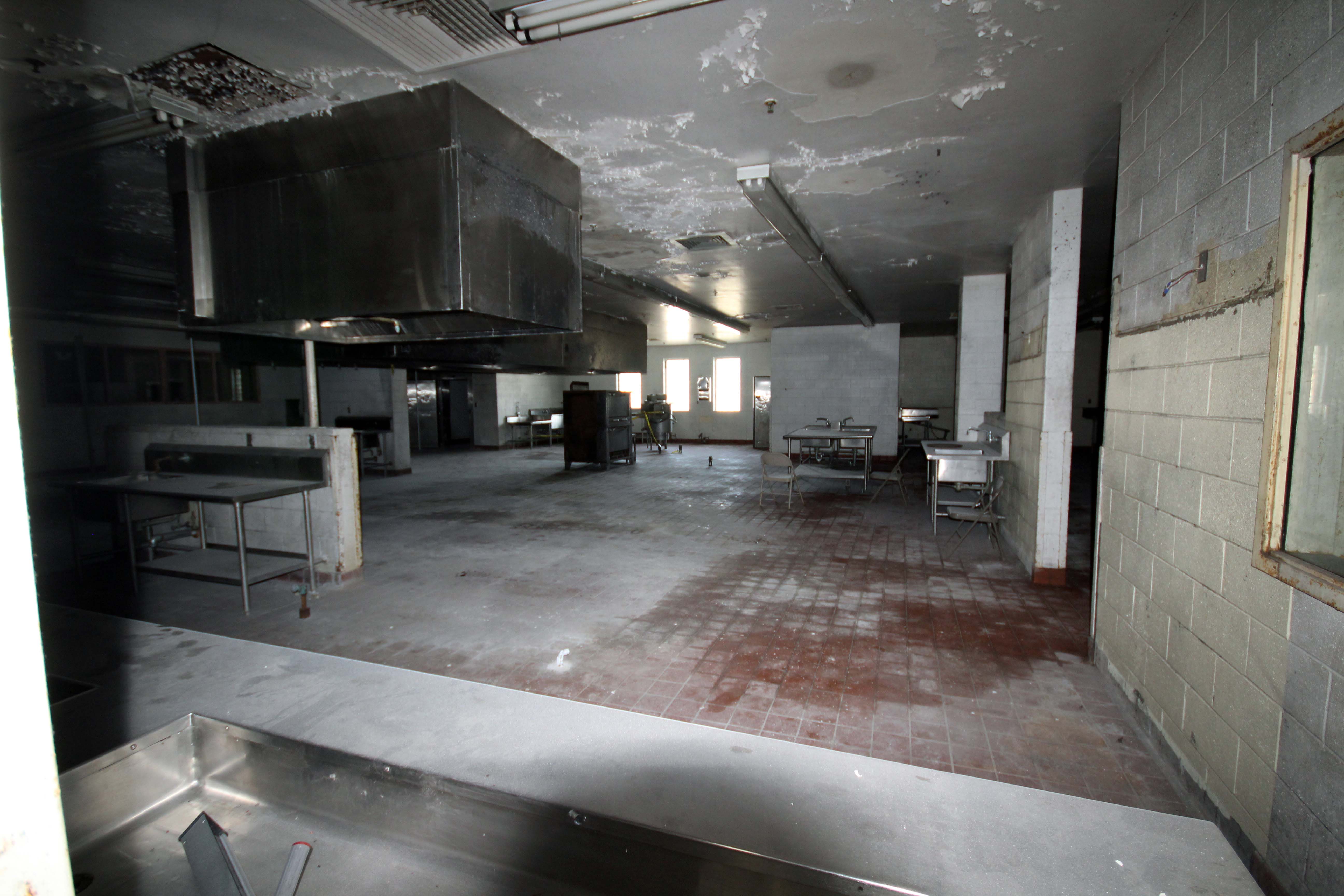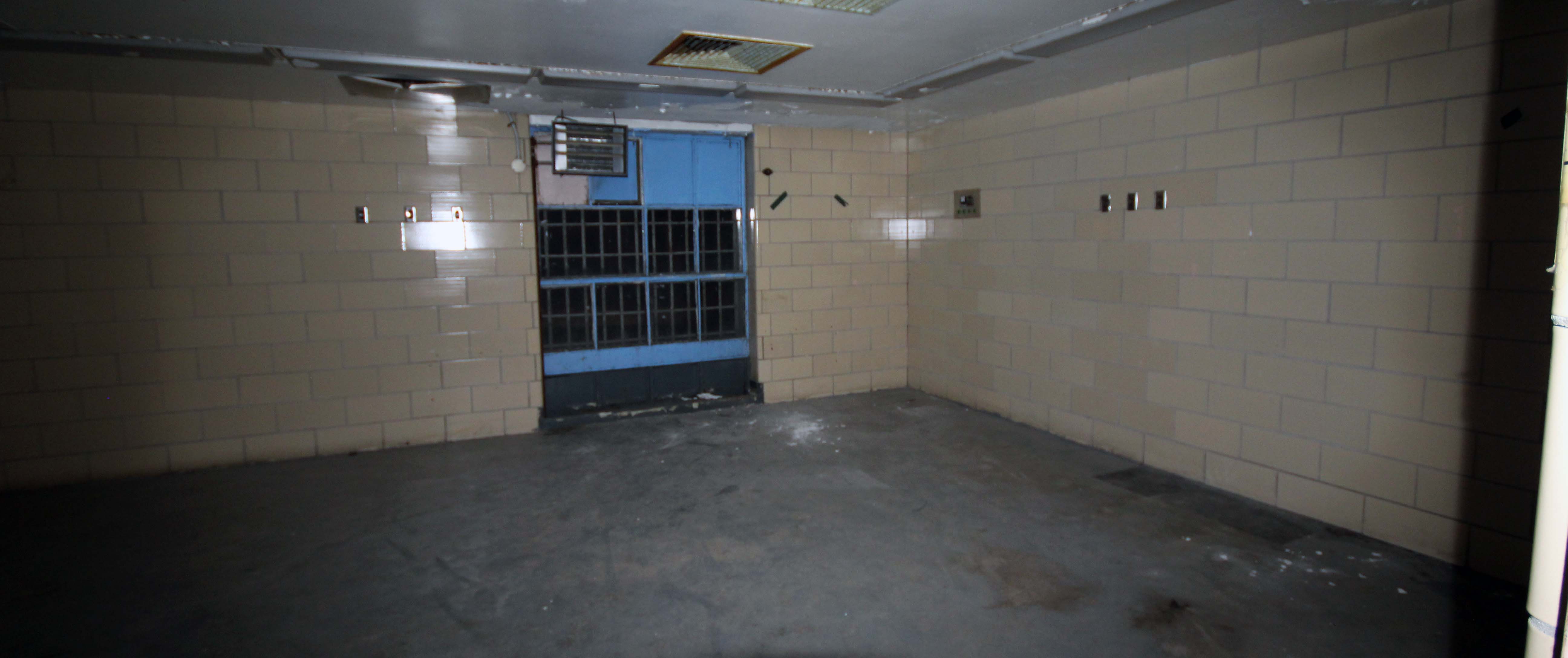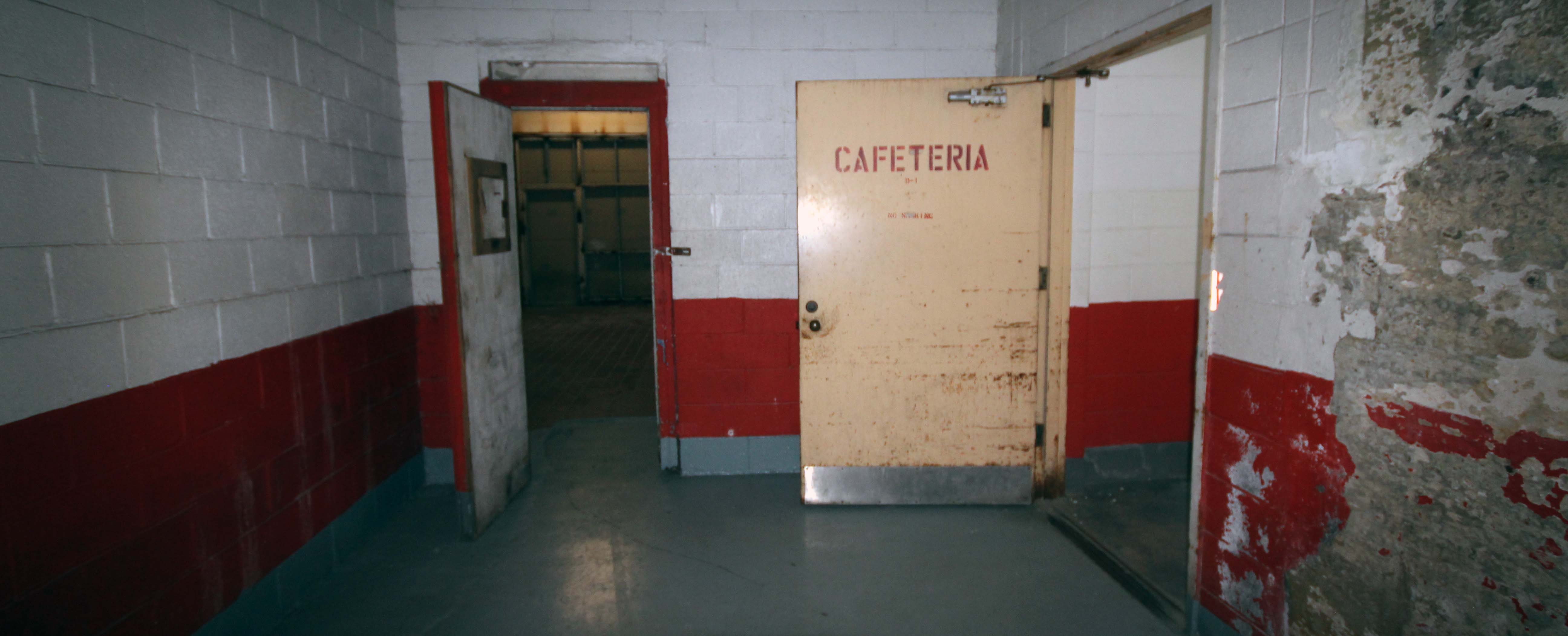 Just behind the wall separating the guard’s dining area from the inmates area is a “riot wall”. A section of the outer wall of the building that was not reinforced with rebar that could be knocked down by law enforcement in the event of a riot.