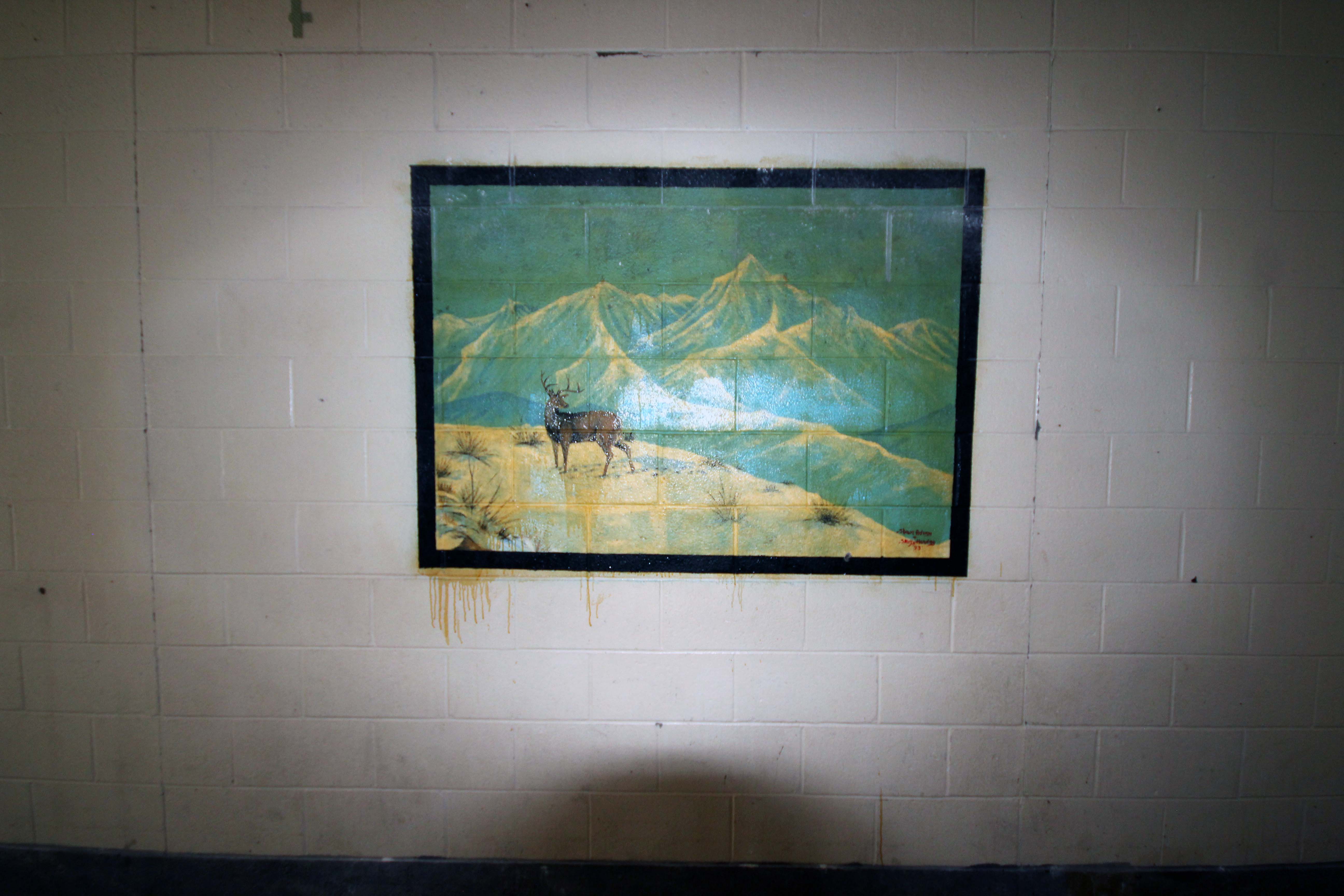The large contact visitation area, complete with a tableau made by an inmate of a native family to complement the burial mound across the property. Note the guard cage above on the left. Ok that’s just weird – Trace