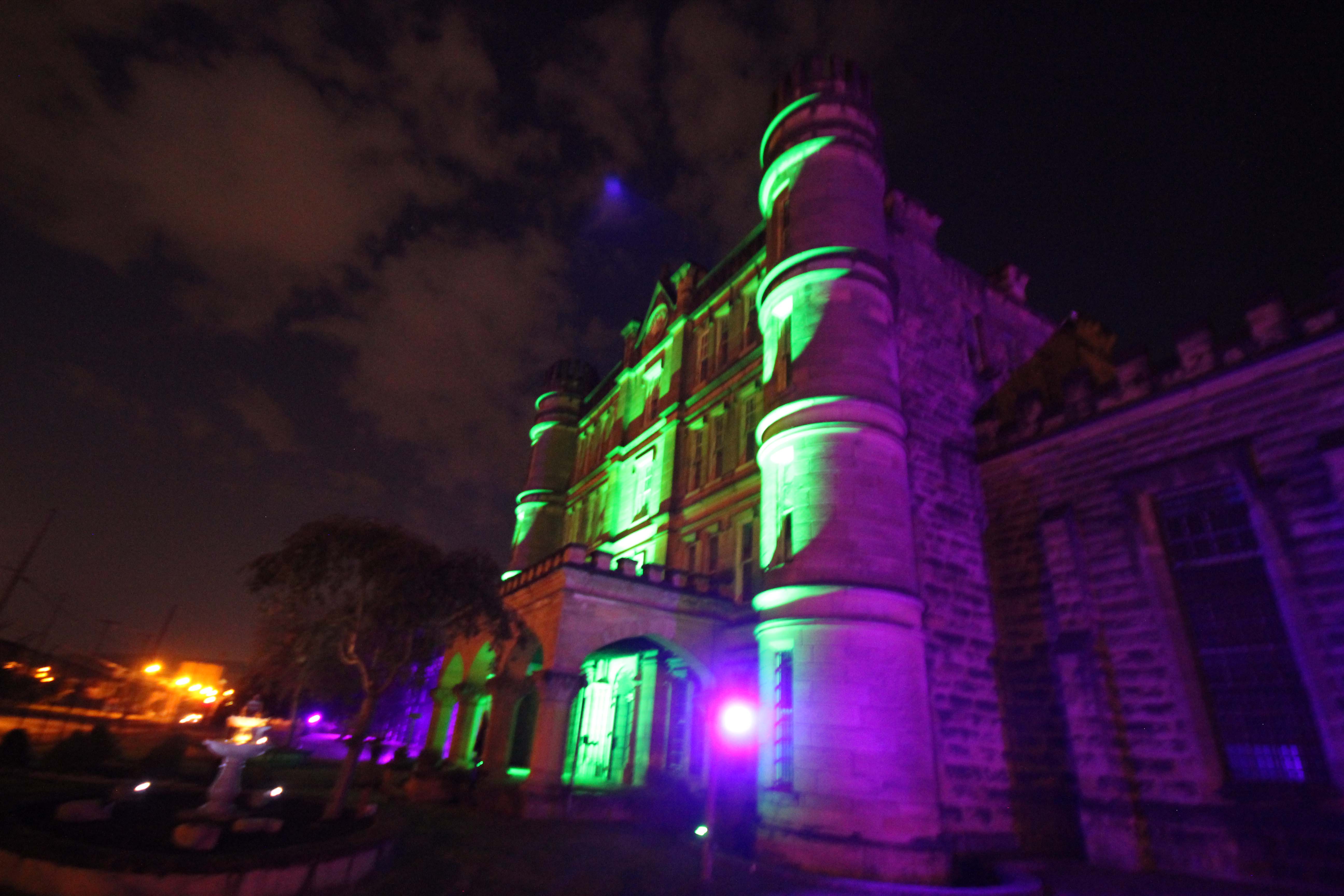 The building is lit up at night with creative colors for the season, because they do a haunted prison halloween thing, and it really photographs well.