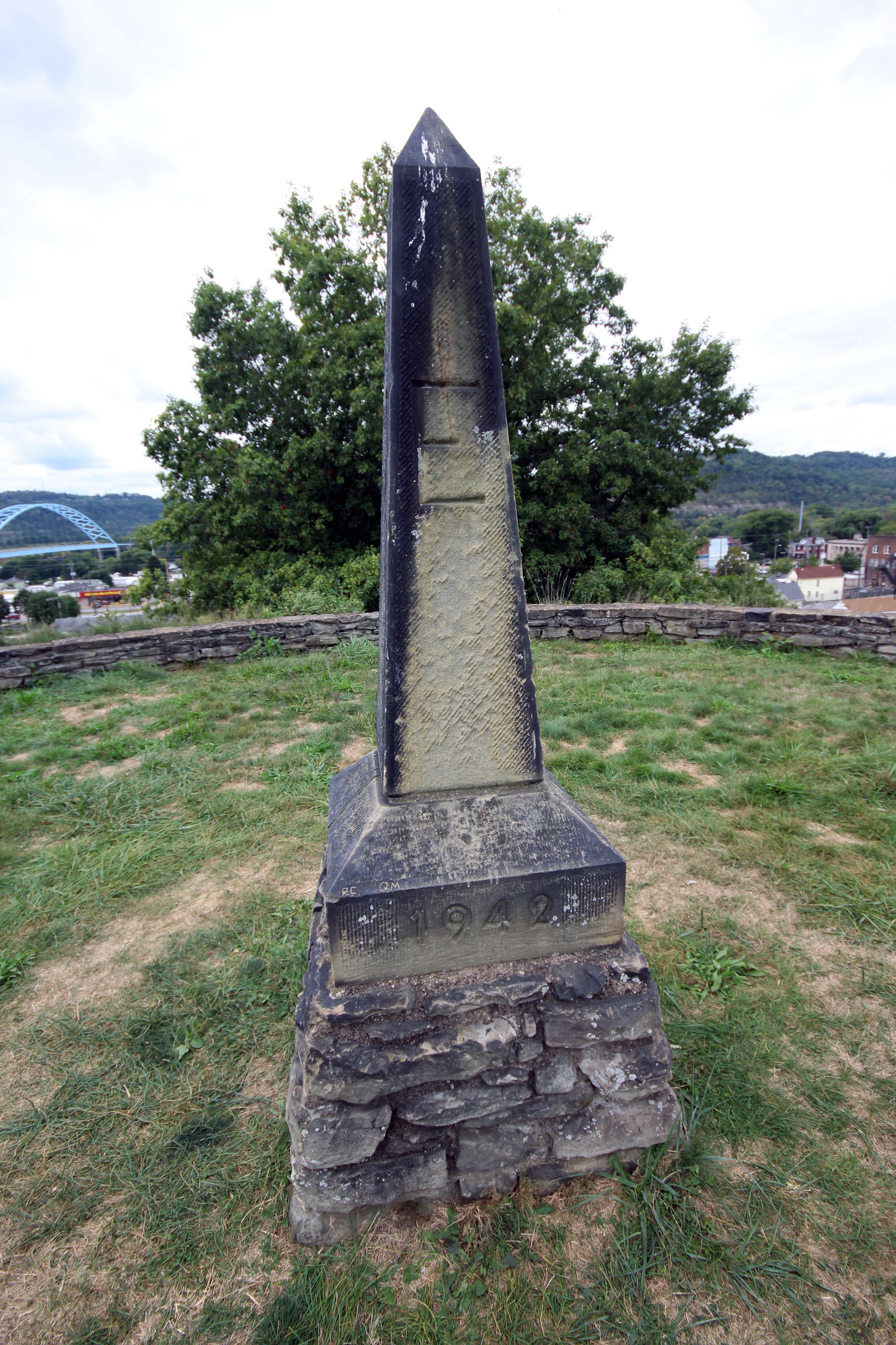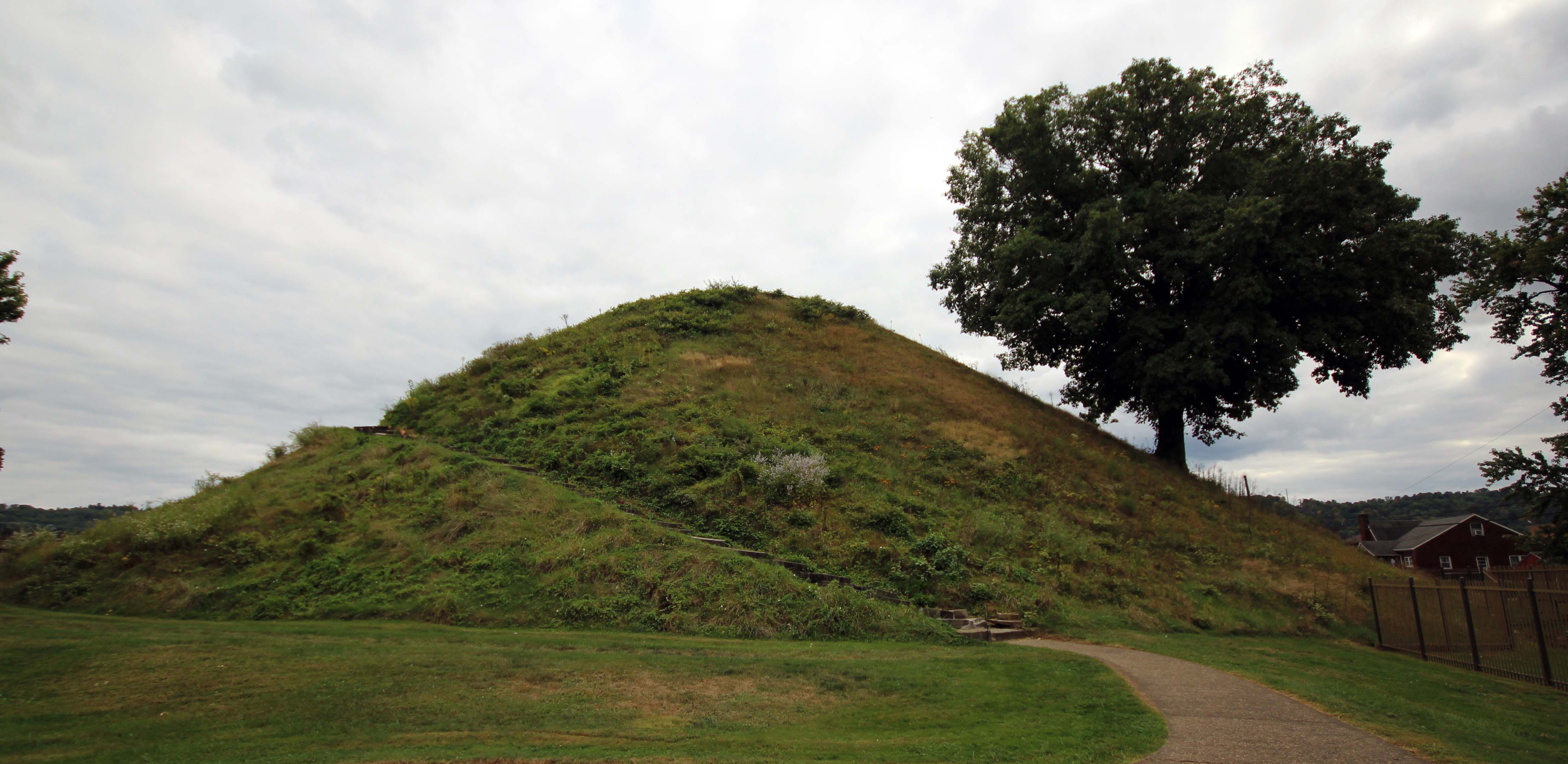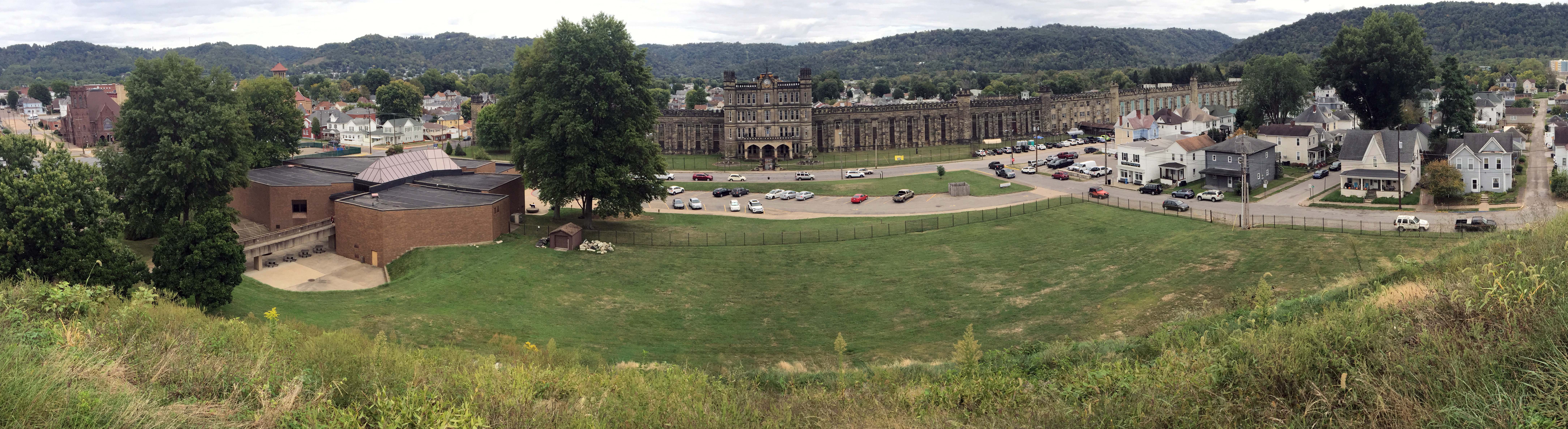 Just across the street from the West Virginia State Penitentiary is the Grave Creek Mound. There were actually many of these mounds in the area, hence the name, Moundsville. The Grave Creek Mound is one of the largest conical-type burial mounds in the United States, at 62′ high and 240′ in diameter. The Adena (pre-Columbian native Americans) built it, moving over 60,000 tons of dirt, and it was created around 250-150 BC. The first recorded excavation was in 1838 and their tunnel revealed two log tombs with graves and burial offerings. This is the largest of these mounds remaining, and has been designated a National Historic Landmark.