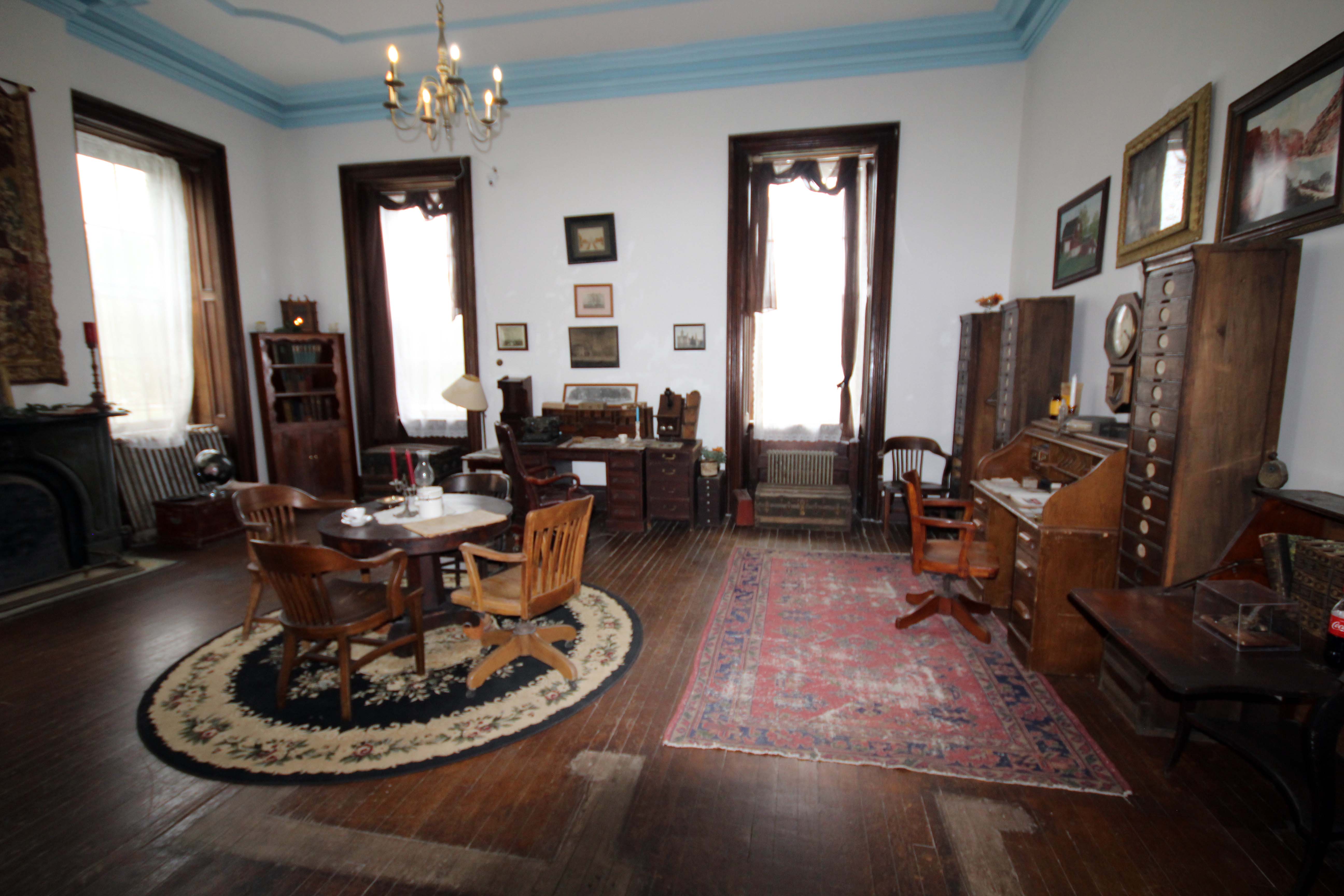 The upper floors of the main building were used for offices for the Superintendent, the chief physician, psychiatrist, the residence of the Superintendent and the lead nurses quarters. The following pictures are of the offices and the residence of the Superintendent. Pretty stark contrast to the living situation of the patients. – Trace