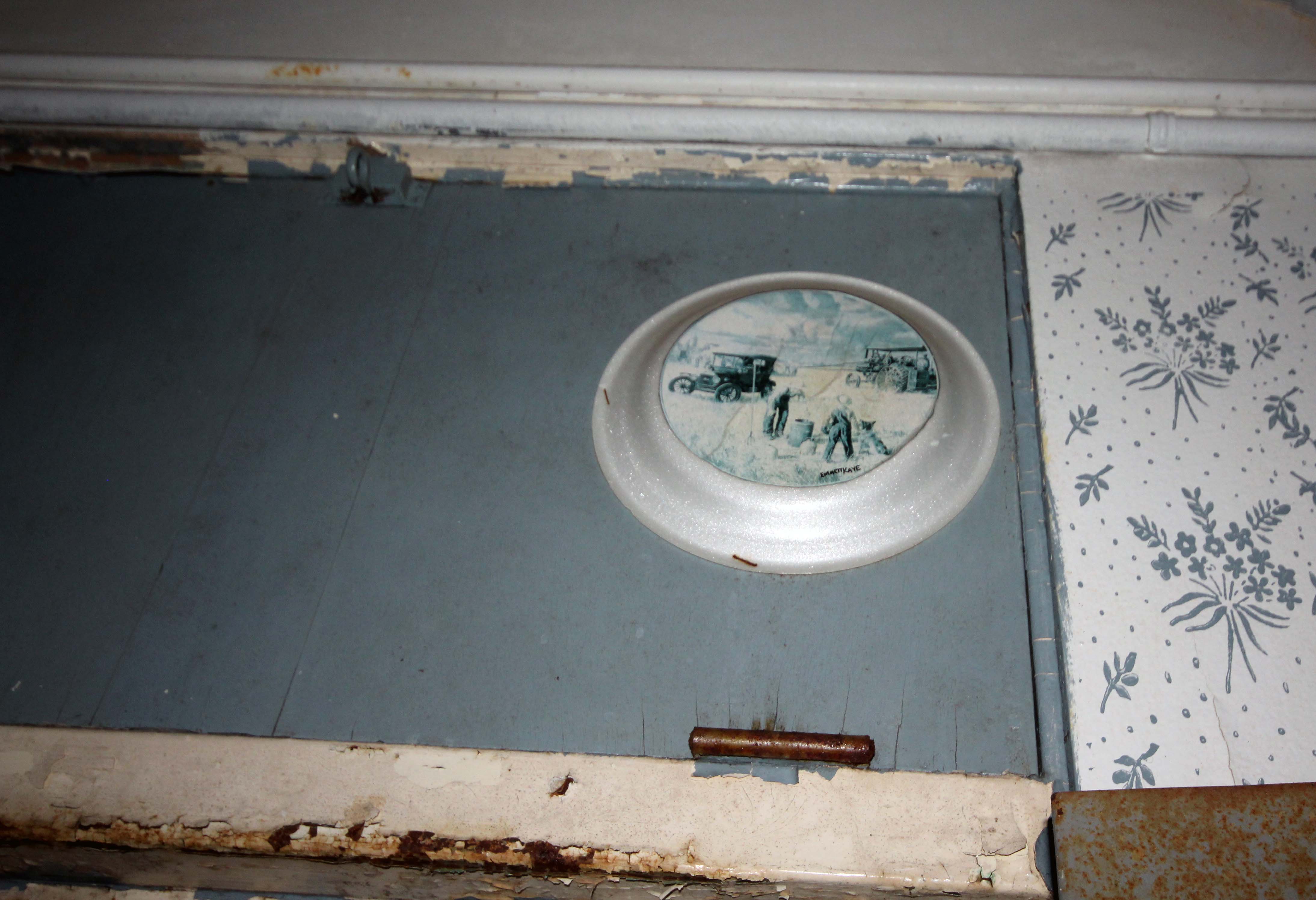 Patients were encouraged to use art to express themselves, and used pie plates to do so. Only two original paper plates remain hanging over transoms.