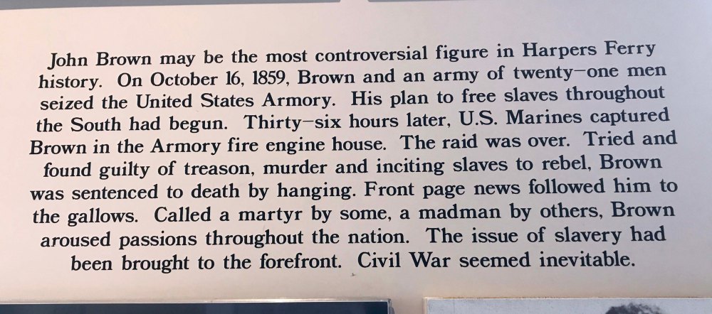 Learning about the railroad started what turned into an interesting day. When I think of Harpers Ferry I think about John Brown (more on that later), but it was also an important historical site in the civil war, part of the Appalachian Trail, and Lewis and Clark tested boats here. They did a nice job of dealing with the various historical contexts as we wandered the various sites although it definitely adjusted my thinking about why Harpers Ferry is significant.