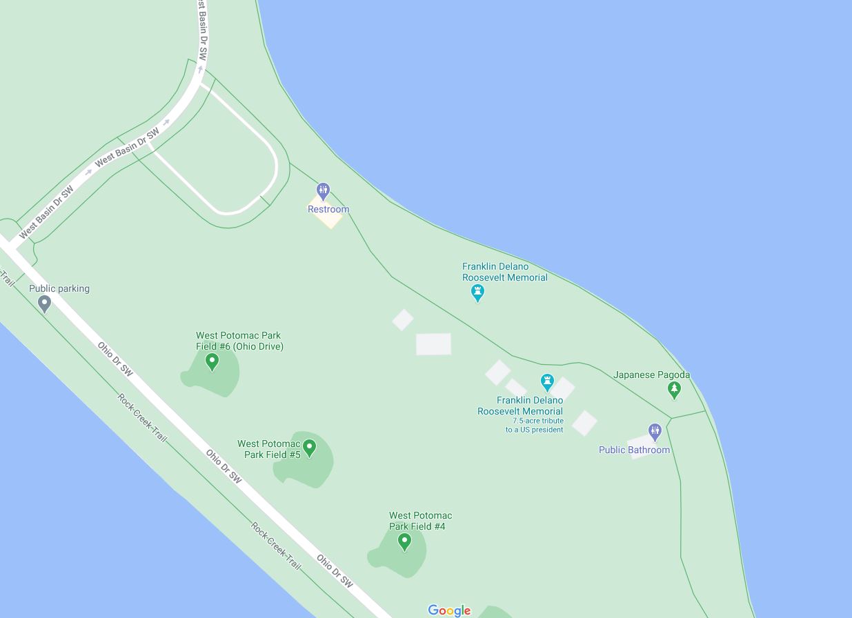 One of the things I really like about the FDR memorial is how spread out and sprawling it is. The map above doesn’t really show you how big it is, but this one below does a better job. It’s really big. From the bathroom on the left to the bathroom on the right, “as the crow flies” is 1000 feet, but the walk is not “as the crow flies”. I would be that it’s easily twice or maybe even three times the length of that. 7.5 acres! It’s just wonderful, the way it’s laid out. Lots of turns and reveals. And there’s a lovely mini-memorial to Eleanor, but I think she should get her own full blown memorial.