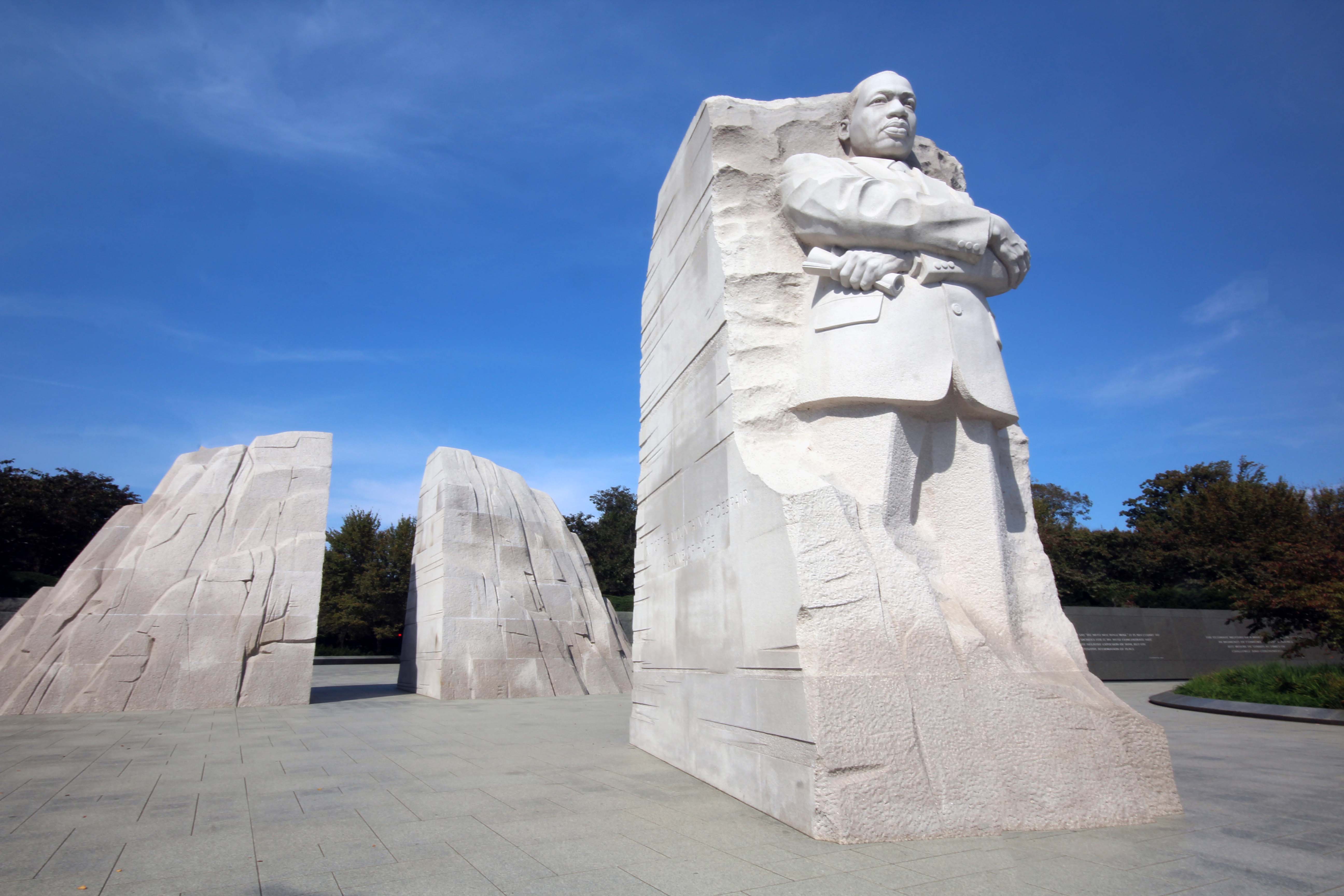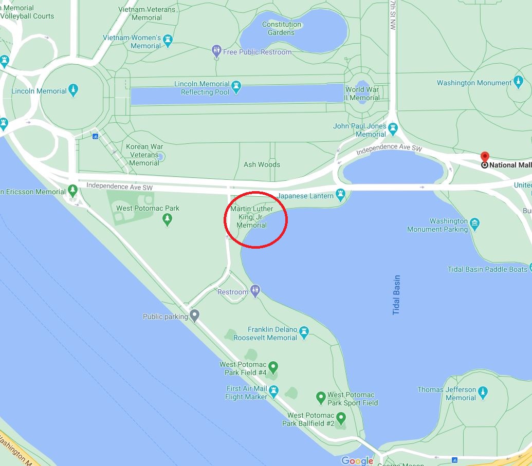 From here, it’s a pretty short hop south to and across Independence Avenue (cross at West Basin Drive, there’s a crosswalk) and down towards the basin to my favorite, the Martin Luther King Junior memorial. It’s the only major memorial on the mall not dedicated to a former president! I really like how imposing it is.