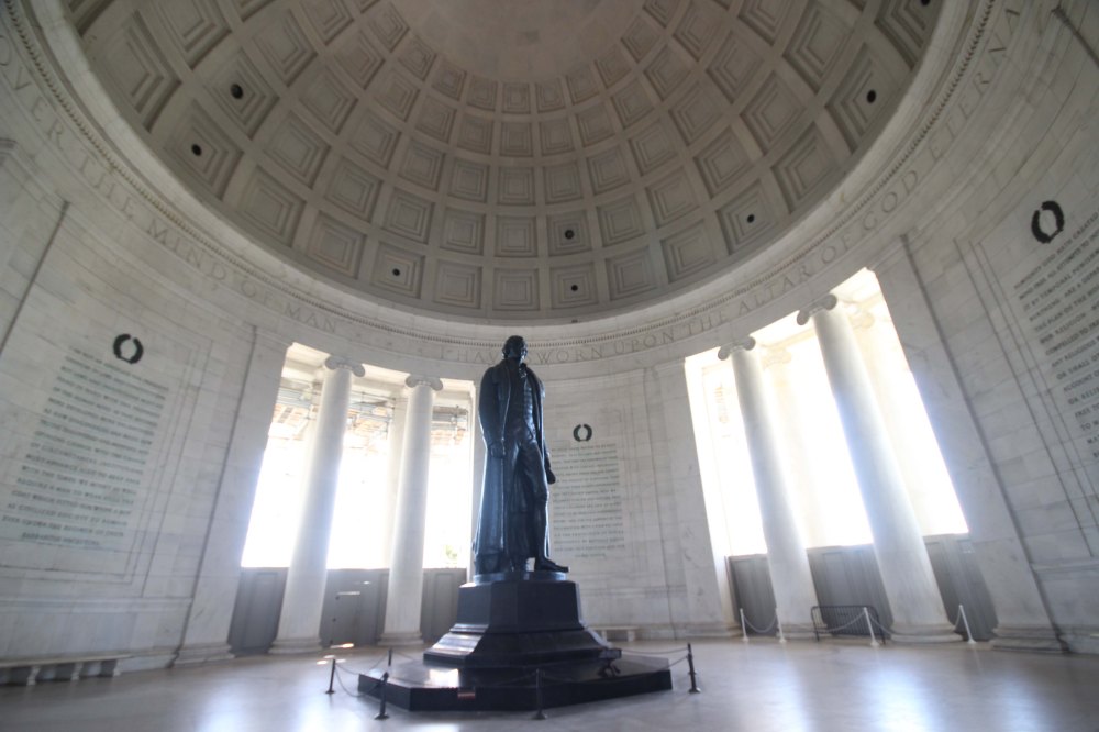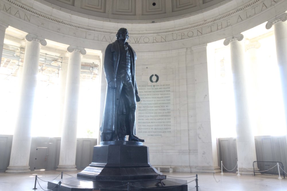 It’s hard to see in the picture above, but the Jefferson Memorial is having some cleaning work done on the roof. Here’s a page from the NPS website explaining it, and if you go to the two links inside that article there is some pretty fascinating (to me anyway) info on what they’re doing, and why. For you nerds: LASERS!!! Even though they’re doing work on it and most of it is covered in scaffolding and plastic sheeting, it’s open, which made me happy, because I like Jefferson and really wanted to see him. It’s not the most photogenic memorial because there’s not a LOT to photograph, and not too many good angles, but I tried.