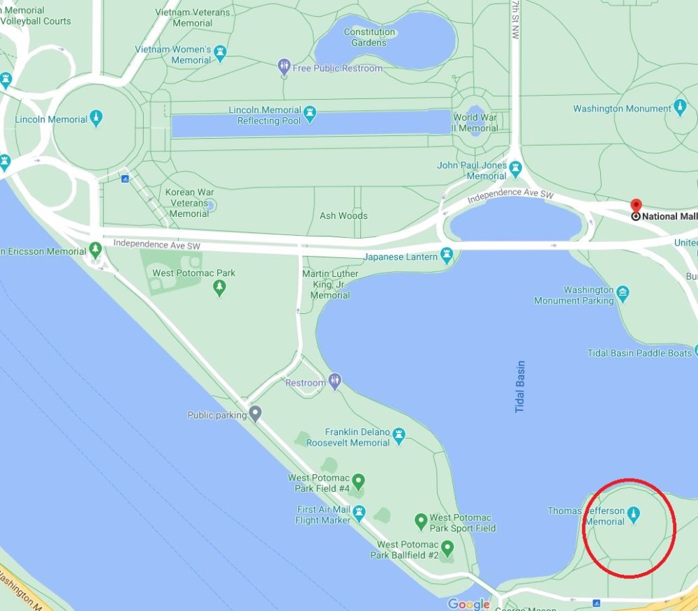 Once I was finished with the FDR memorial, I rode my scooter back down to the path along the edge of the tidal basin towards my favorite memorial, the Jefferson Memorial. There is a point where you have to come up from the water’s edge to cross the bridge on Ohio Drive, but that gives you a great view of the memorial as you head that way.