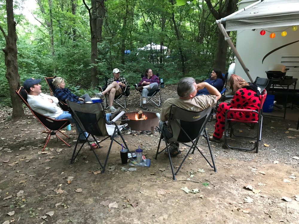 Hanging out with friends at a campfire, including Bryan, Susan and their daughter Sydney, who was rocking her onesie!