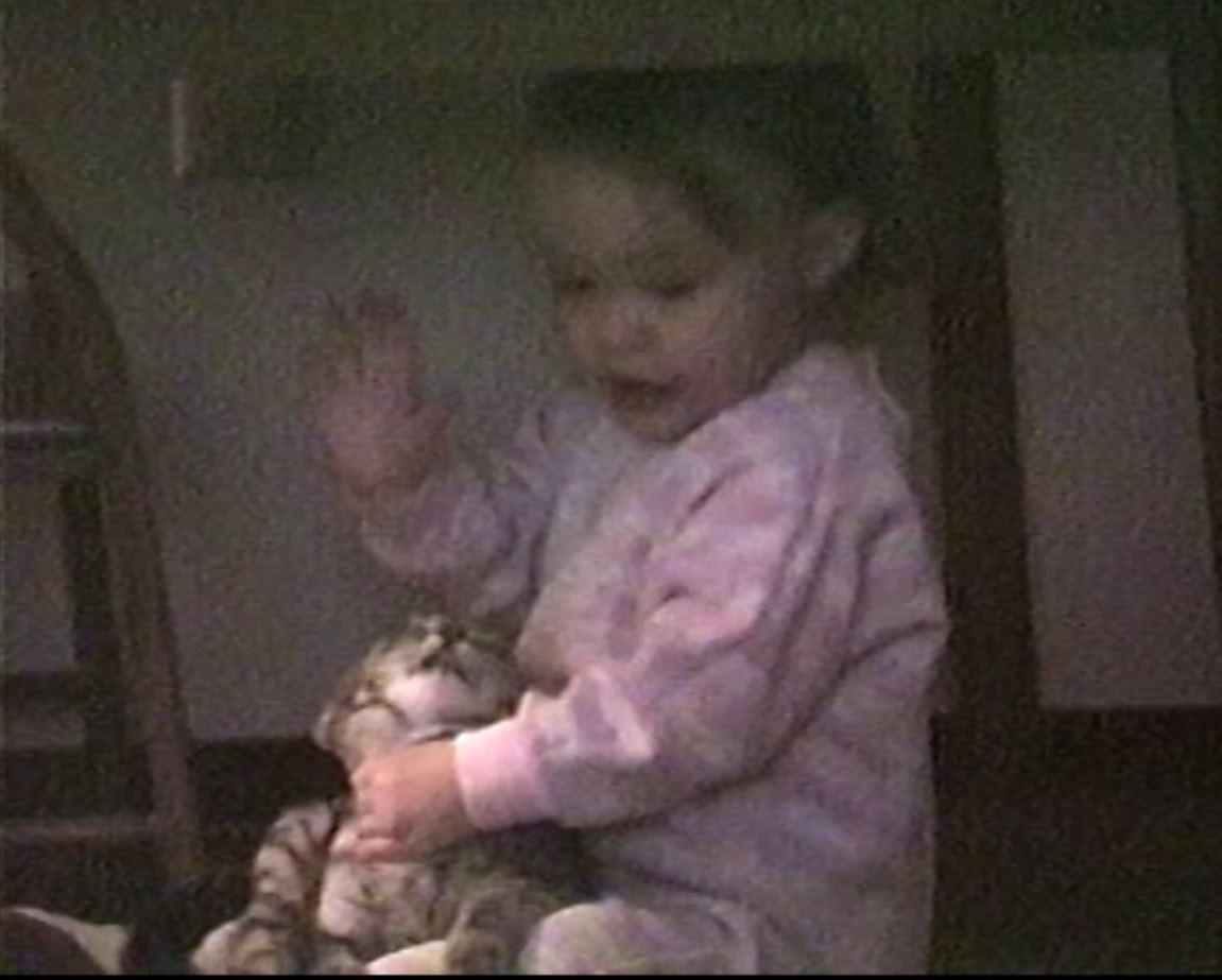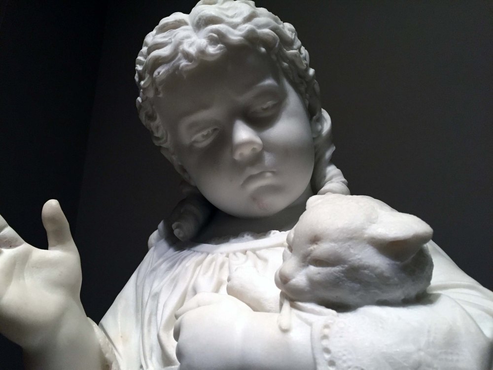 The statue below, Reproof, really caught my eye, and I looked at it for a long time. It wasn’t until I was building this post, weeks later, that I realized why I was so entranced by this 1878 work of art. Below is a screen grab of a 1989 video (apologies for the bad quality, it was 1989, HD was not a thing yet!) of our oldest daughter, Kyrston, and our cat Dodger.
