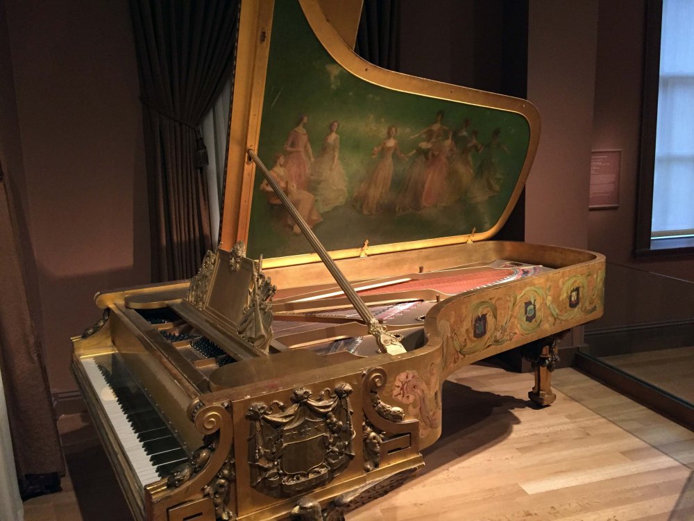 In the hopes of initiating a more active musical life at the White House, Teddy Roosevelt commissioned this piano from Steinway & Sons. It expresses patriotic pride through eagles, garland, and shields with the coats of arms of the first 13 states.