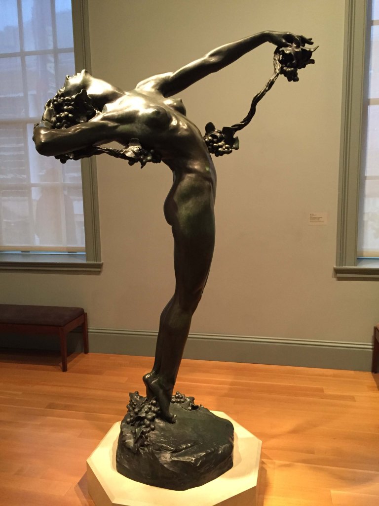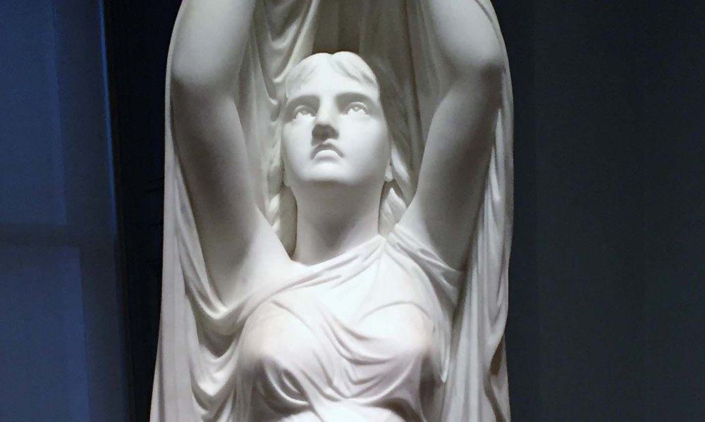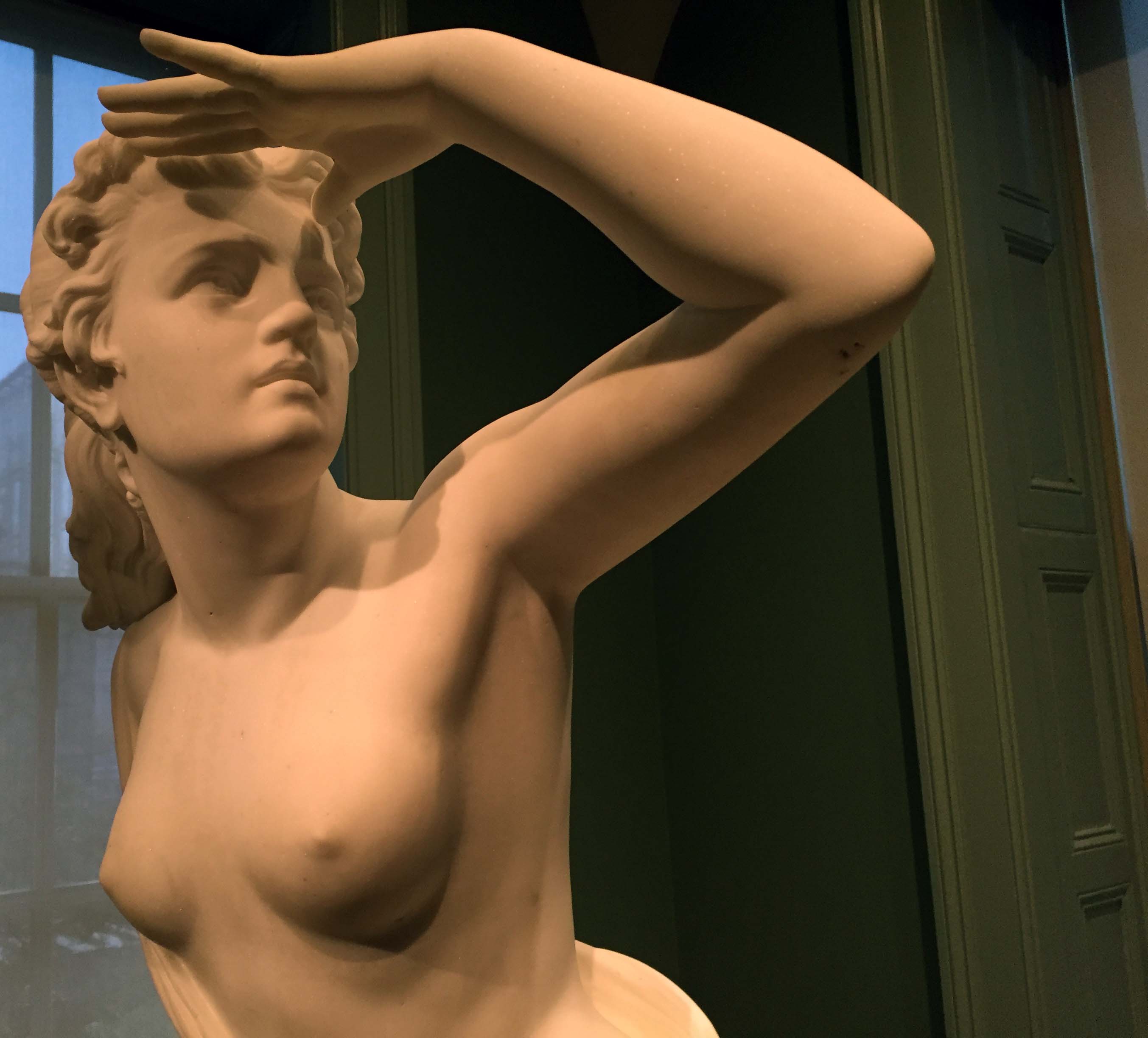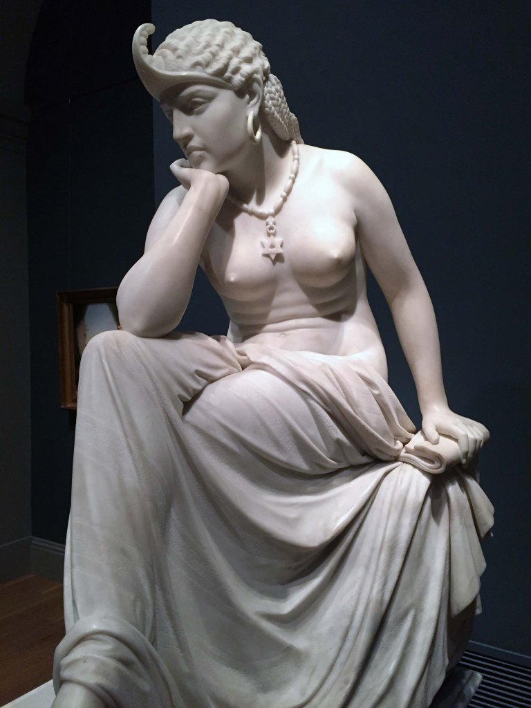“This statue was among the most popular of the 19th century. More than a hundred thousand people saw it during its tour across America mid century. It depicts a Greek woman who has been captured and chained by a Turkish warrior. The statue referred directly to the Greek struggle for independence during the 1820s, but also evoked the issue of slavery in America. It was the first nude statue to be widely accepted by the American public. By emphasizing that the slave was stripped by her captors and not nude by choice, Powers gave the public permission to view the statue without embarrassment.”