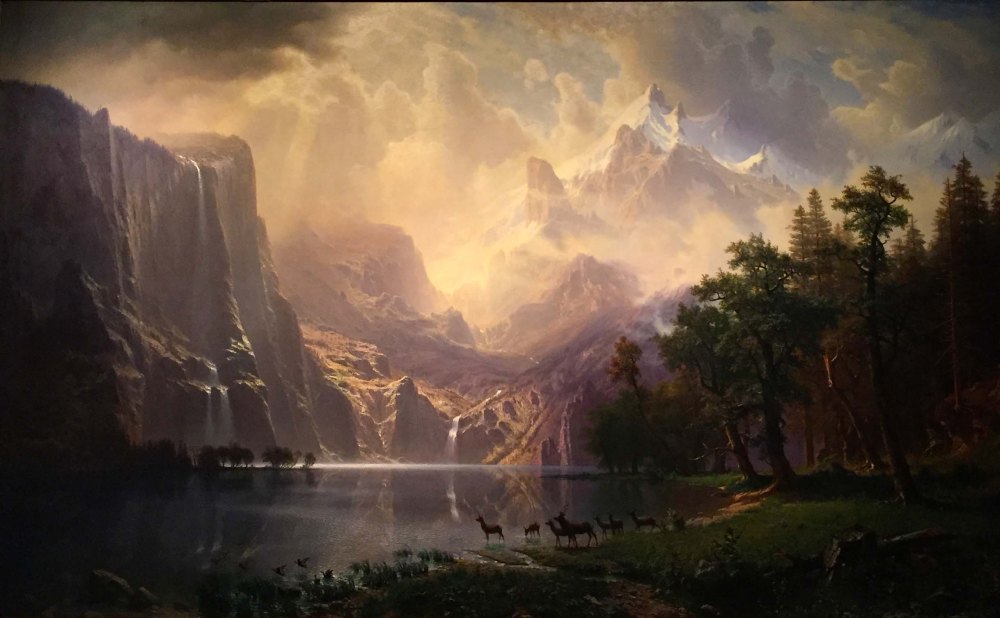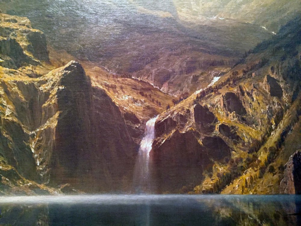 The picture below is a breathtaking 10 feet wide by six feet tall. It is truly spectacular. From the card next to the painting: “Bierstadt’s beautifully crafted paintings appealed to an international market captivated with the idea that the West represented a new Eden, a chance to start over after the Civil War. The landscape depicted is a medley of classic western features. The distinctive falls on the far left, balanced on the right by a peak that deliberately recalls the Swiss Alps, evoking a favorable comparison between the American scenery with the most recognizable mountains of Europe. The scale and majesty of the painting were a metaphor for America’s equally grand cultural ambitions, and paintings like this one were an essential aspect of growing curiosity and tourism in the American west. Despite this painting’s impressive size, it was intended to hang in a private home, a reminder of Bierstadt’s ambitions to paint for a very wealthy clientele.