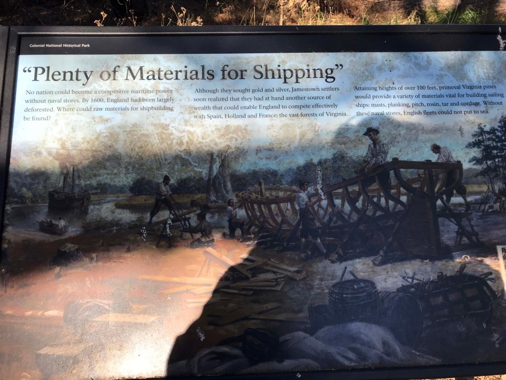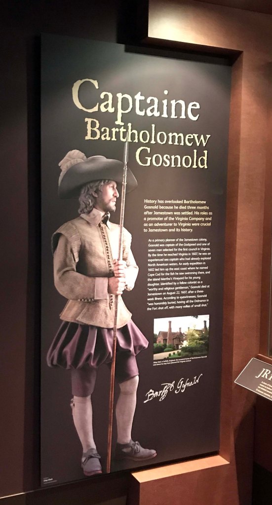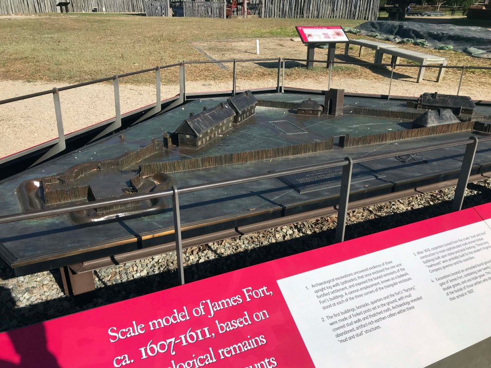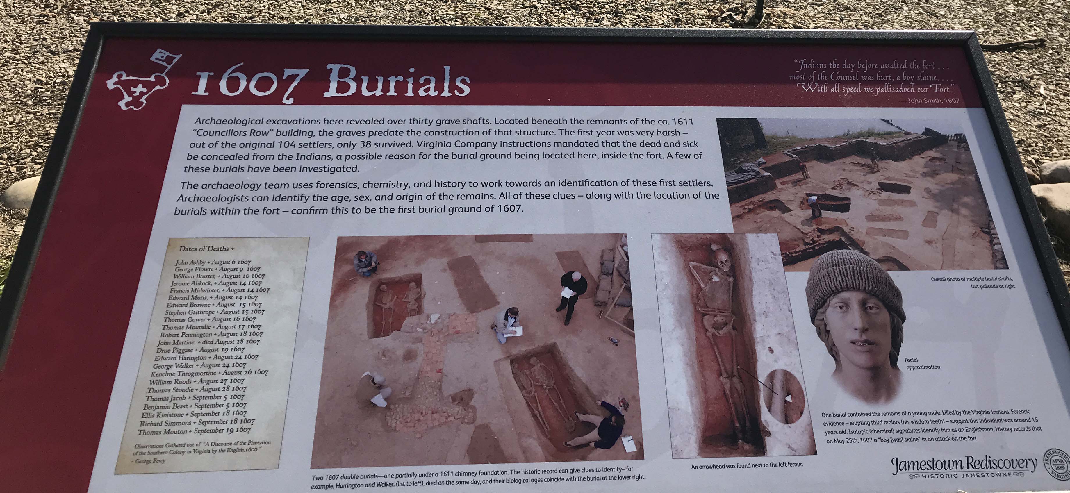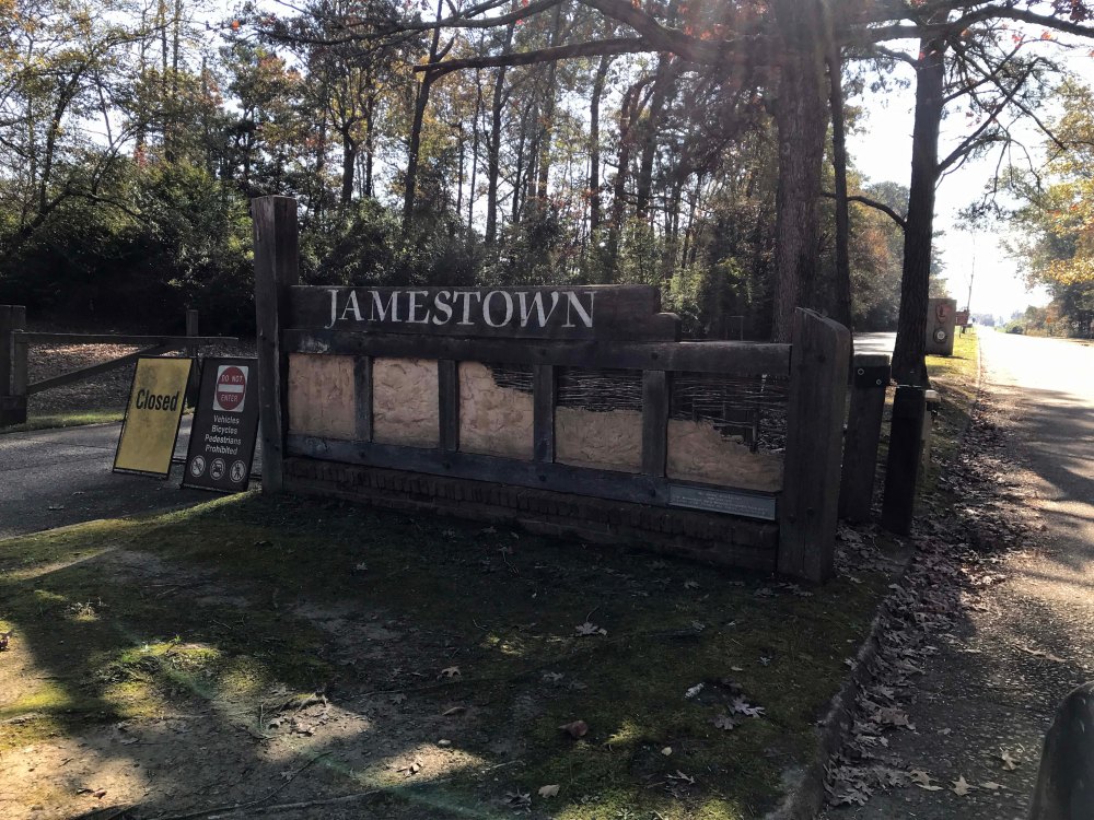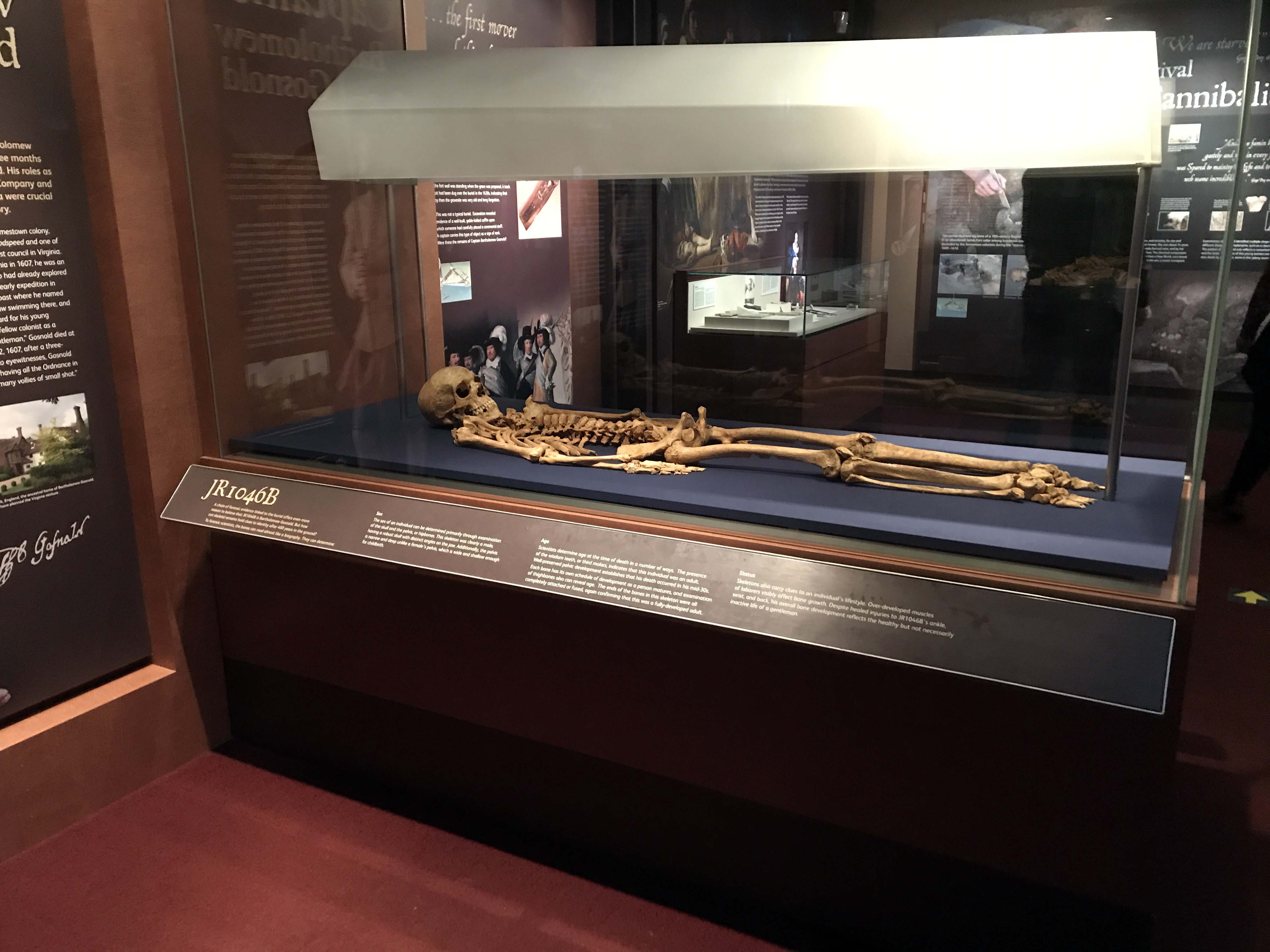 Because it was hard to maintain social distance in the fort area, we moved on to the museum.  This building has the artifacts they have found and Lee really enjoyed it.  No puppies allowed though so we took took turns going in and I have to say I didn’t care for it.  Almost immediately upon entering they had a skeleton of one of the original colonists and that bothered me quite a bit.