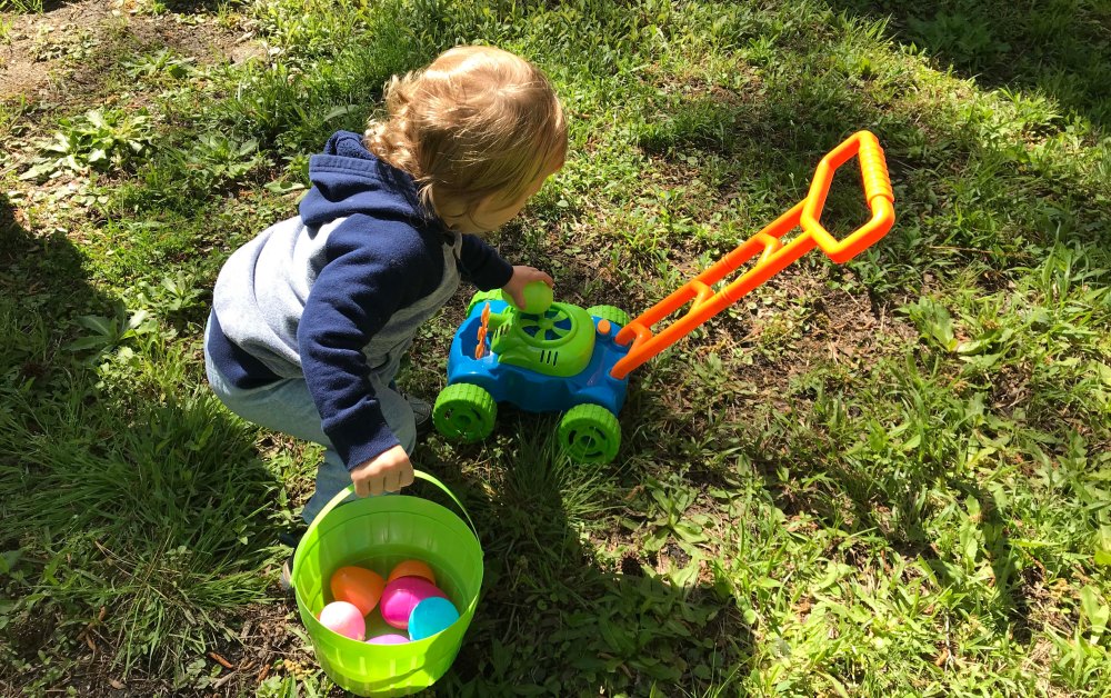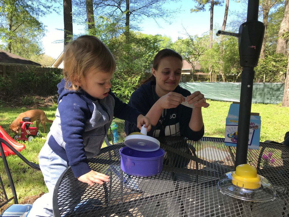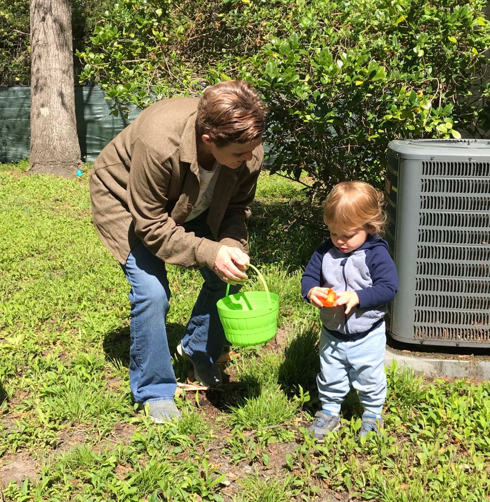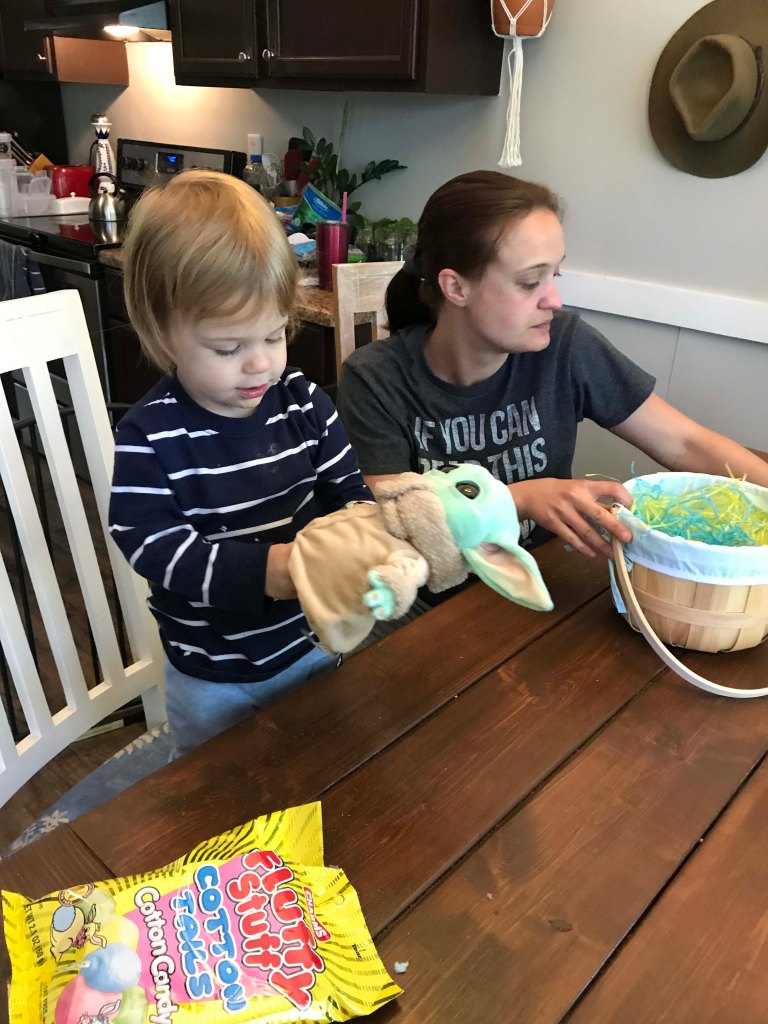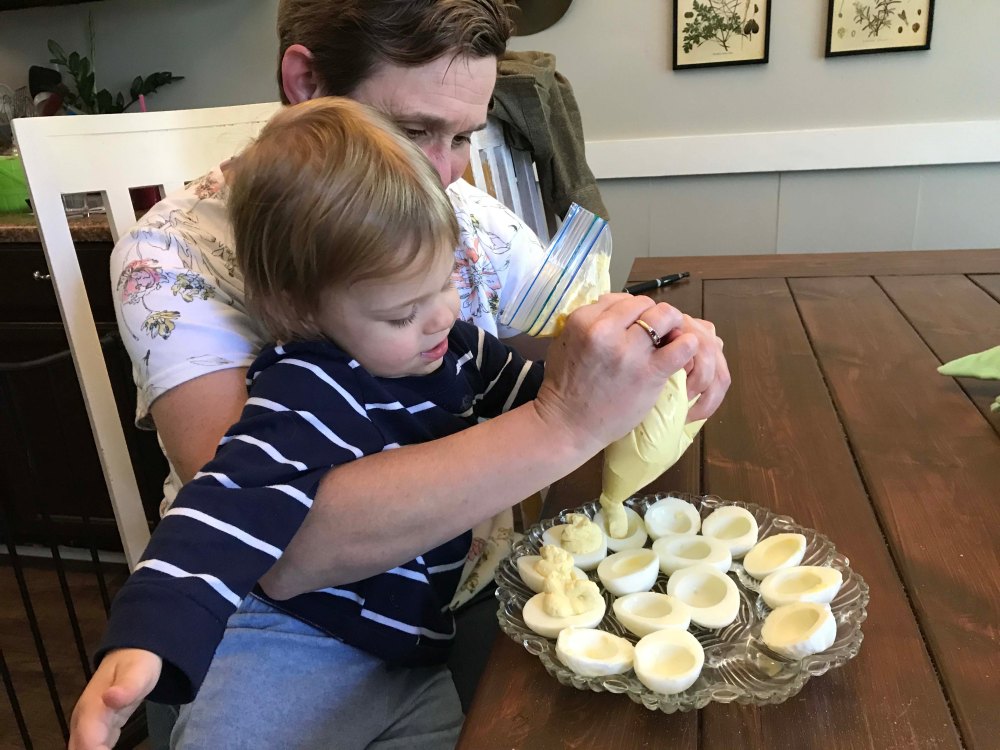 First up Grandma had to show Oliver where the egg goes. He picked it up super quickAnd because you keep the “hiding” simple at this age he did a great job finding them…with some help.Look at that smileI thought this one was kind of hard but he found itOut of 12 Kyrston hid he easily found 7 which I thought was a great job!!Then we did the coloring. After some searching I found an egg spinner which was pretty easy for a toddlerPush the button and the egg spins around. We only did five but he liked itThen we did the Easter Basket complete with a Baby YodaHe doesn’t get lots of sweets but loved the chocolate bunny earsHis absolute favorite though was the bunny bubblesI also wanted to have him help me fill deviled eggs. Kyrston showed me this cool trick where you put a Ziploc bag in a cup and then scoop in the egg mixThen you pull the bag out and snip one corner. I have never done that beforeOliver was a little squirmy for egg making so we gave him a nap and then started making the dinnerHam, cheese potatoes, green beans, and deviled eggs. All done in time for the end of Oliver’s nap Delicious!!