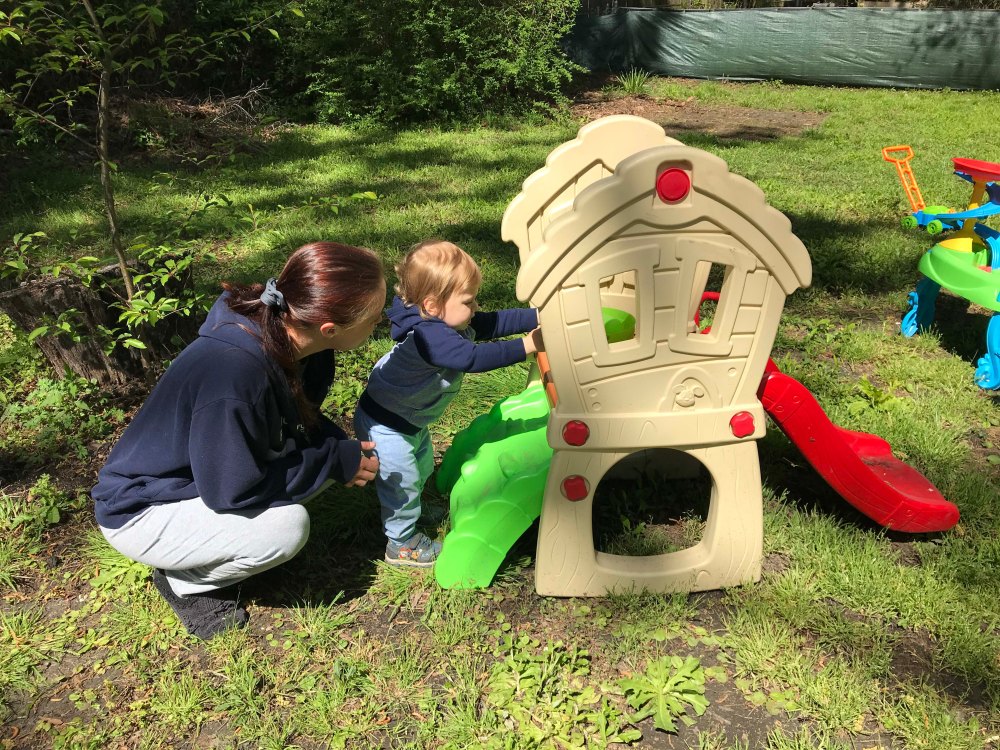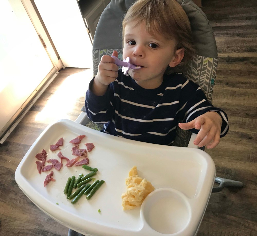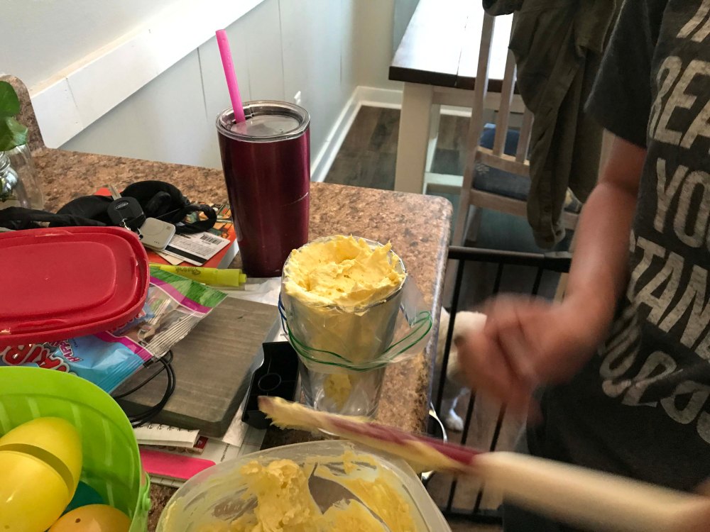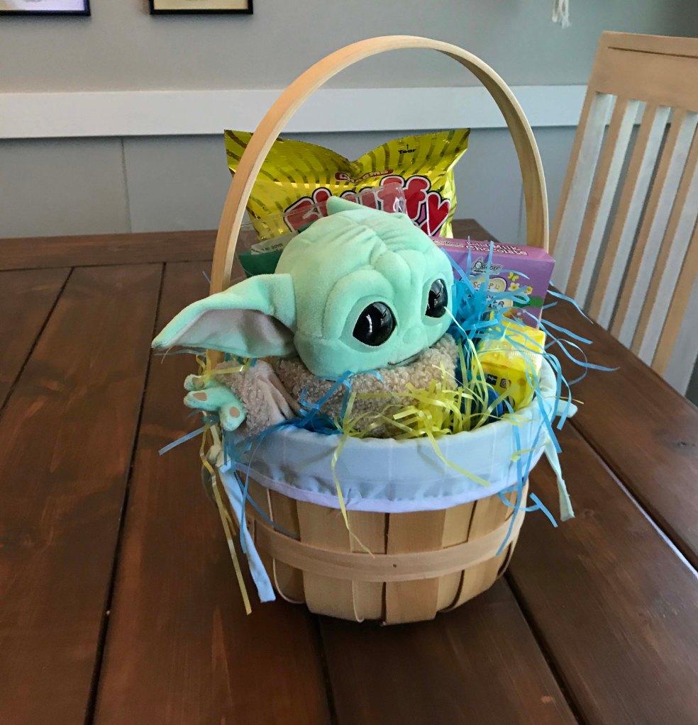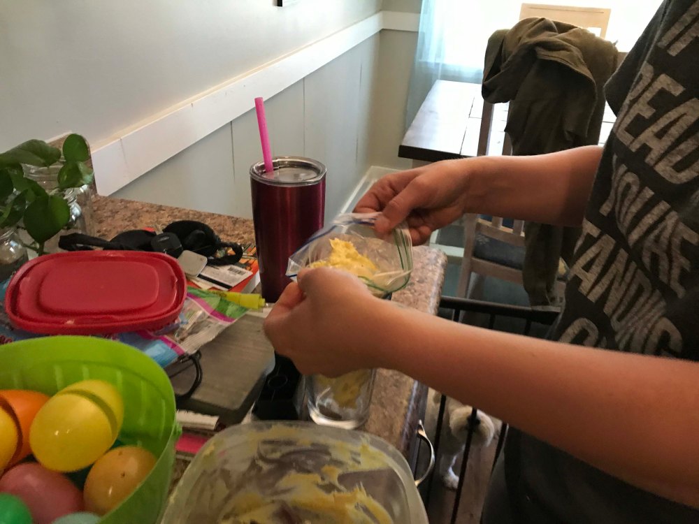 First up Grandma had to show Oliver where the egg goes. He picked it up super quickAnd because you keep the “hiding” simple at this age he did a great job finding them…with some help.Look at that smileI thought this one was kind of hard but he found itOut of 12 Kyrston hid he easily found 7 which I thought was a great job!!Then we did the coloring. After some searching I found an egg spinner which was pretty easy for a toddlerPush the button and the egg spins around. We only did five but he liked itThen we did the Easter Basket complete with a Baby YodaHe doesn’t get lots of sweets but loved the chocolate bunny earsHis absolute favorite though was the bunny bubblesI also wanted to have him help me fill deviled eggs. Kyrston showed me this cool trick where you put a Ziploc bag in a cup and then scoop in the egg mixThen you pull the bag out and snip one corner. I have never done that beforeOliver was a little squirmy for egg making so we gave him a nap and then started making the dinnerHam, cheese potatoes, green beans, and deviled eggs. All done in time for the end of Oliver’s nap Delicious!!