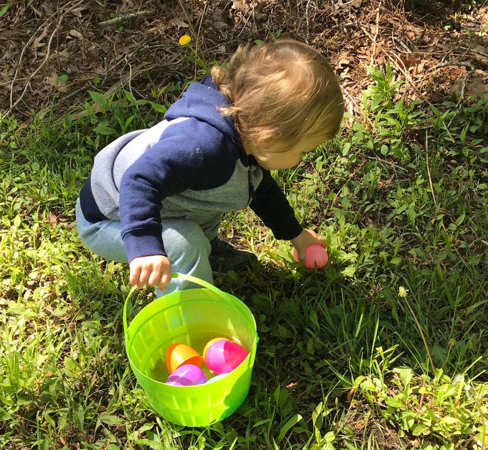 Basically at this age you keep the events short and let the kid wander off when they are done. I also highly recommend doing them in the morning so you can follow with a nap. We completed an Easter egg hunt, colored a few eggs, and he opened and sampled his basket in about 1-1/2 hours. Perfect in my opinion, but let me share the photos so you can see.