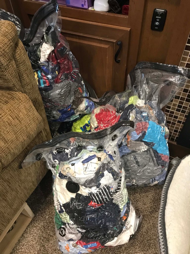 Kat and Adrian (her partner) have been working on getting ready and I was happy to assist by dropping off all the shrink wrapped clothes I have been buying. For several months in our travels I have been buying baby clothes at thrift stores and garage sales and resale shops, and between what I bought and what my older daughter Kyrston sent she should have enough for a year or more. I also finished a cross stitched baby blanket for her and was happy to give that as well.