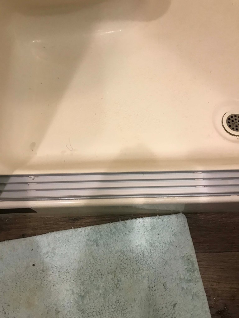I knew this was a huge job, but let me explain why it was so important. Our shower doors (like many RVs) did not open on both sides. This meant that the area between the shower and the vanity was almost impossible to get clean and worse the track at the end where the shower head is couldn’t be cleaned either. Despite my best efforts, there was lots of mold in that section of track and it was really gross. Was the shower functional? Yes. Did it really bug me? Double yes. So I asked Lee if he could look into it.