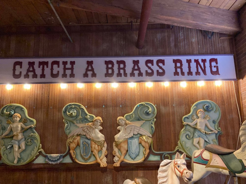 I learned that carousels actually started as a ride for adults where people in baskets were pushed around poles. Carousels were also used for jousting practice by nights and later were an adult ride where patrons tried to catch a ring to get a prize. Now of course they are considered relatively tame childish entertainment, but if you look at the horses you can see the beginnings.