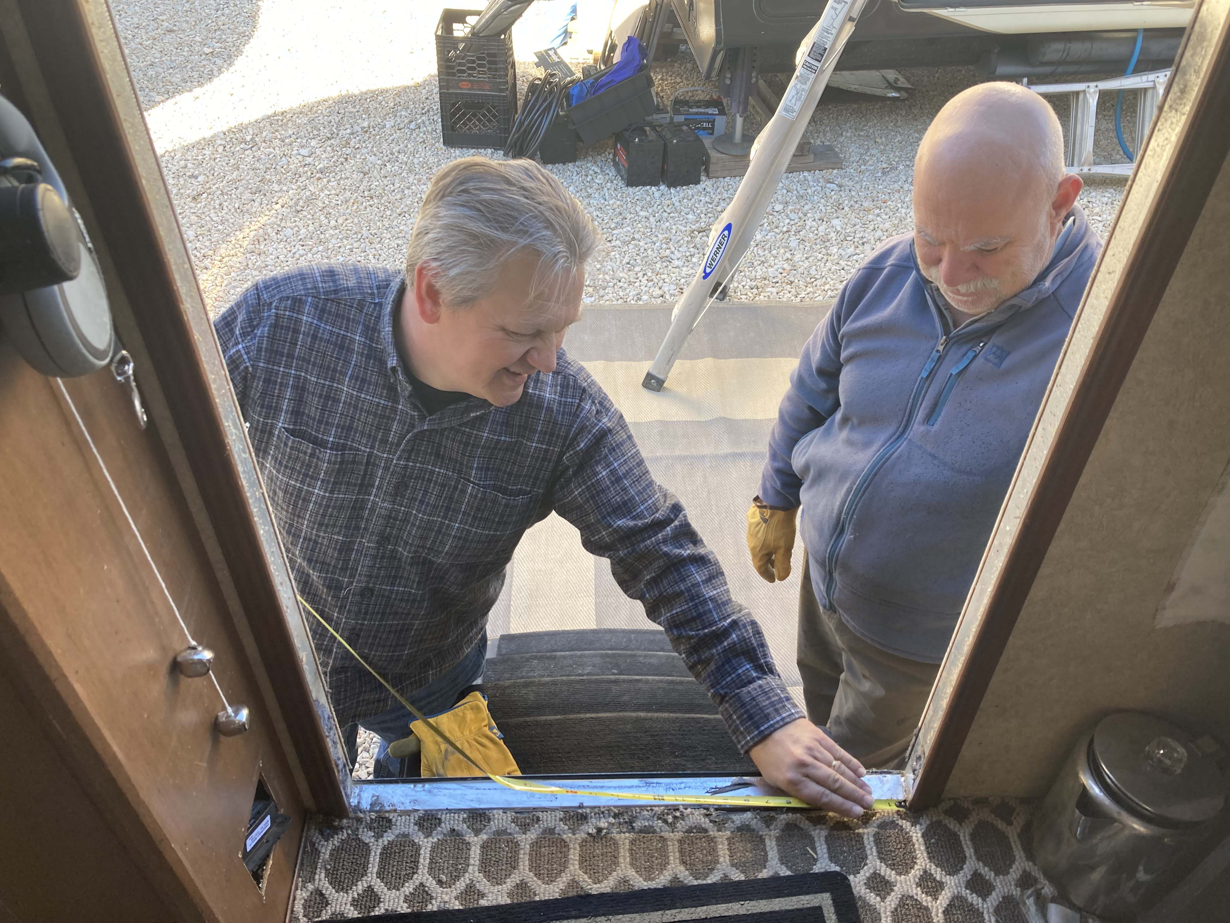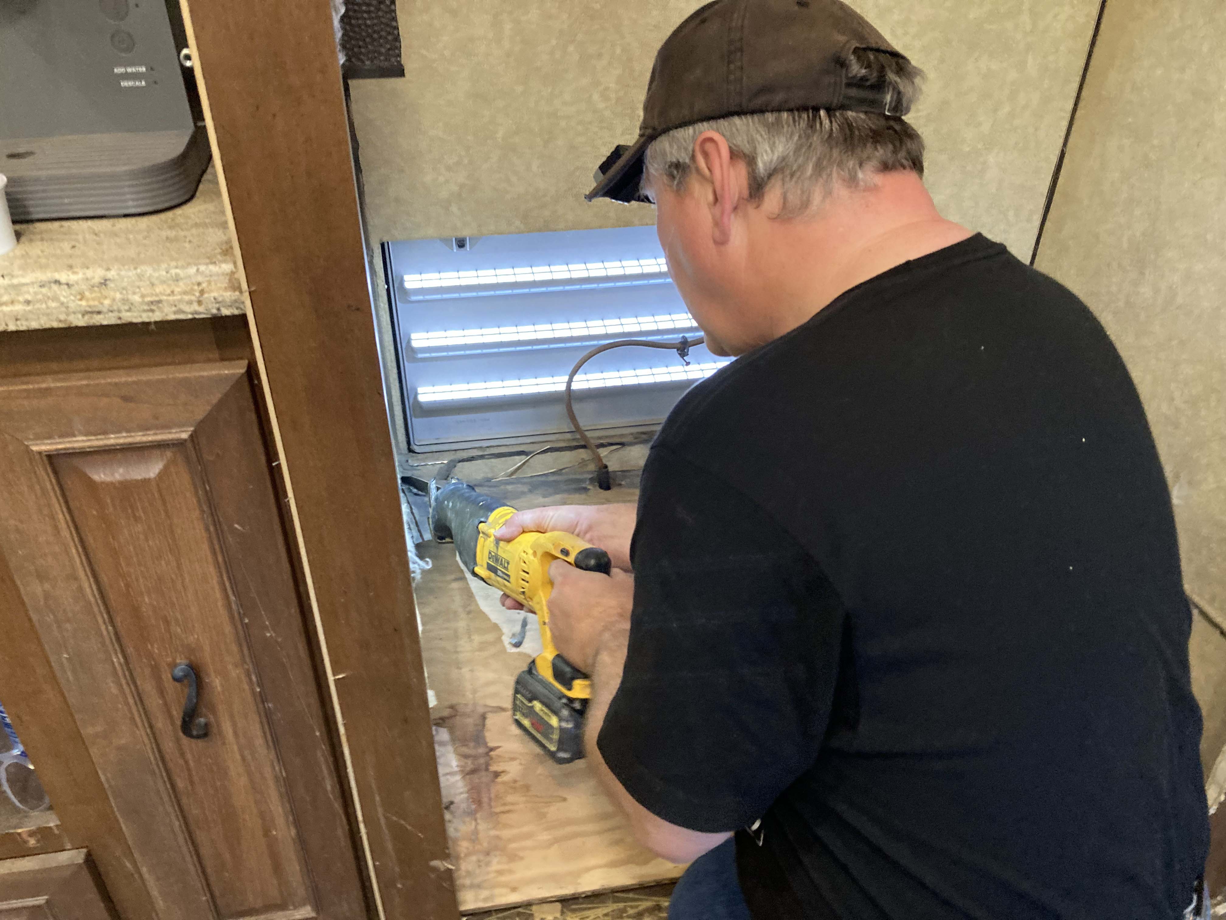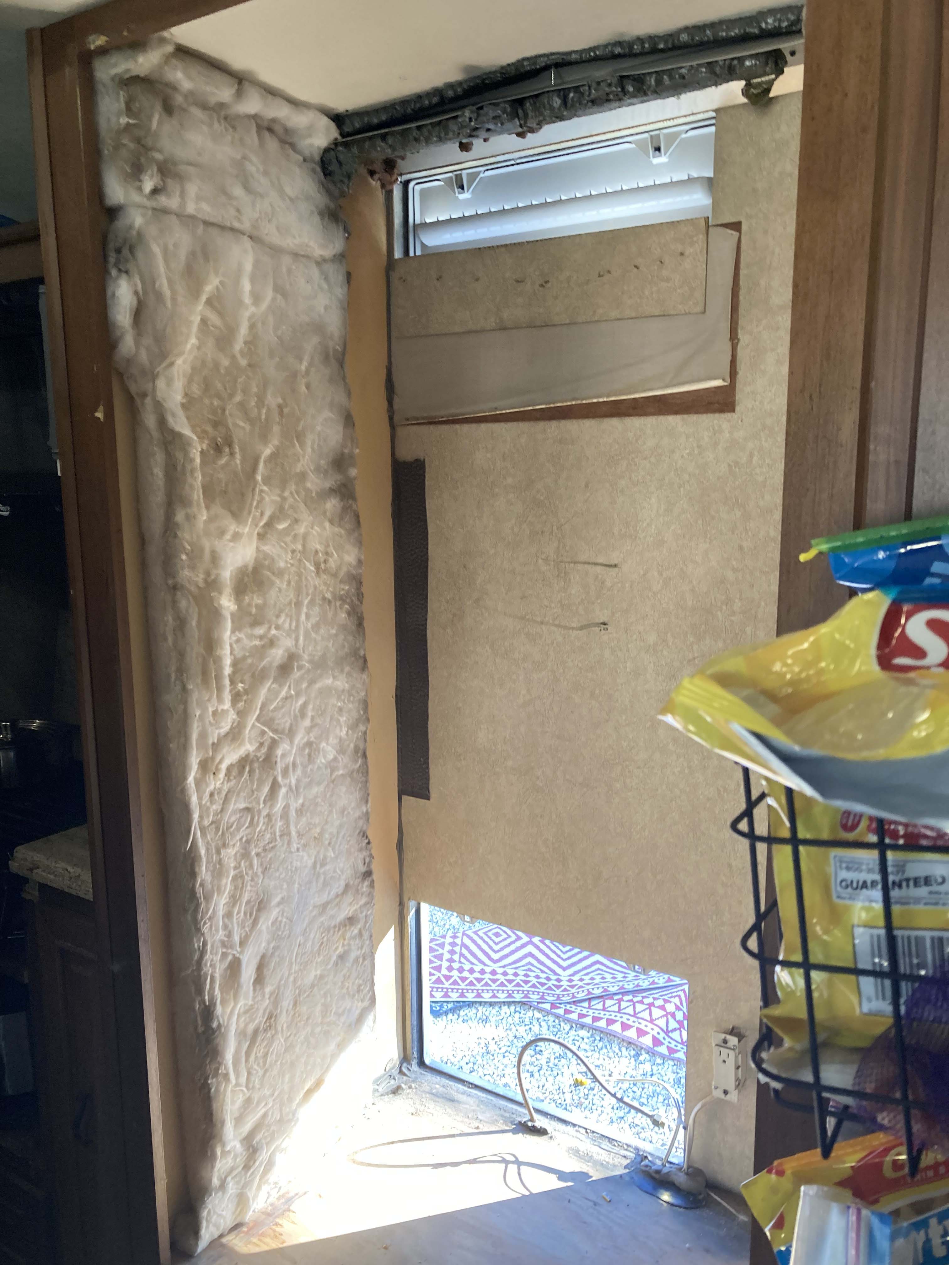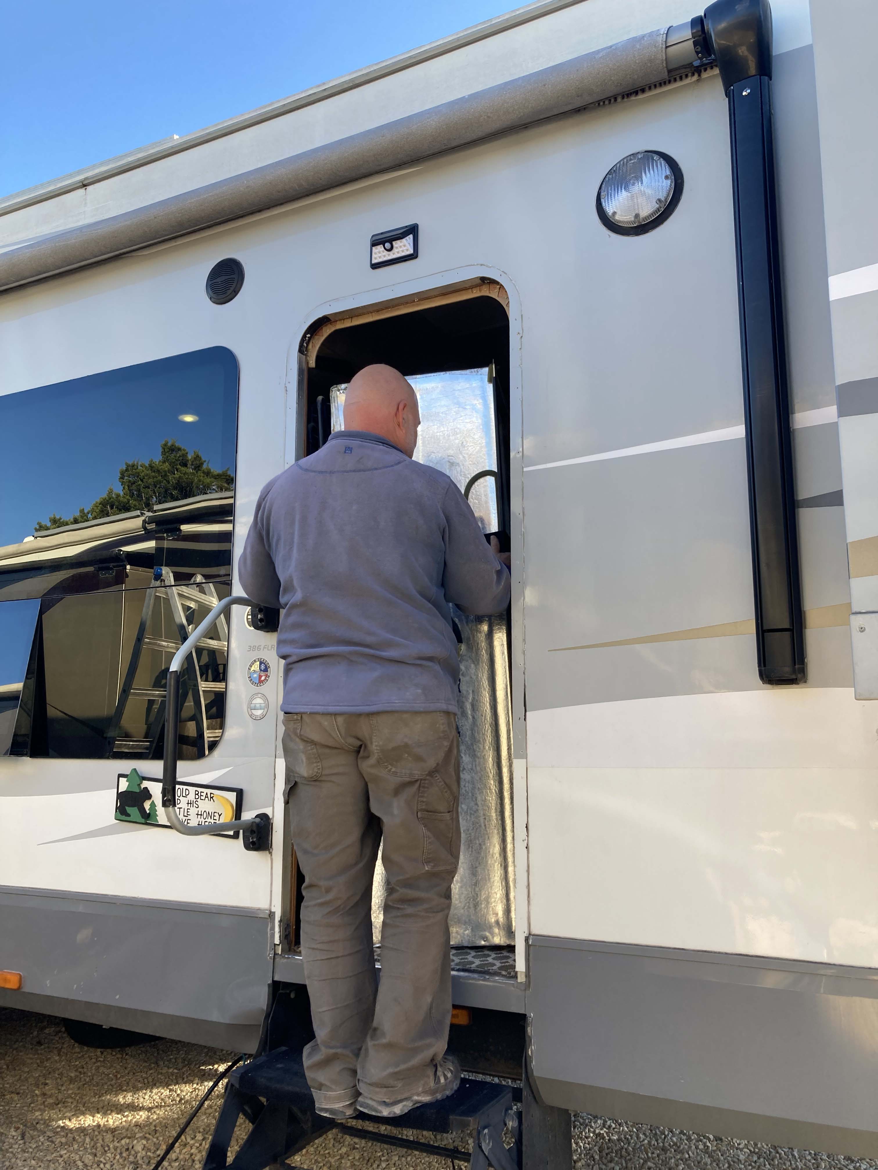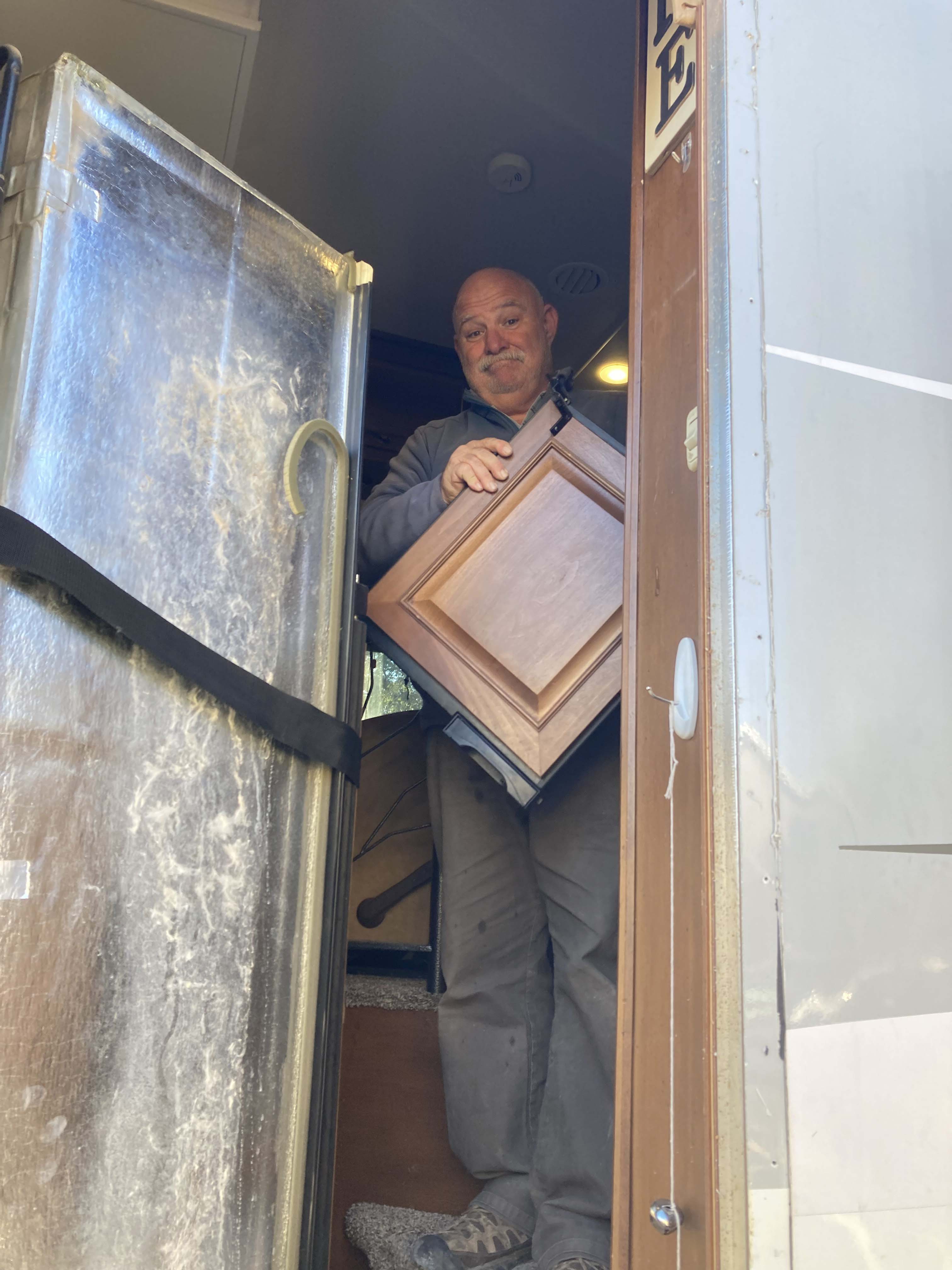 This is not as simple as it seems especially in our RV. Although going in through the window was a choice there were some risks with that (ie: breaking the window) and it would have been much harder to maneuver. Instead Lee started working around the door including taking the door off and removing all the trim. This gave us a 28″ slot which was just doable if we took the doors off both fridges.