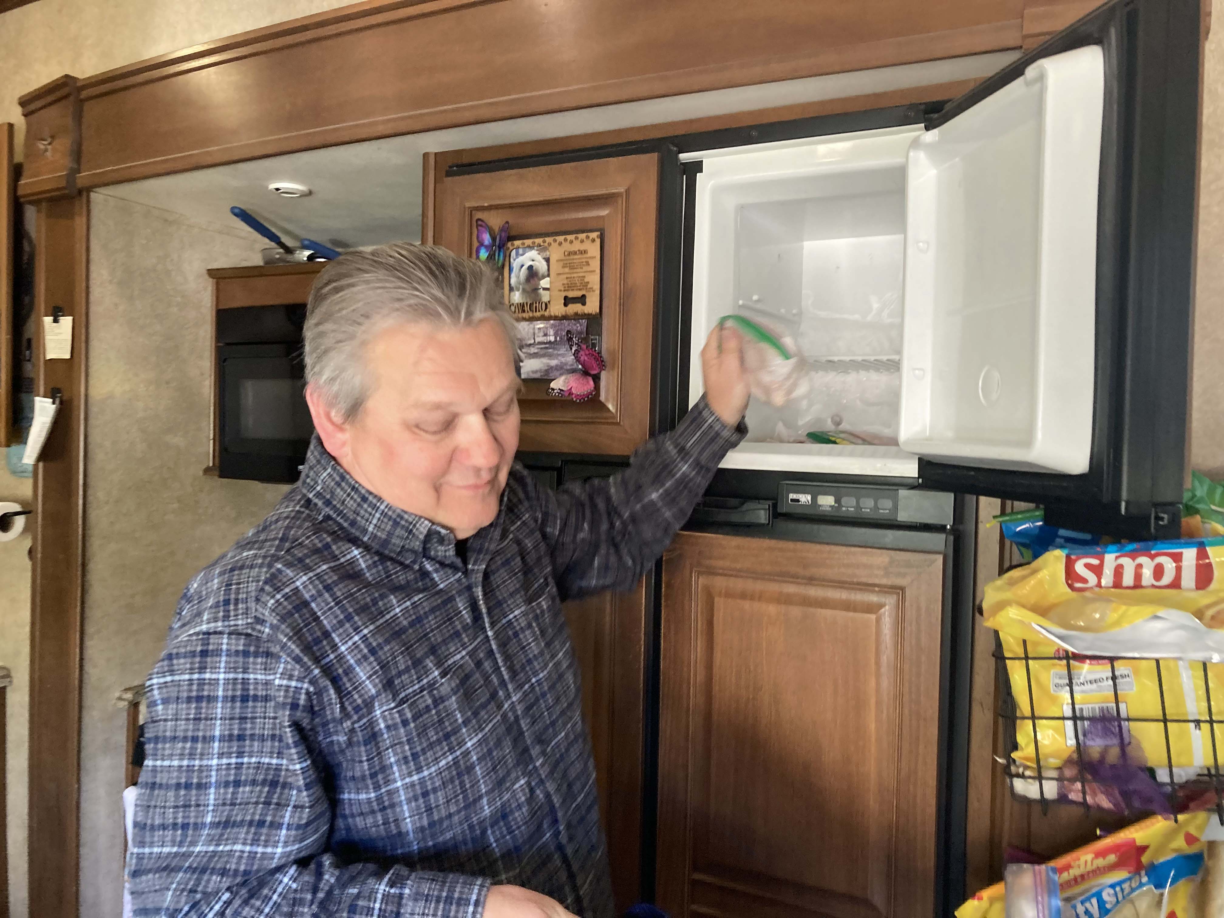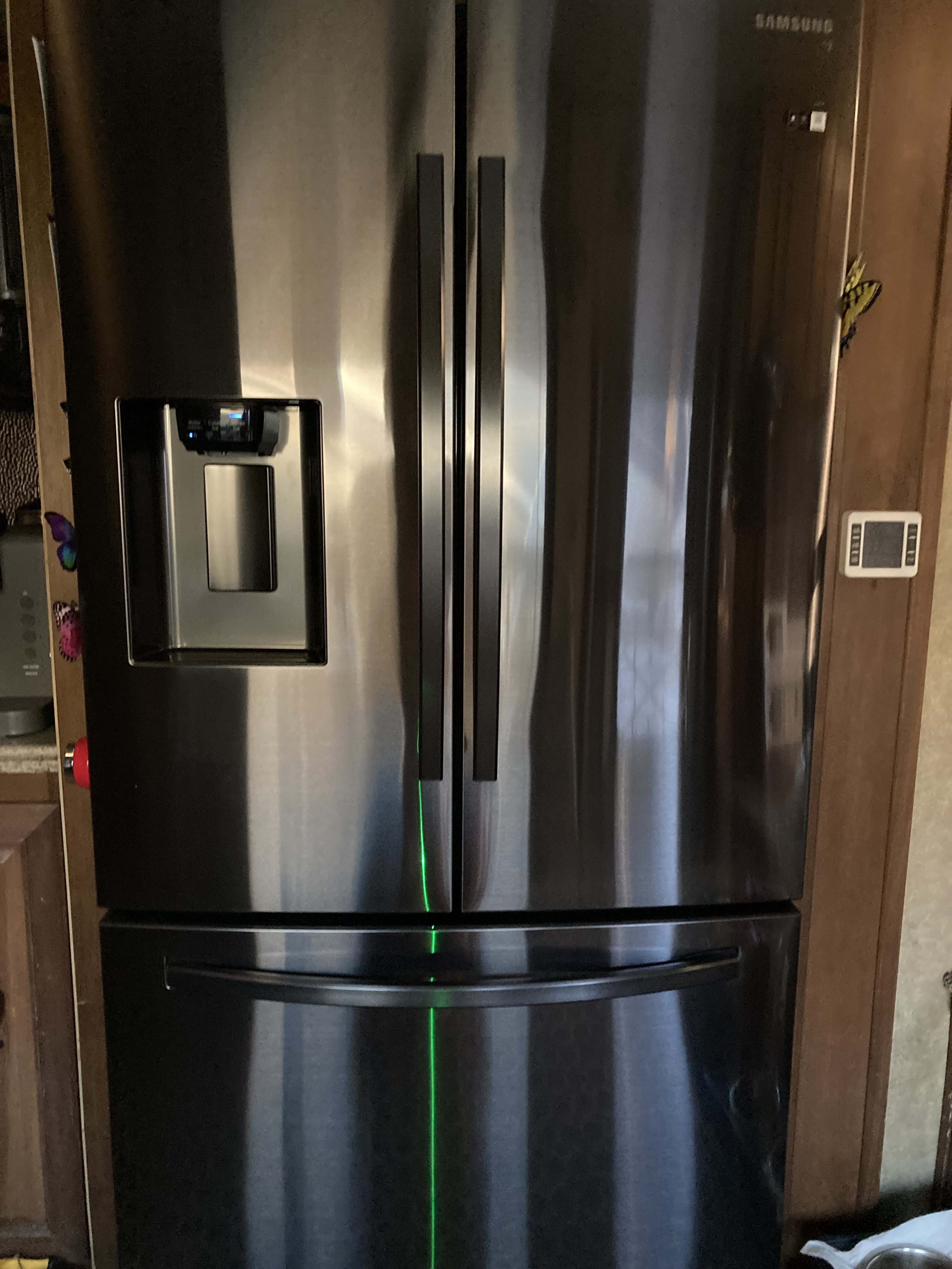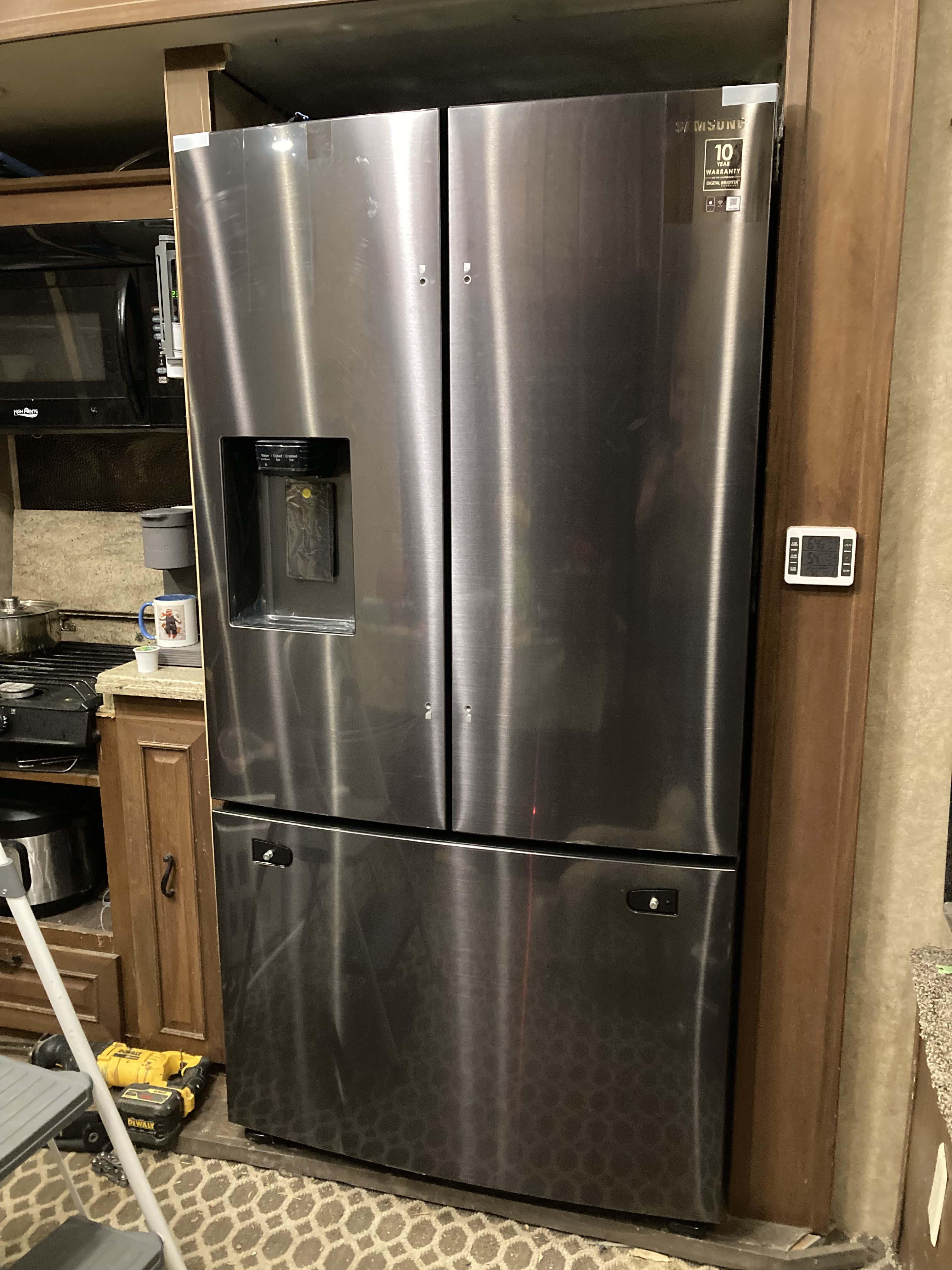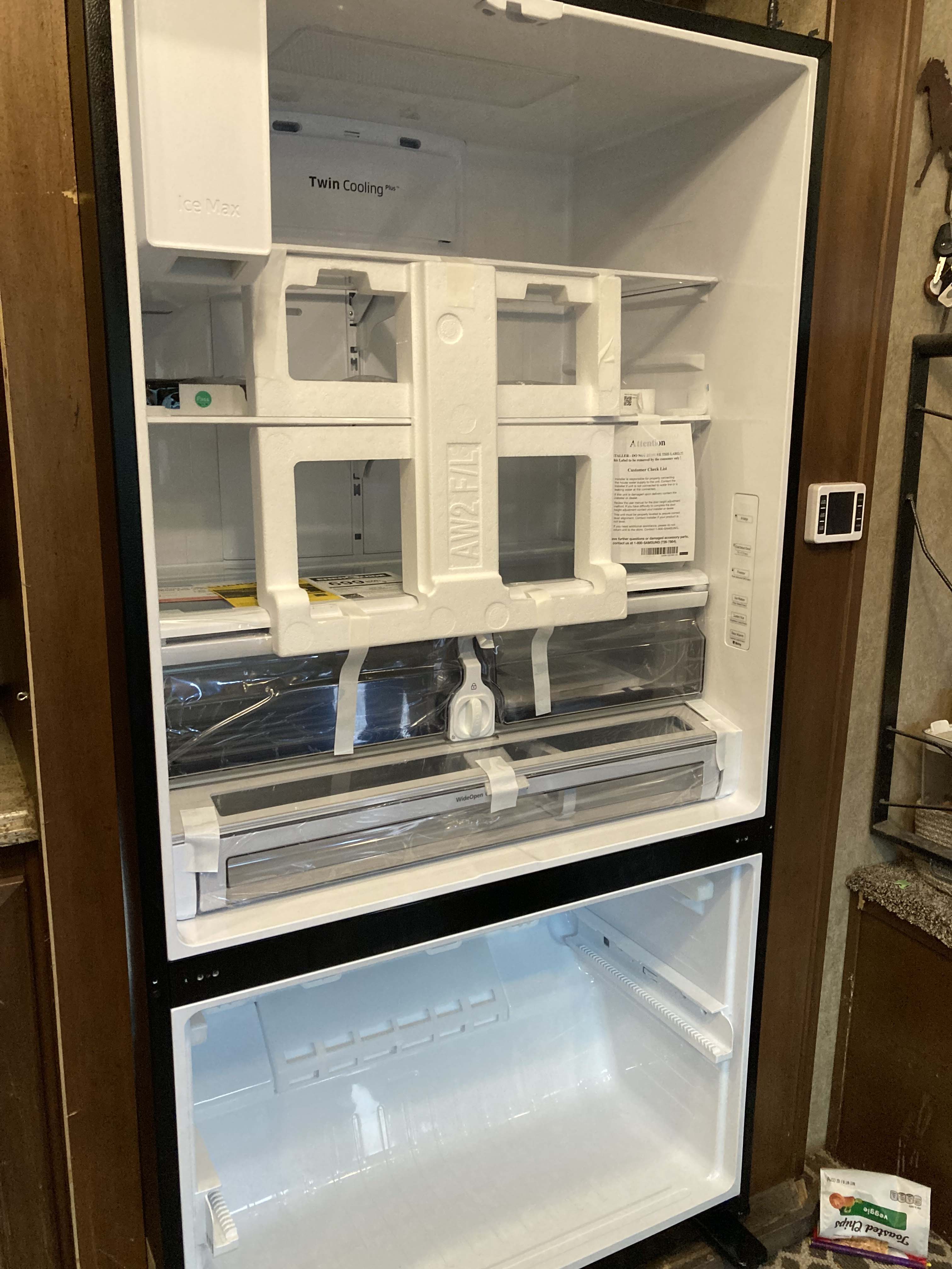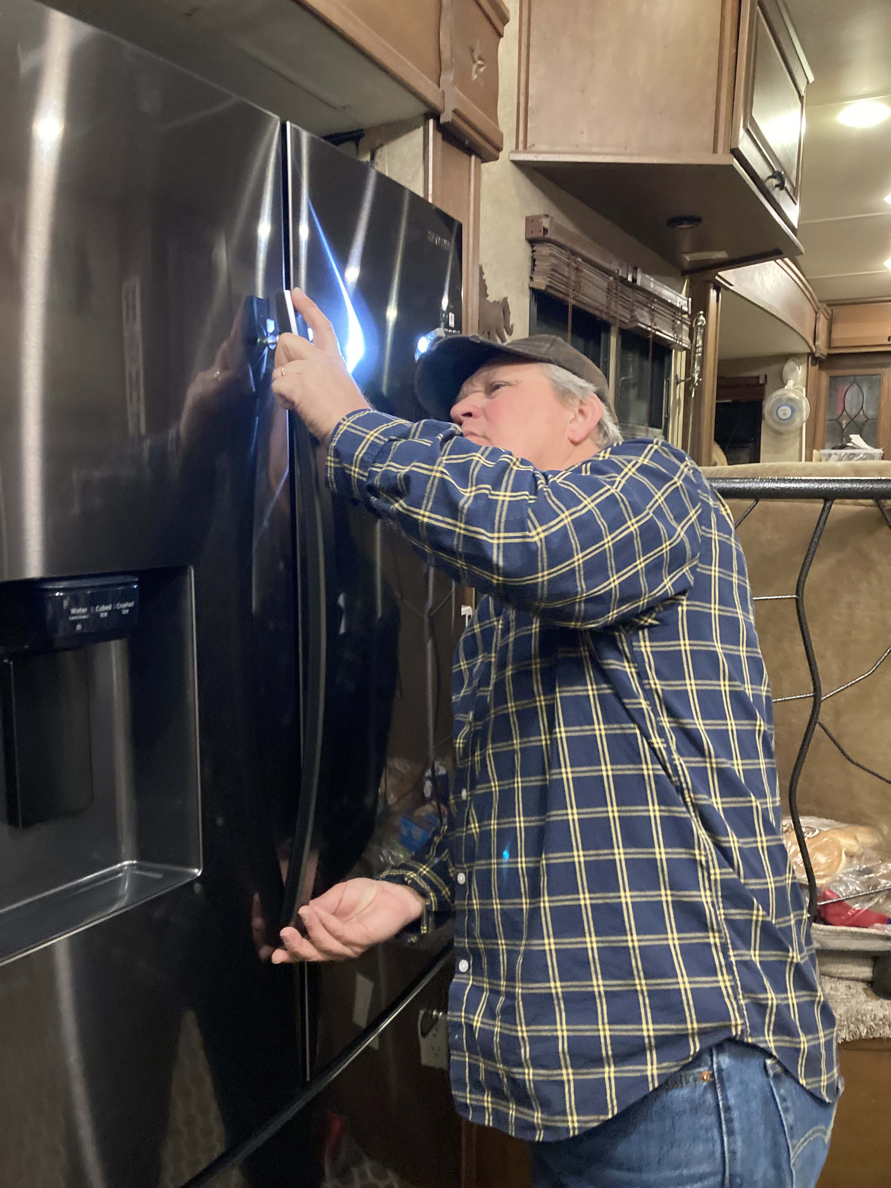 Just deciding to replace the fridge was just the first step as Lee had to do quite a bit of research to determine what we could get. Our refrigerator is in a slide and the spot was shallower than many residential models so we could only buy something 30″ deep and 32″ wide. Plus we have a very small door in our RV and unless we wanted to remove the large kitchen window (that was on the table for awhile) we could only buy something that would fit through the door. Lee, knowing his audience, took me to Home Depot where the refrigerators were all lined up like soldiers and pulled forward all of the refrigerators that would fit, which allowed me to ignore the ones I couldn’t have. That left us with around 9 choices and I happily compared them. Ultimately it was a battle of the freezer as I chose the largest freezer I could find in that size range.