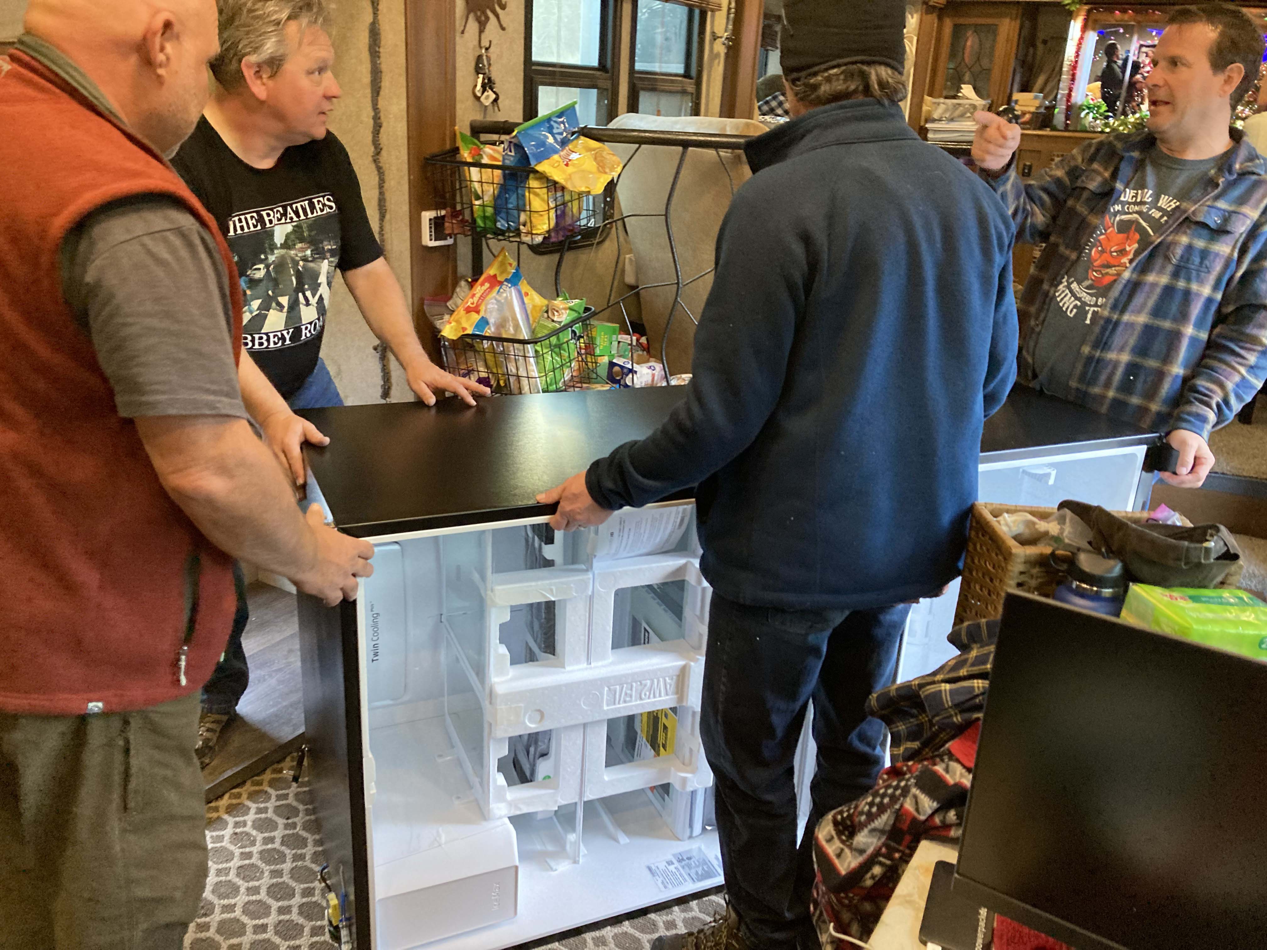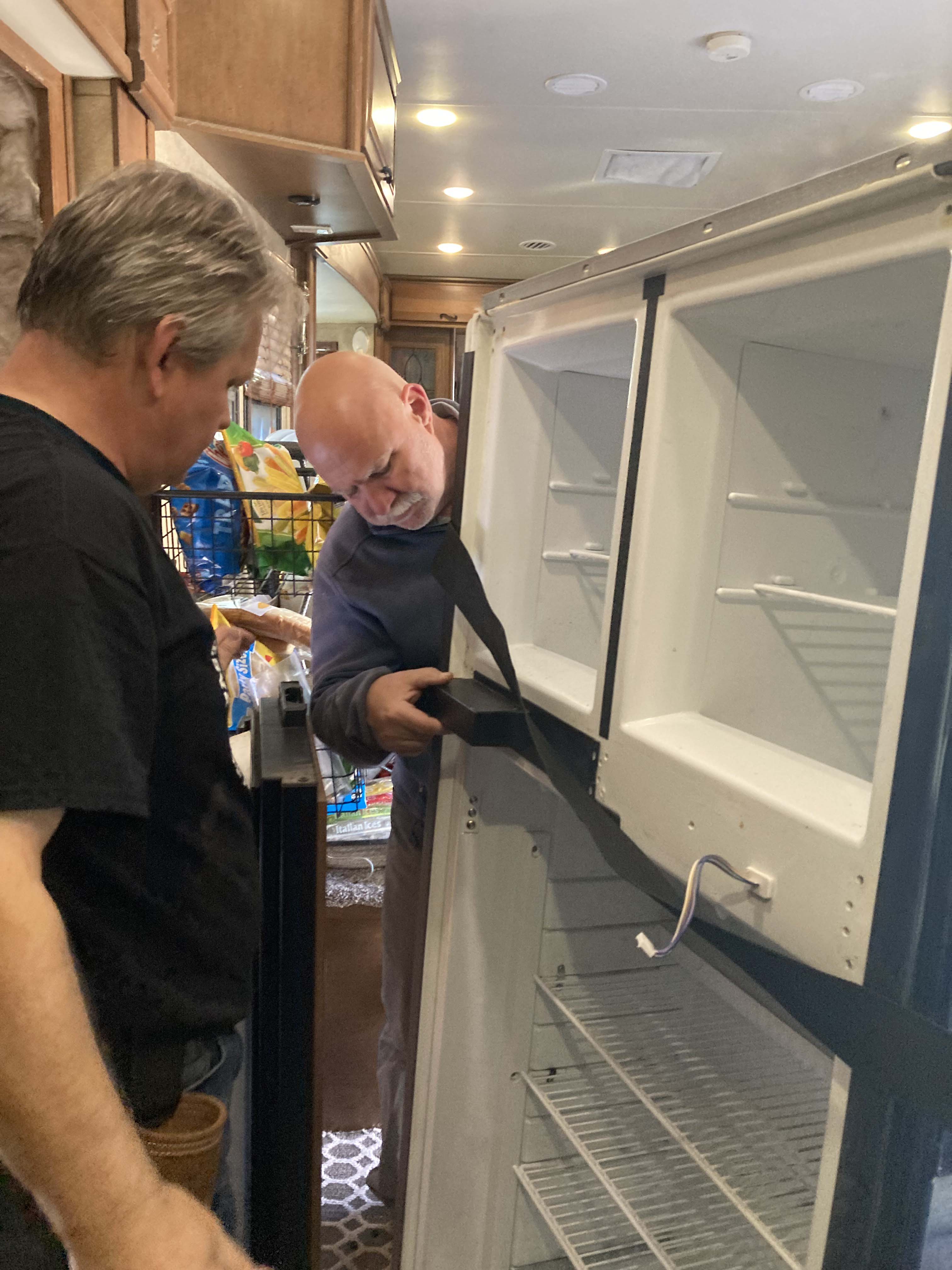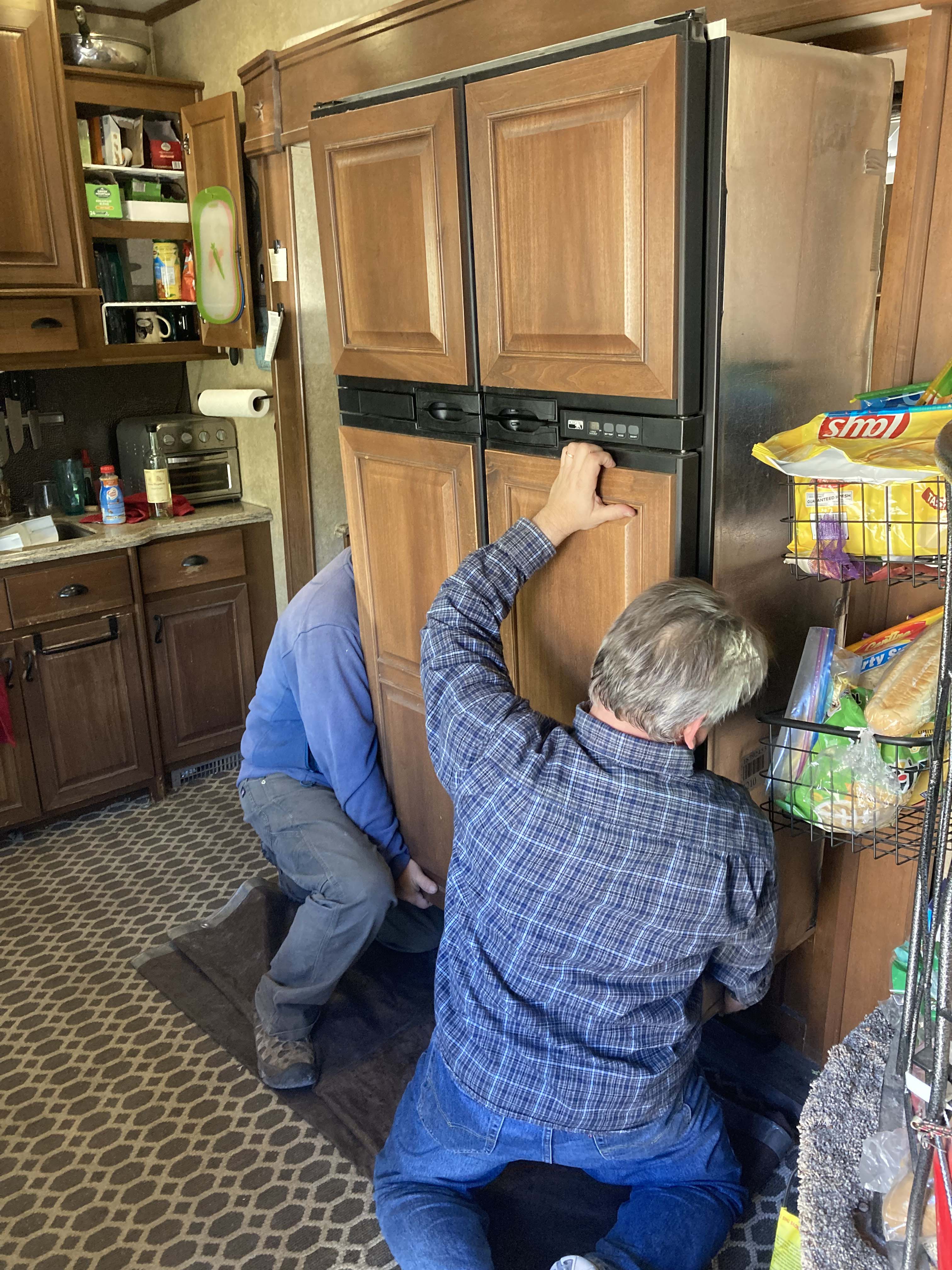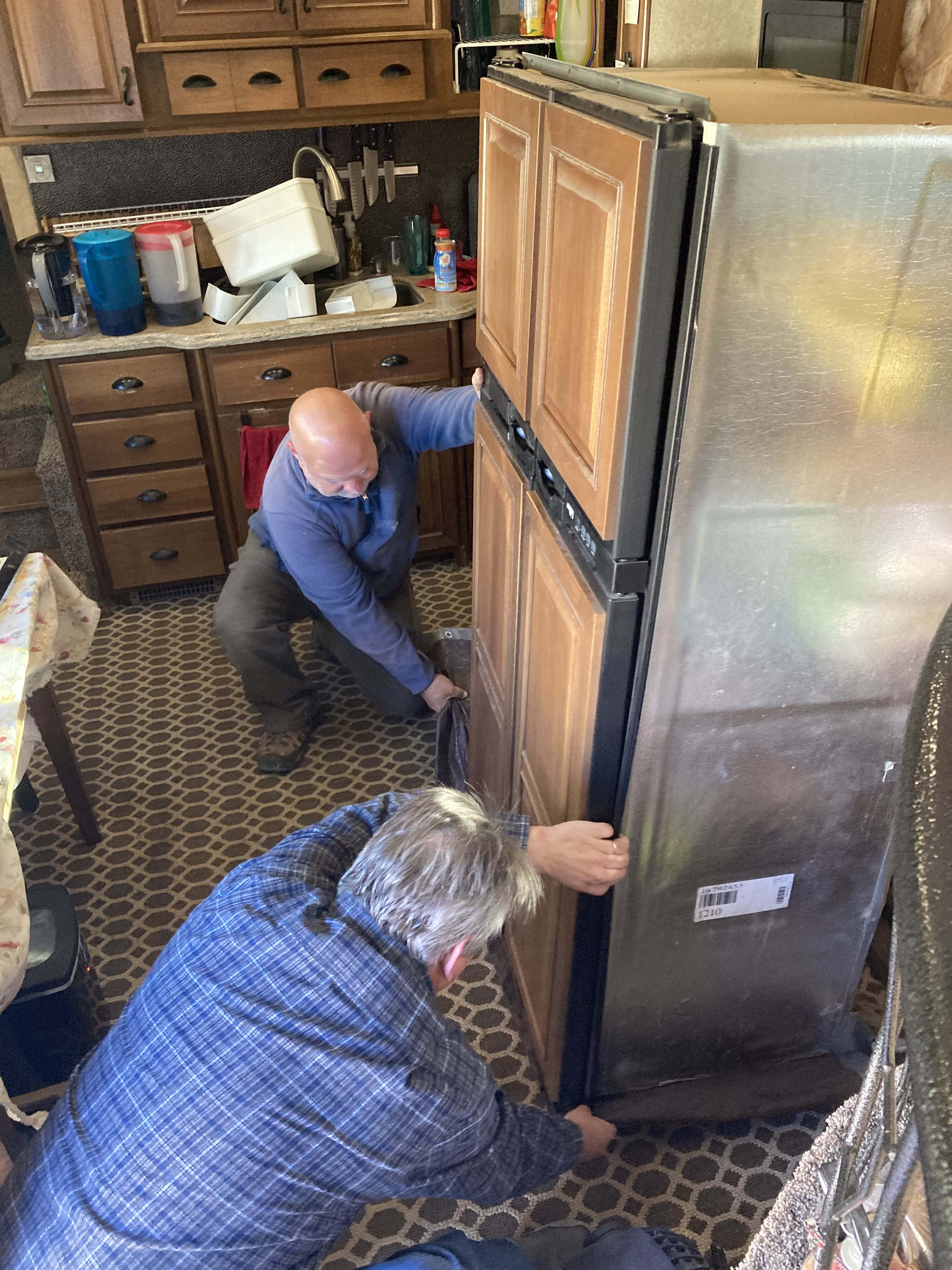 Largely I thought the tradeoffs were worth the flexibility, but Lee got disenchanted pretty early on. He wanted to swap it out for a residential style fridge several years ago but I got stubborn (shocking) and didn’t want to mess. I did agree though when the fridge died we could replace it with a residential model. So we waited for the fridge to die, and waited, and waited and finally when we cancelled our cruise due to COVID concerns I broke down and said sure. Lee was smart; he got Bill and Greg to gang up on me about how our solar system was perfectly adequate to keep a fridge going plus honestly at this point I don’t know why I was stubborn about it.