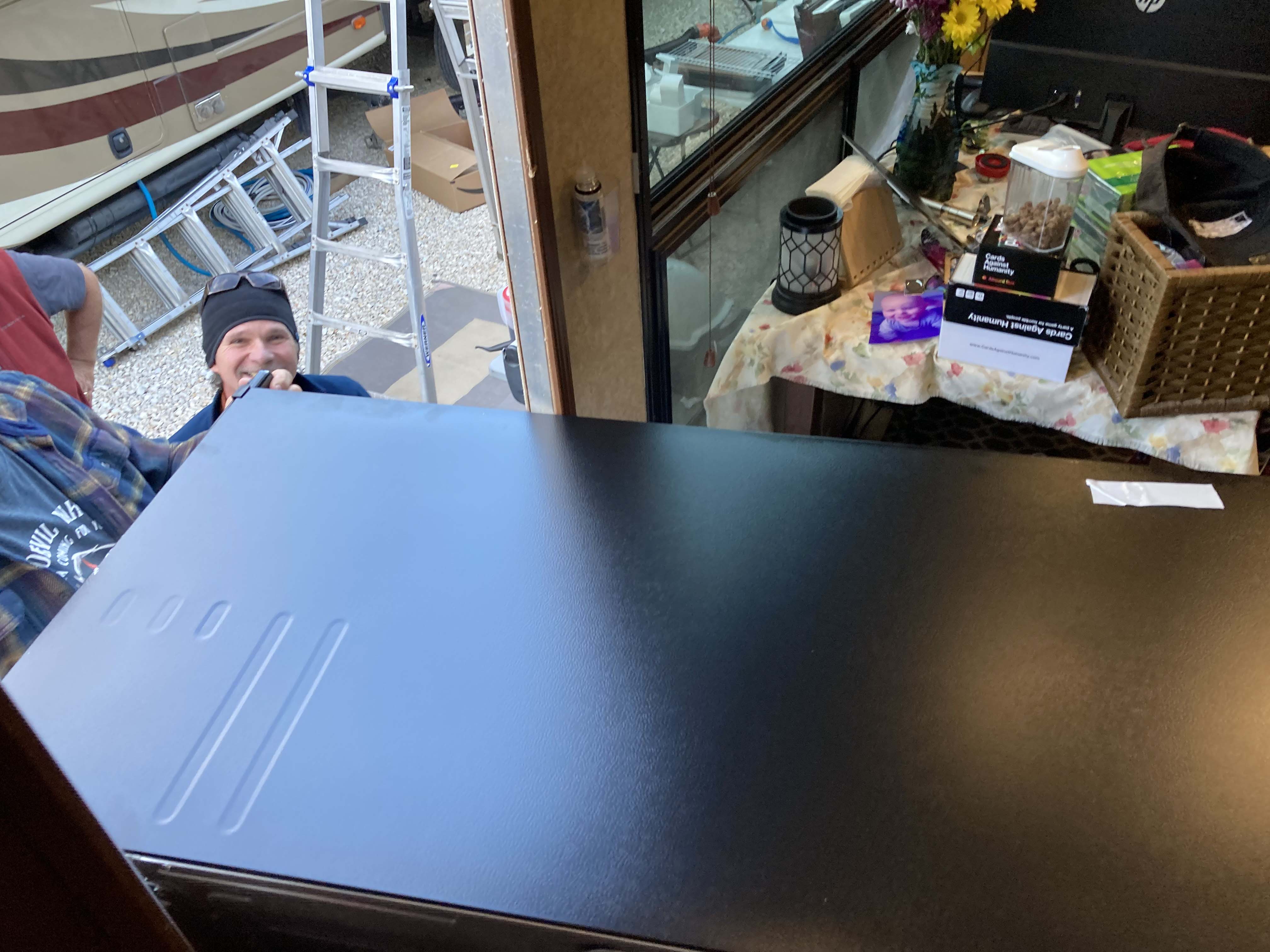 Once the hole was ready Lee had to remove more trim to fit the new refrigerator. We knew this was a tight fit and even though it was lighter than the propane fridge we were lucky enough to have 4 guys to move it. I even got to help at one point because it got “stuck” in the door and since I was inside taking pictures I jumped down and slid it in. The difference in weight is amazing, although this is probably offset by the additional weight of the food we can fit in it.