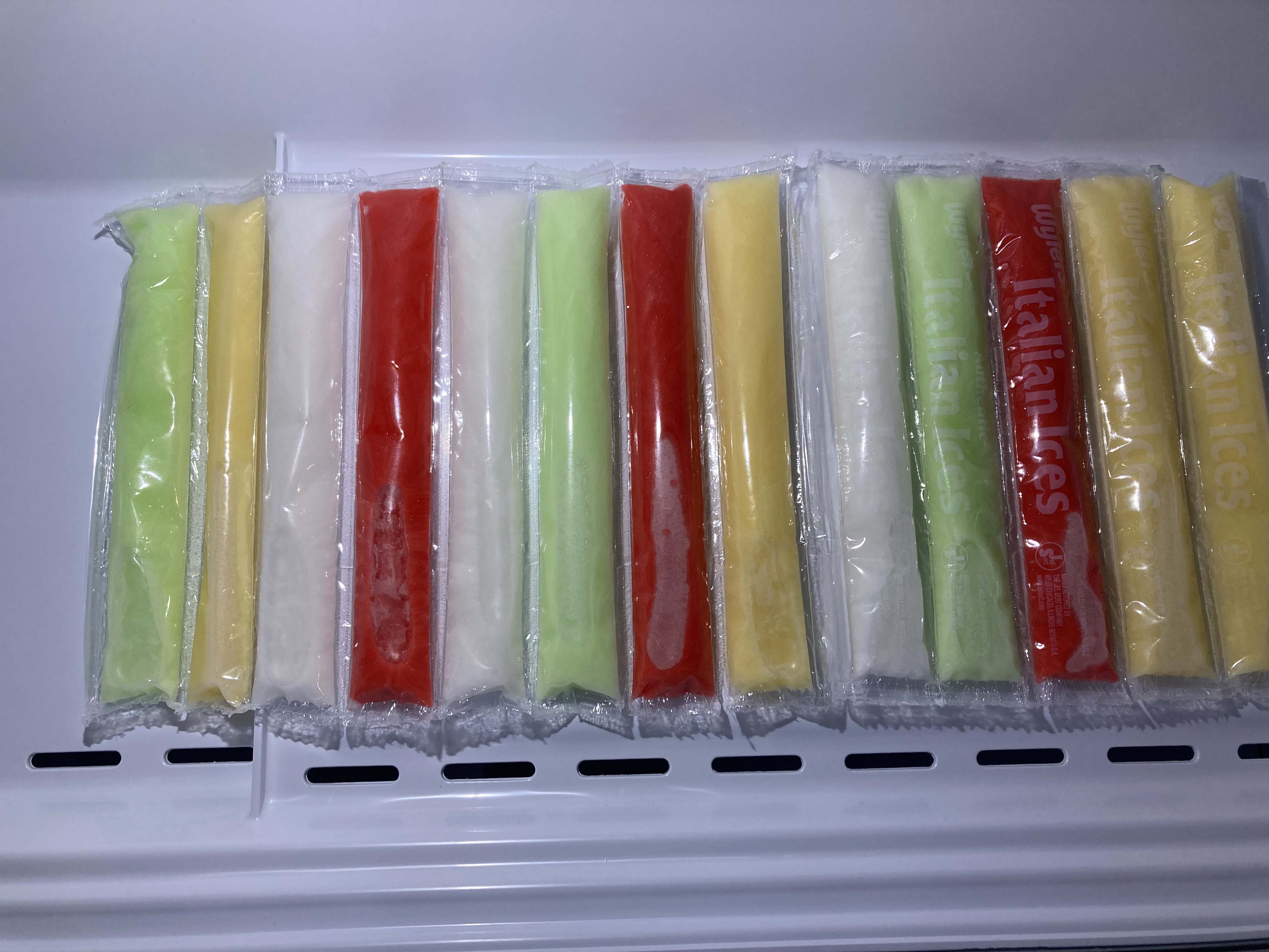 Its not shown here but they also had to manage the cord, so Lee was running back and forth to the outside and getting it plugged in. Then the doors had to be put on and handles attached. Finally it was in! Lastly Lee and I removed all of the thin plastic covering inside and out and we had a refrigerator. We let it cool down overnight before moving our food back in. I used some freeze pops as a test and they were rock hard the next morning!!