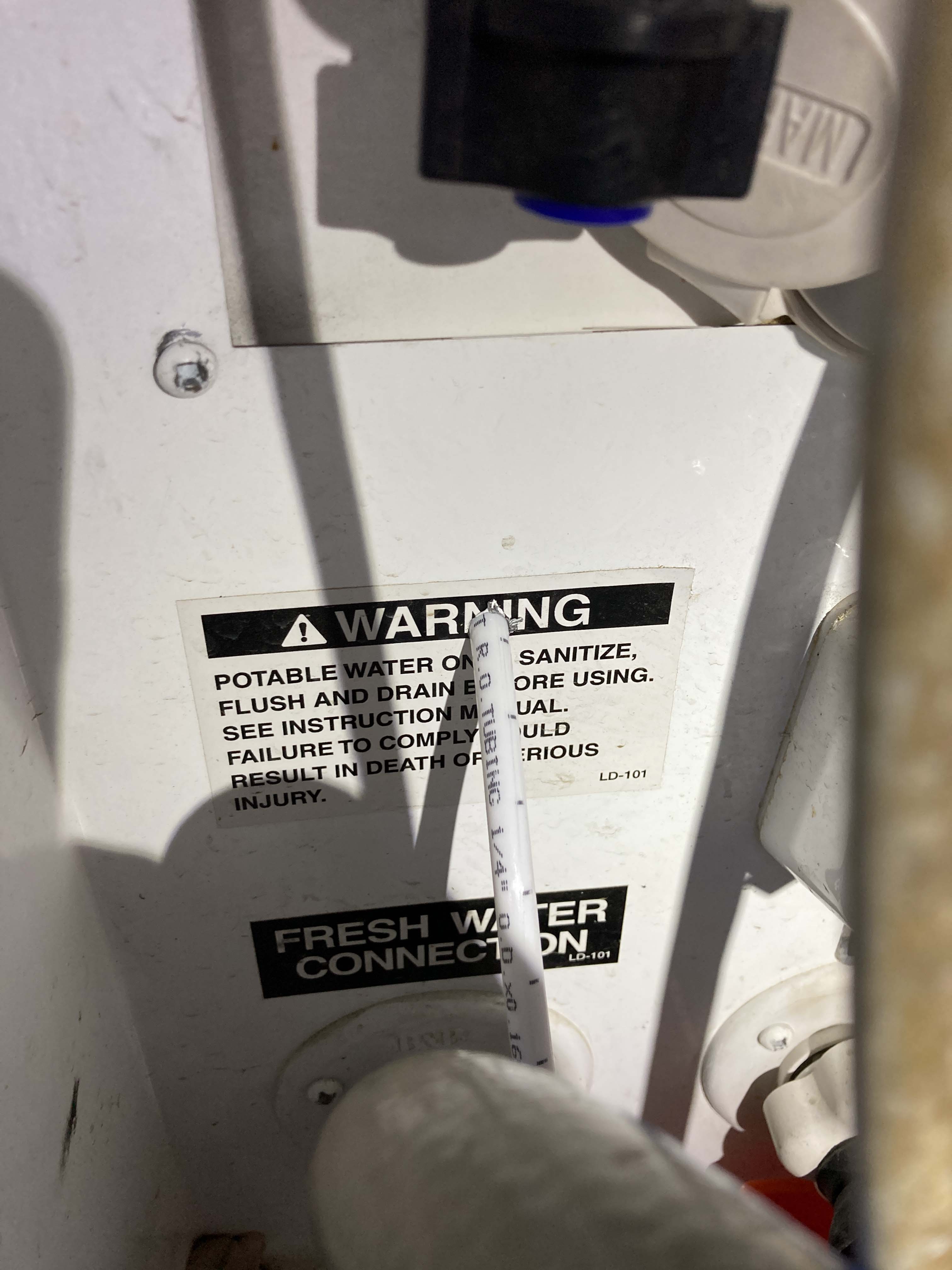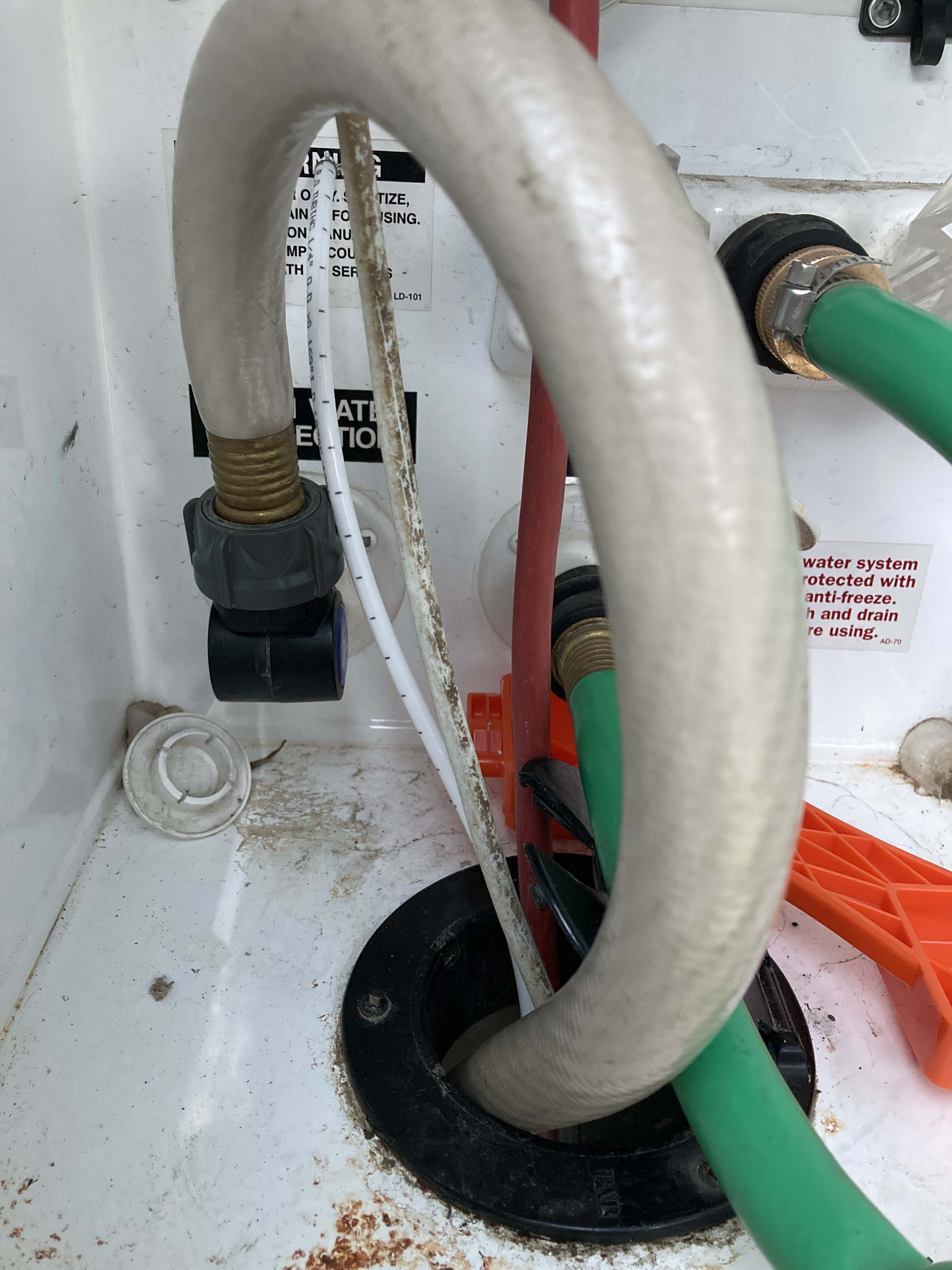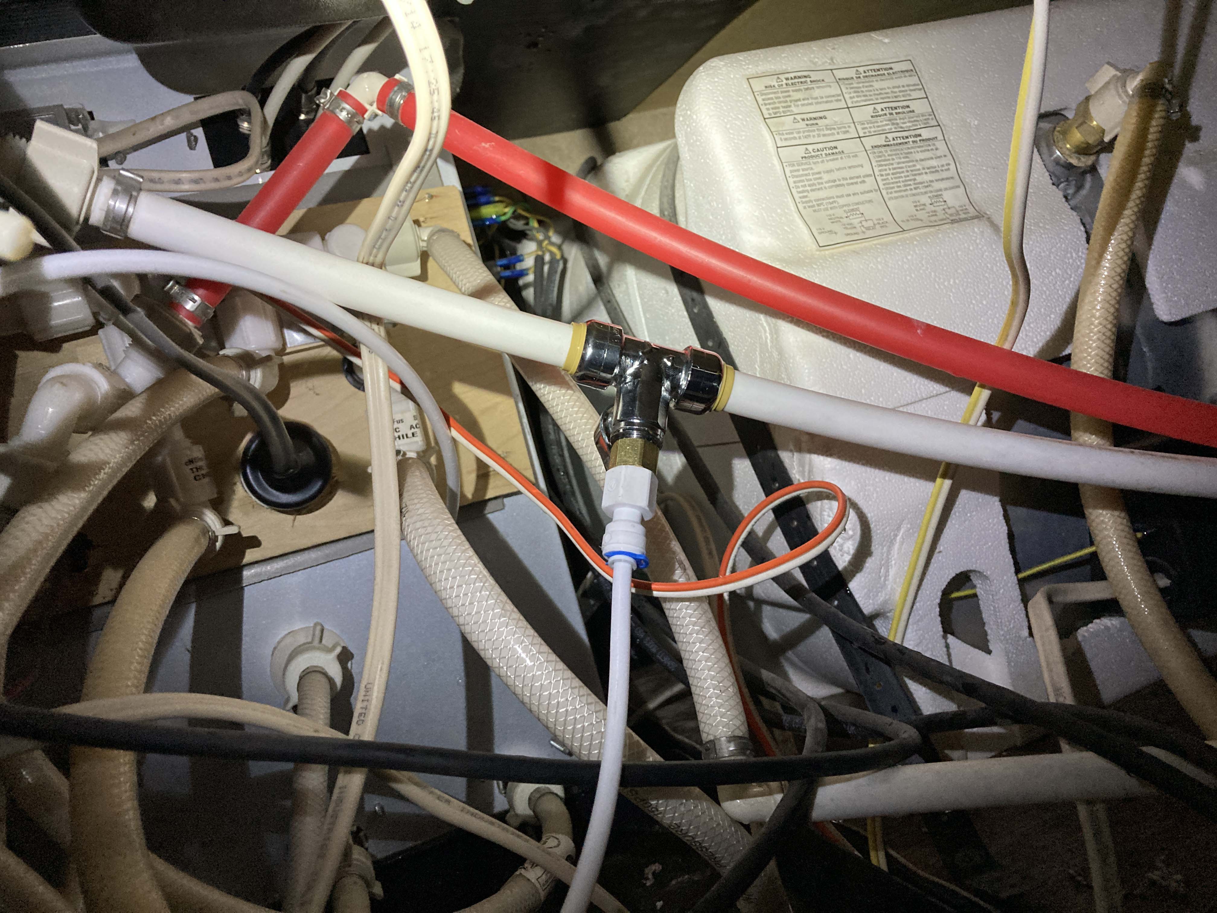 The last thing Lee had to do was hook up water. Because the propane fridge didn’t have a water line he had to figure out where to run it. Ultimately he decided to run it parallel to other lines underneath and although we have had some freeze ups because it’s been SO cold down here, it’s great having filtered water and ice right from the door.