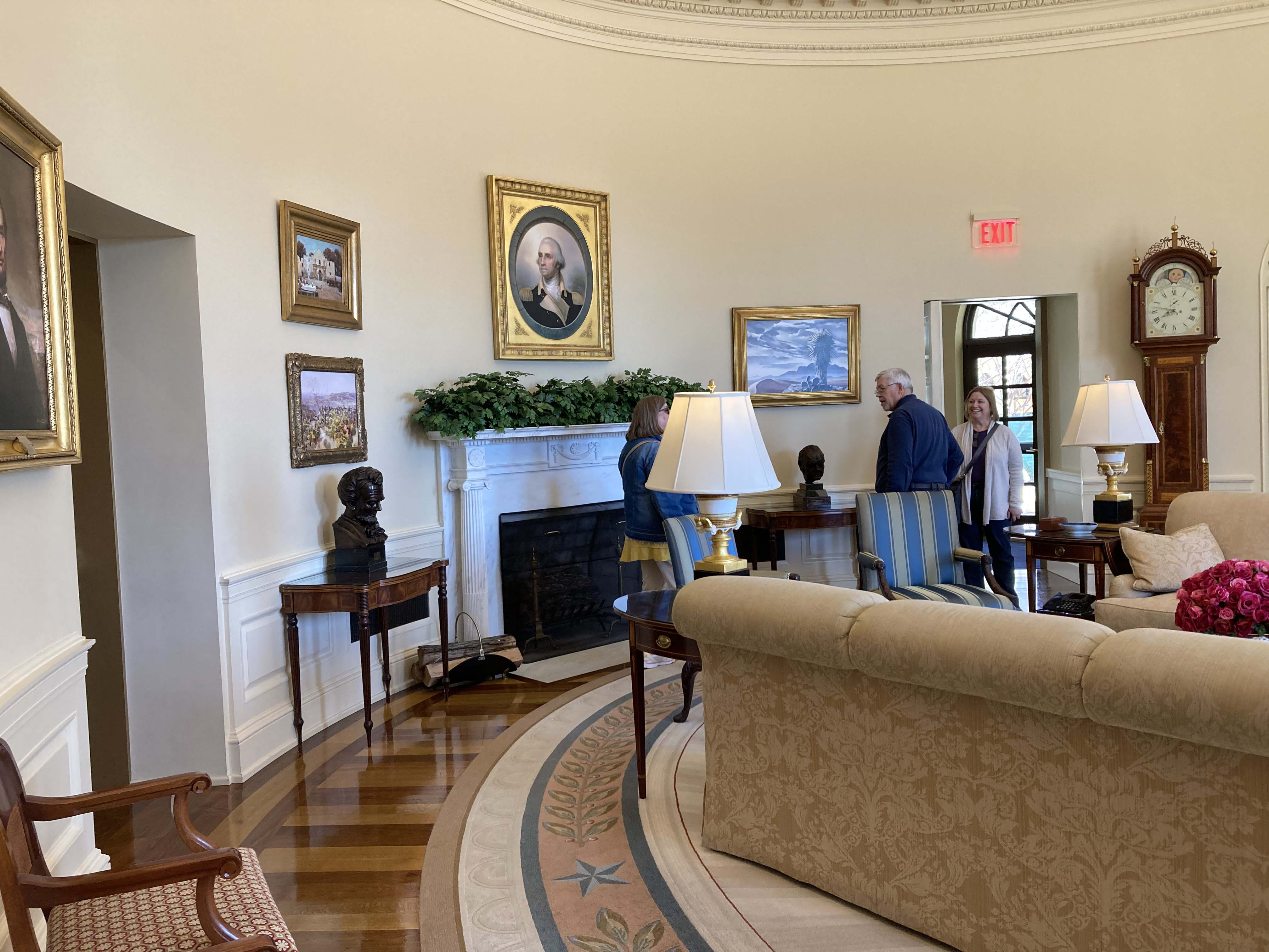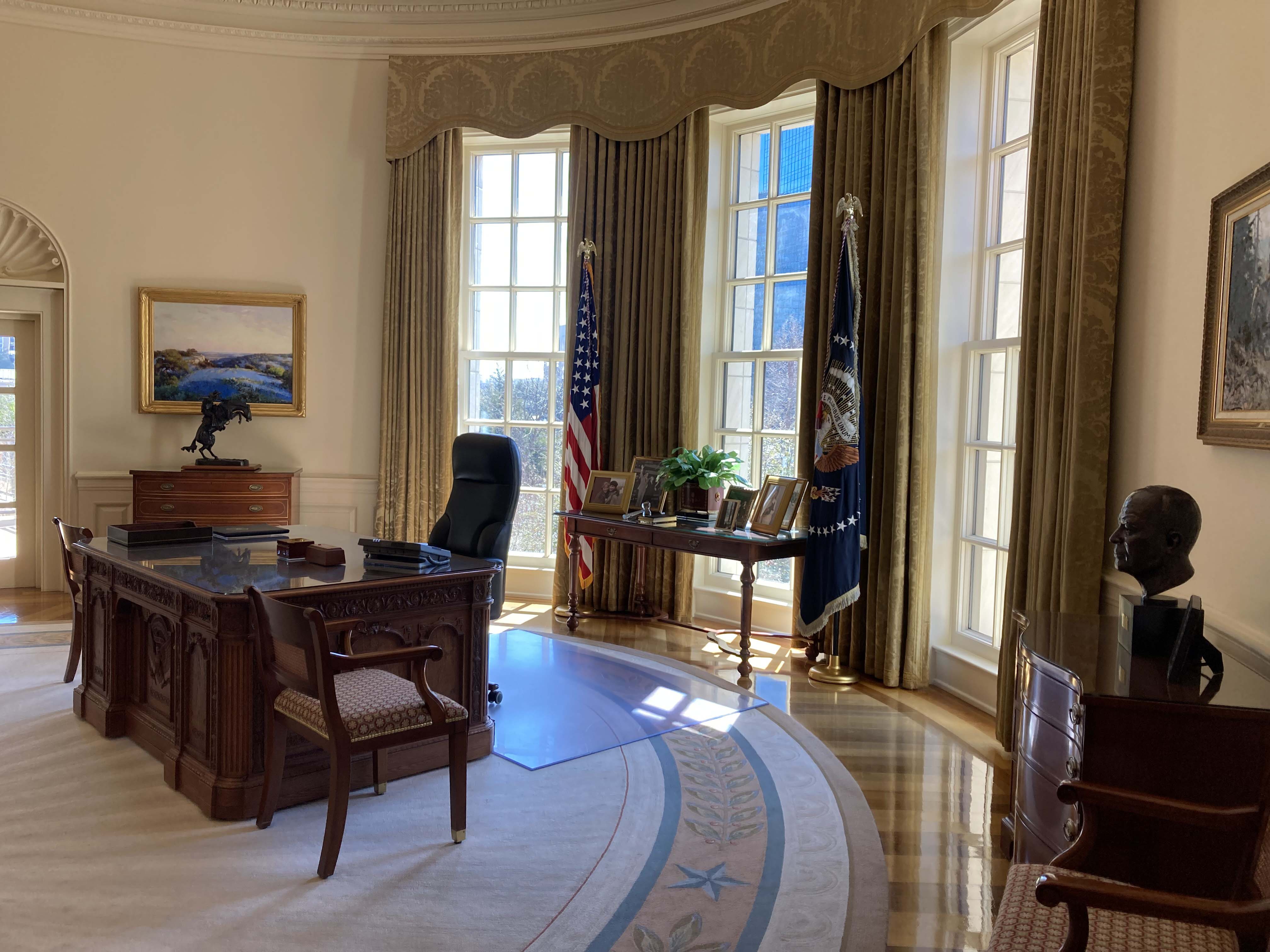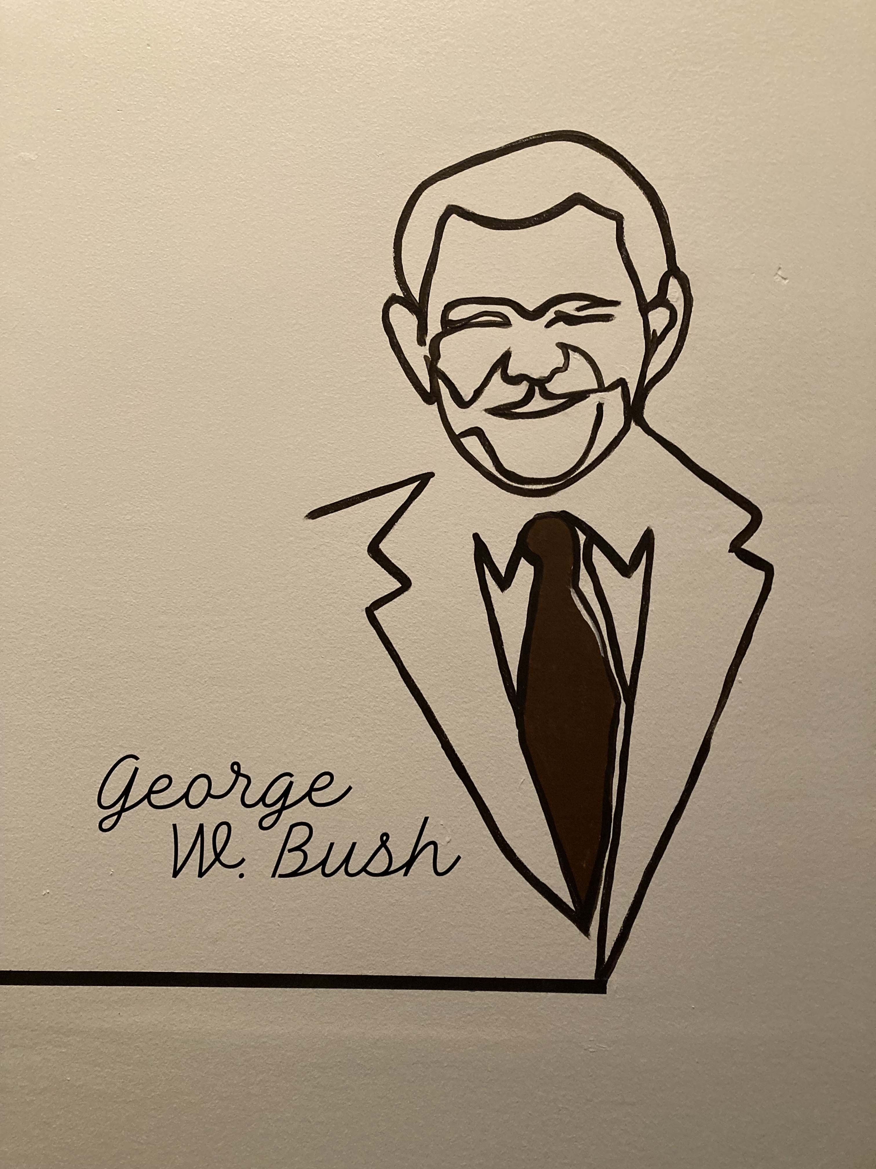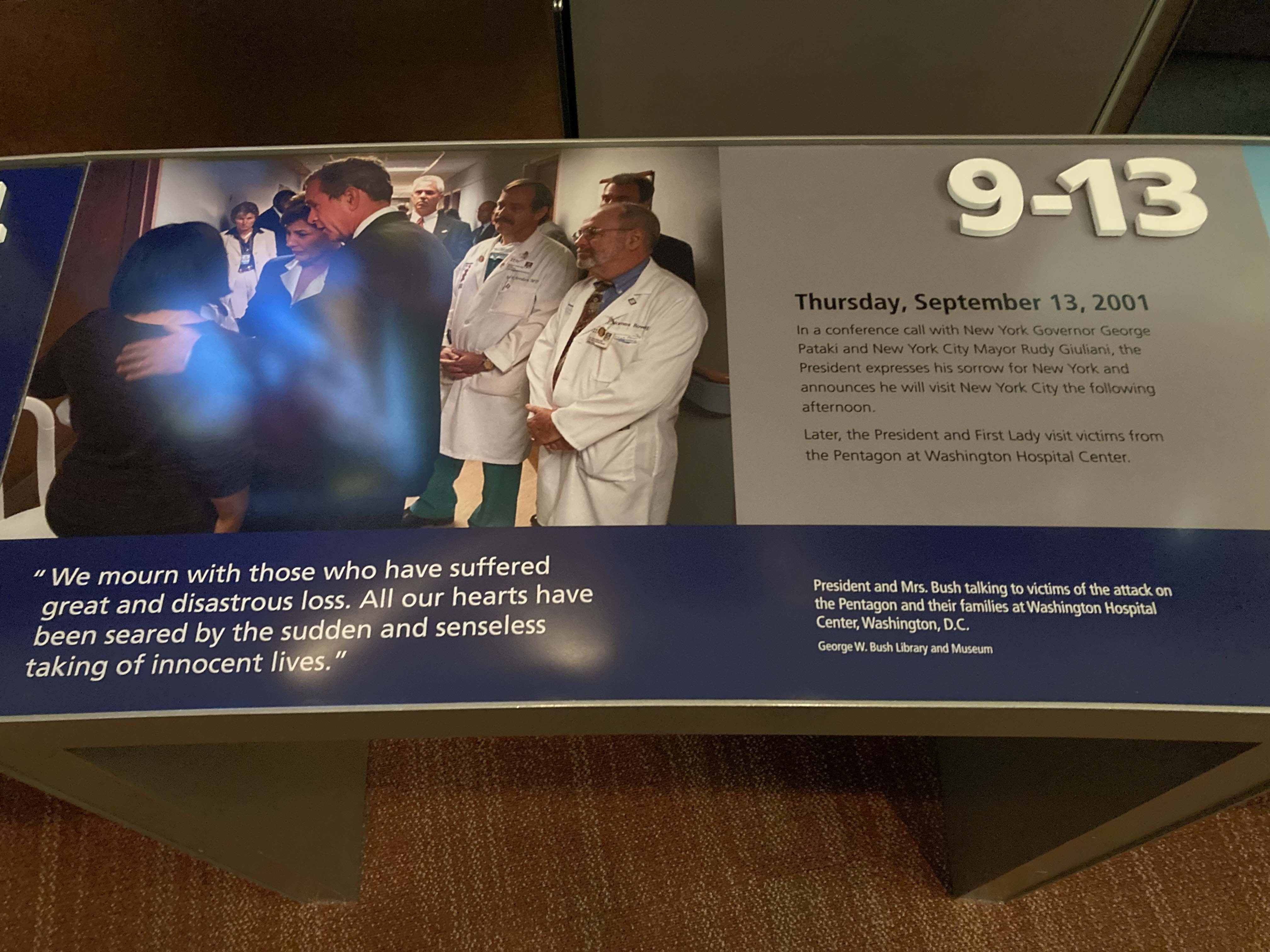 That was all pretty heavy so it was nice when the next section was about the Oval office and GW’s relationship with George Sr. The only other father and son pair to be elected was John and John Quincy Adams and as an inside joke with his father GW had a picture of John Quincy in the oval office. As always I liked the oval office recreation but for the first time they had two photographers in the office that would take your picture. This would be available for sale in the gift shop and both Lee and I felt it was over the top. We particularly didn’t like that they would refer to whoever sat down as Mr. or Madam President and although you could say we took it too seriously, we feel strongly about the symbolism of the oval office and president. That being said a little girl sat in the chair while we were there and looked delighted.