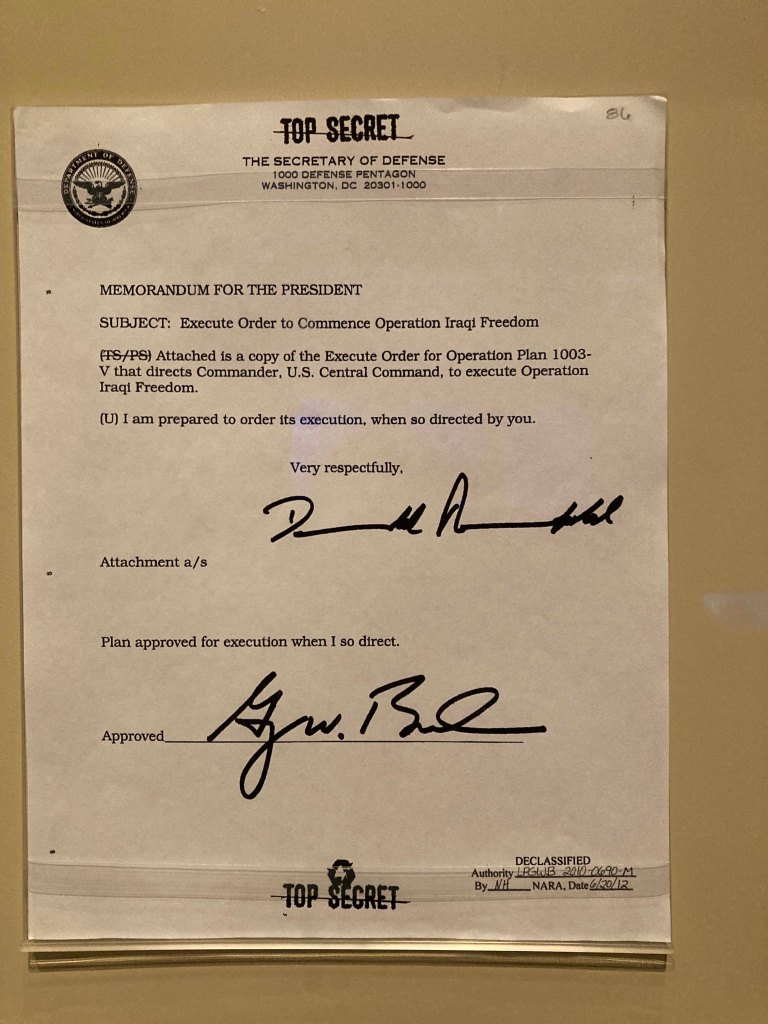 Like his father’s, the GW Bush museum is located on a college campus, in this case it was Southern Methodist University. It is a beautiful campus and the library has a central location. Again, we went at noon on Sunday (this time slot has been great for our visits) so parking wasn’t an issue, but it is a relatively small lot and there is a fee for parking. In addition the library costs $26, which we both thought was on the steep side. We paid it though, as this visit was the main reason we came to Dallas and went through security into a beautiful foyer.