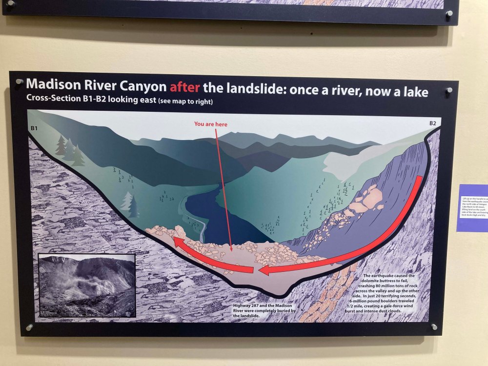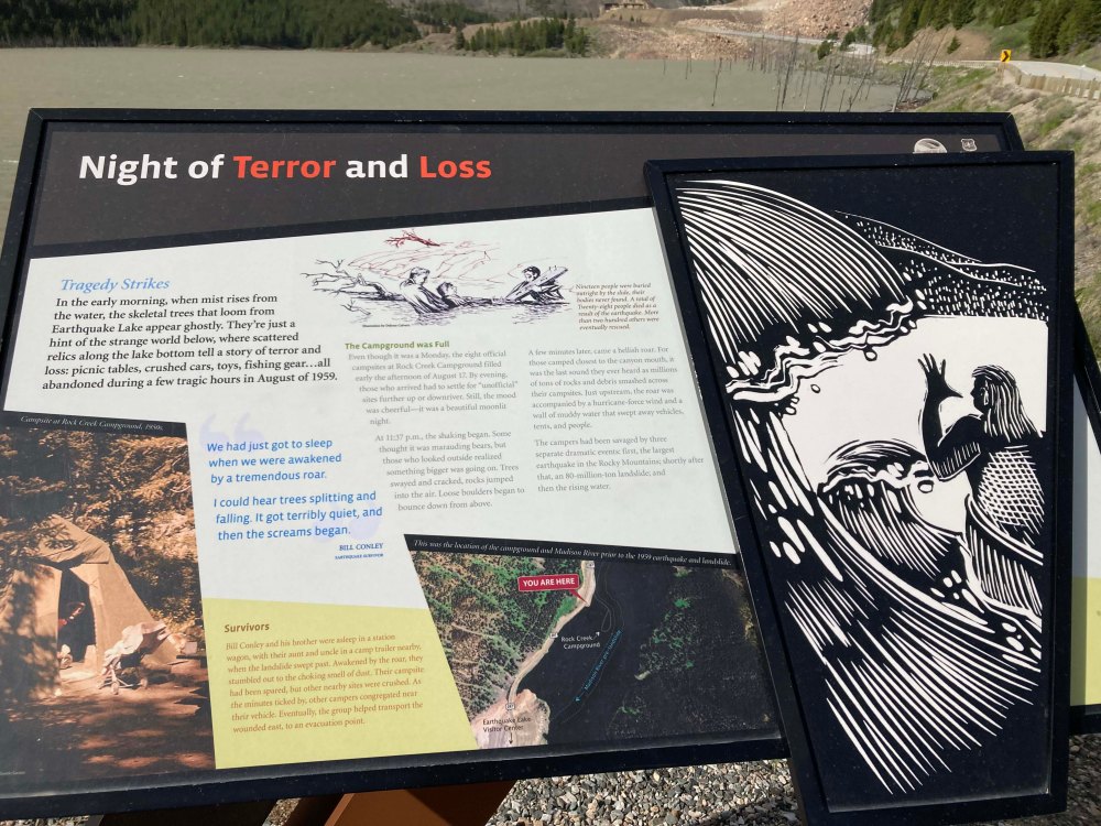 Ultimately we had a quick sandwich and then headed down to Quake lake. Thankfully the visitors center was open until 6pm so we had about an hour to see it. Quake Lake is the site of a natural disaster in the 1950’s where an earthquake sheered off a piece of mountain flooding an area where a campground was located. Nineteen people died in the event and it was extremely traumatic for those that survived. It also had created a new lake and the remains of the campground lie beneath it. For me it was a little morose but if you are interested in natural disasters you should definitely visit.