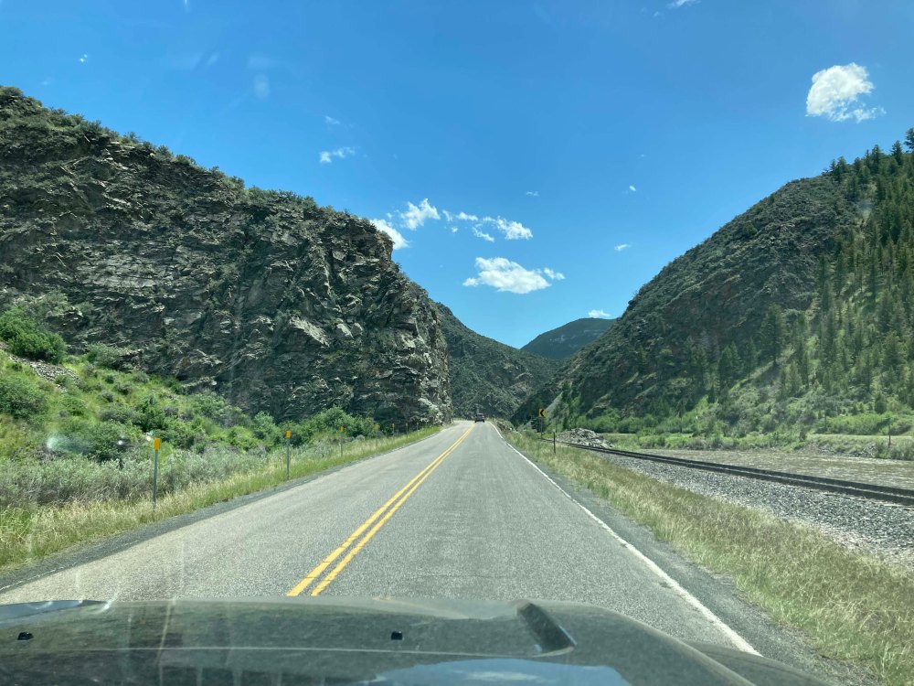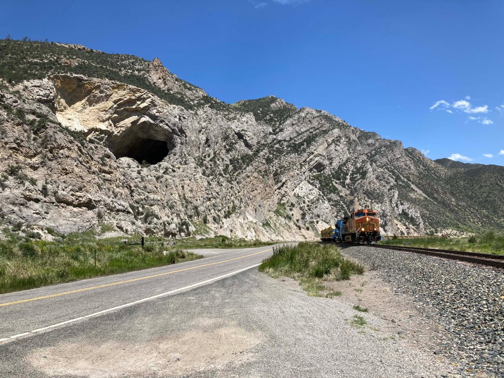 Once we hit Whitehall it had gotten a little monotonous though, so Lee put the town of Pony in the GPS and we found a short cut which skipped three forks. I am so glad he did because we found ourselves on a cool two lane highway along a railroad track. It was really pretty and best of all we saw a huge cave above the track. I can totally see a gang of outlaws waiting there to rob the train. Yes I know I am romanticizing the Old West but it was pretty cool.