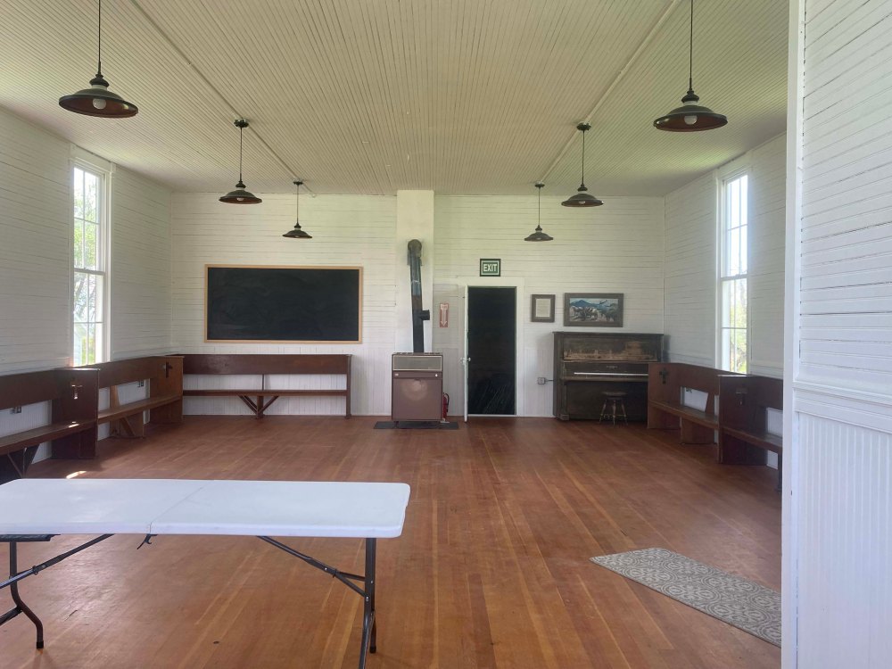 With the grizzly signs and the remoteness of the location I didn’t want to get out of site of the truck but it was pretty. The flowers have exploded here and there were tons in the meadow. We didn’t see any animals though (although we saw plenty of SCAT) and headed back to the truck and down to the school. It is a beautifully maintained building (used as a local meeting center) and we got out and walked around. The creek was pretty high here but wasn’t overflowing although part of a fence was washed away. We didn’t see any signs of serious flooding at all on our trip although water levels were definitely high.